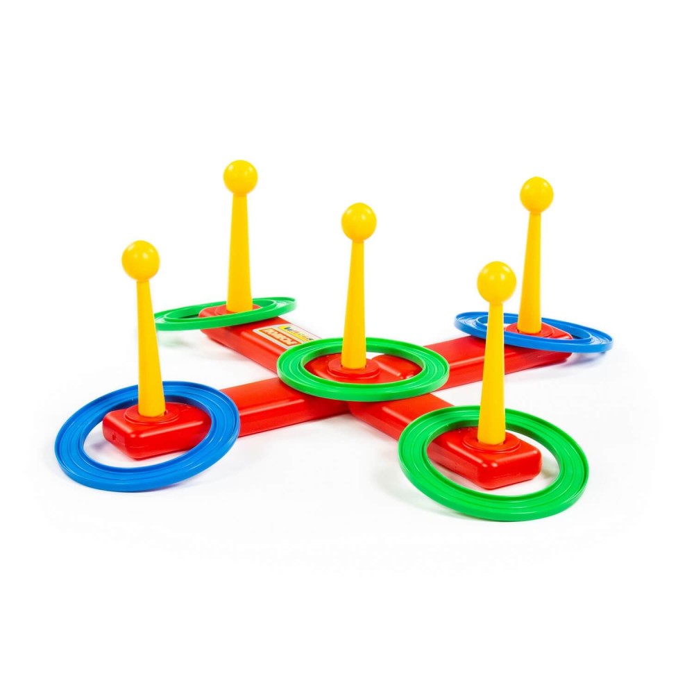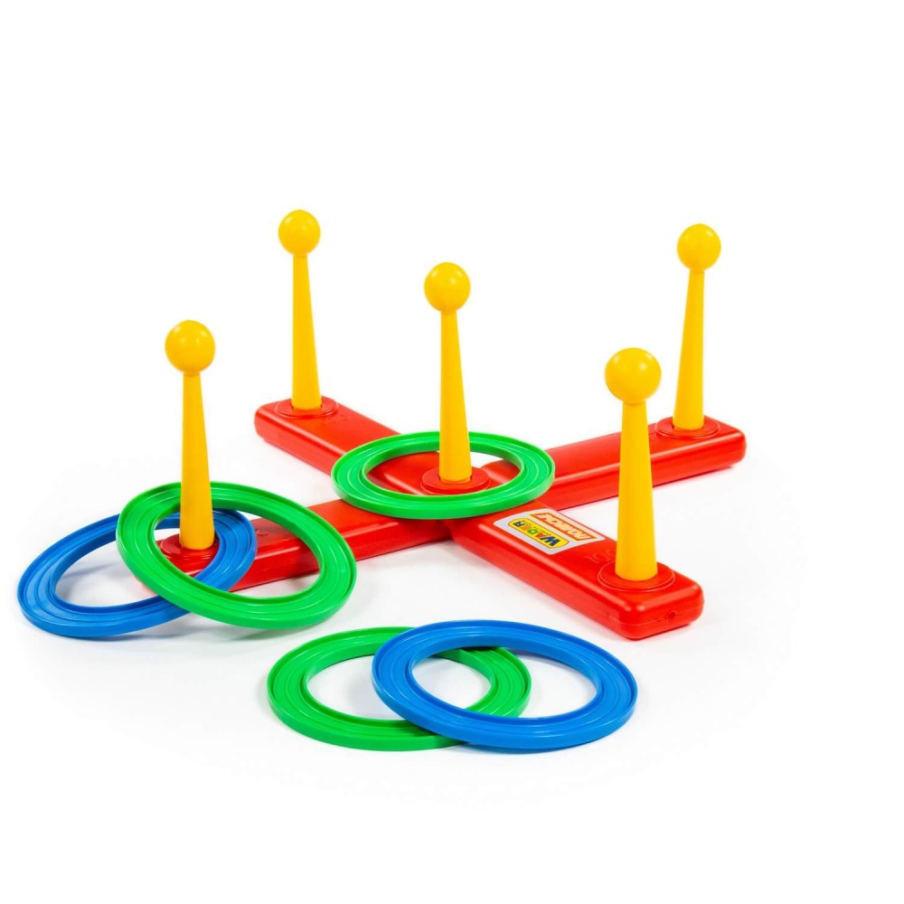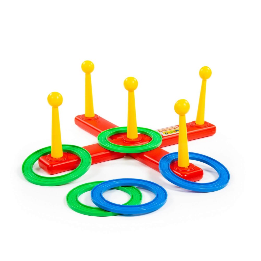Фабрика «Полесье» представляет игру «Набрось кольцо», которая создана для активного отдыха всей семьи. Конструкция представляет собой крестообразную площадку с пластмассовыми столбиками, на которые необходимо набросить большее количество колец (в наборе 5 штук). Игра выполнена из качественных материалов, имеет яркую расцветку. Кроме того, все элементы имеют округлую форму, что позволяет игрушке быть максимально безопасной для детей. Игра станет незаменимой во время проведения домашних чемпионатов!