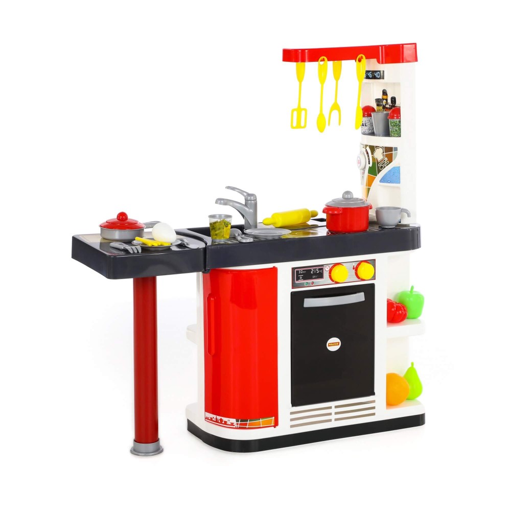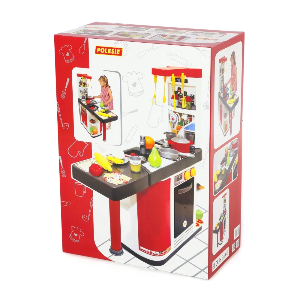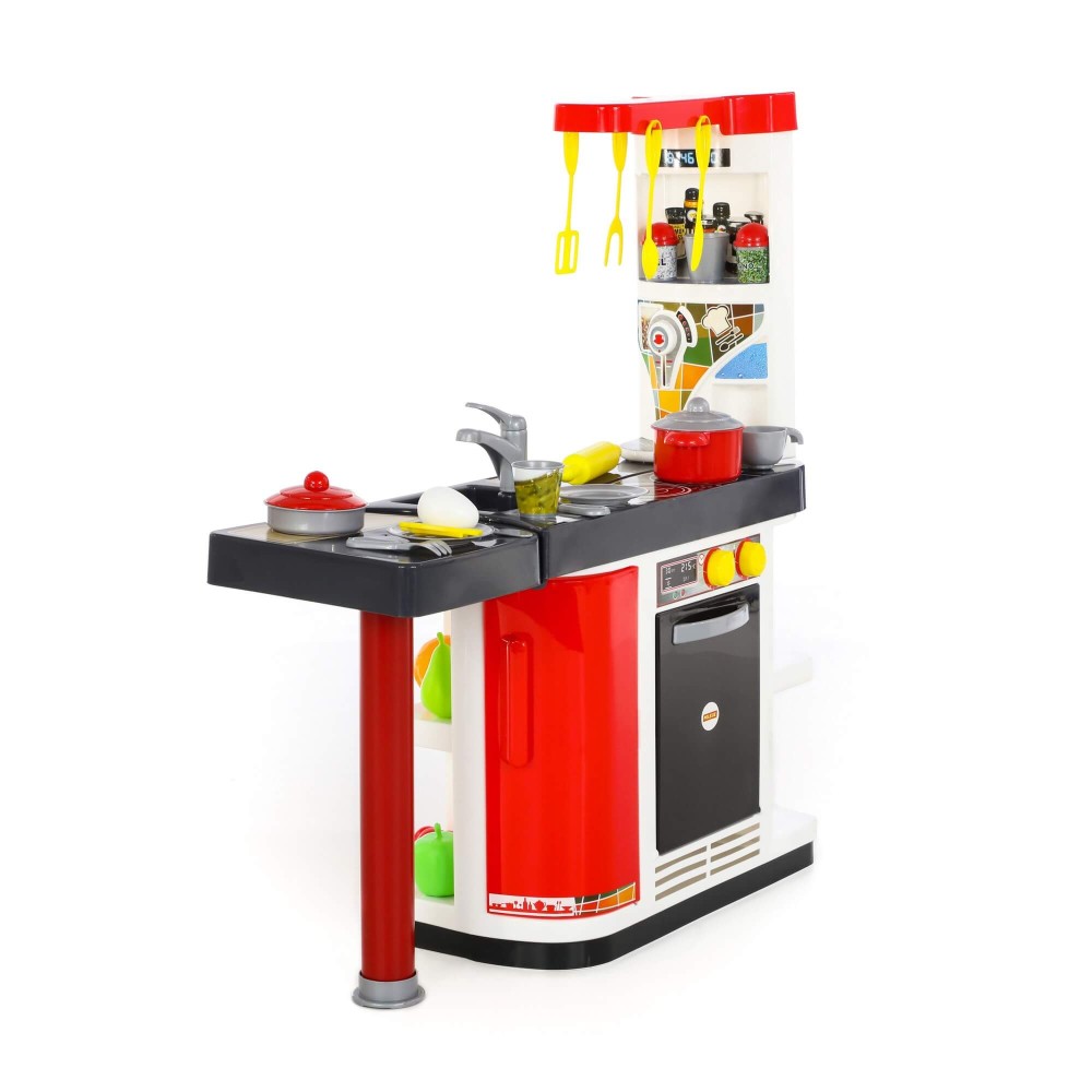Прекрасно укомплектованный игровой комплекс «Мастер Шеф» выполнен в красно-белом цвете. Столешница кухни многофункциональна и имеет две зоны: для приготовления пищи и для мытья посуды. На верхней части набора закреплена игрушечная вытяжка, которая делает кухню более реалистичной (тут даже располагаются крючки для приборов!). Конструкция имеет много полочек и ниш, что очень удобно для размещения элементов набора. Комплекс имеет встроенный прибор, которая имитирует машинку для приготовления кофе. Нижняя часть дополнена духовым шкафом, холодильником, а также шкафчиками для хранения продуктов. Чтобы игра с набором была интересной и реалистичной, в комплект входит посуда: