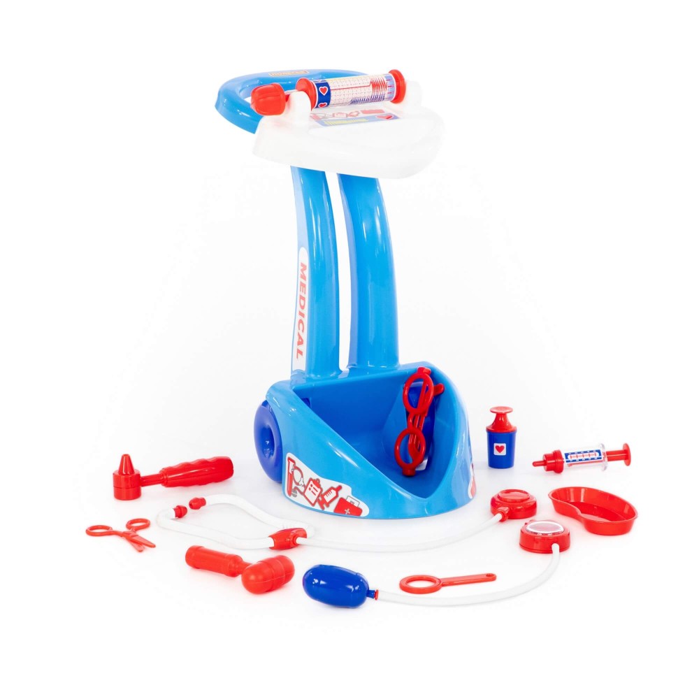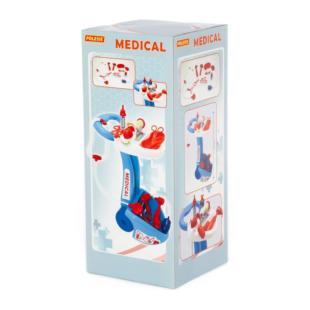 Набор "Доктор №10" от фабрики «Полесье» представлен в виде игровой панели на тележке. Он мобилен и удобен в перемещении, благодаря этому малыш сможет быстро оказать помощь своим пациентам. В этом ему помогут ножницы, очки, лупа, шприц, лоток для инструментов, стетоскоп (для прослушивания сердца и лёгких), тонометр (для измерения давления), отоскоп (инструмент лор-врача), кардиограф, молоточек и баночка с крышкой. Возможно, именно с этого набора у будущего врача начнется любовь к медицине.