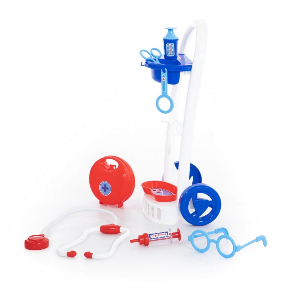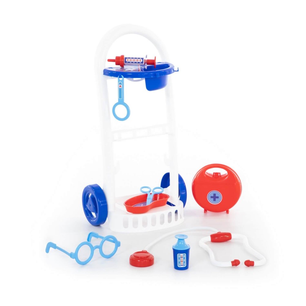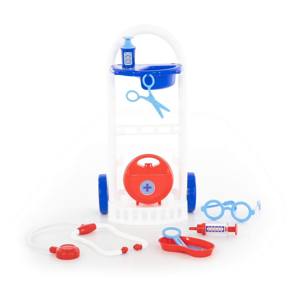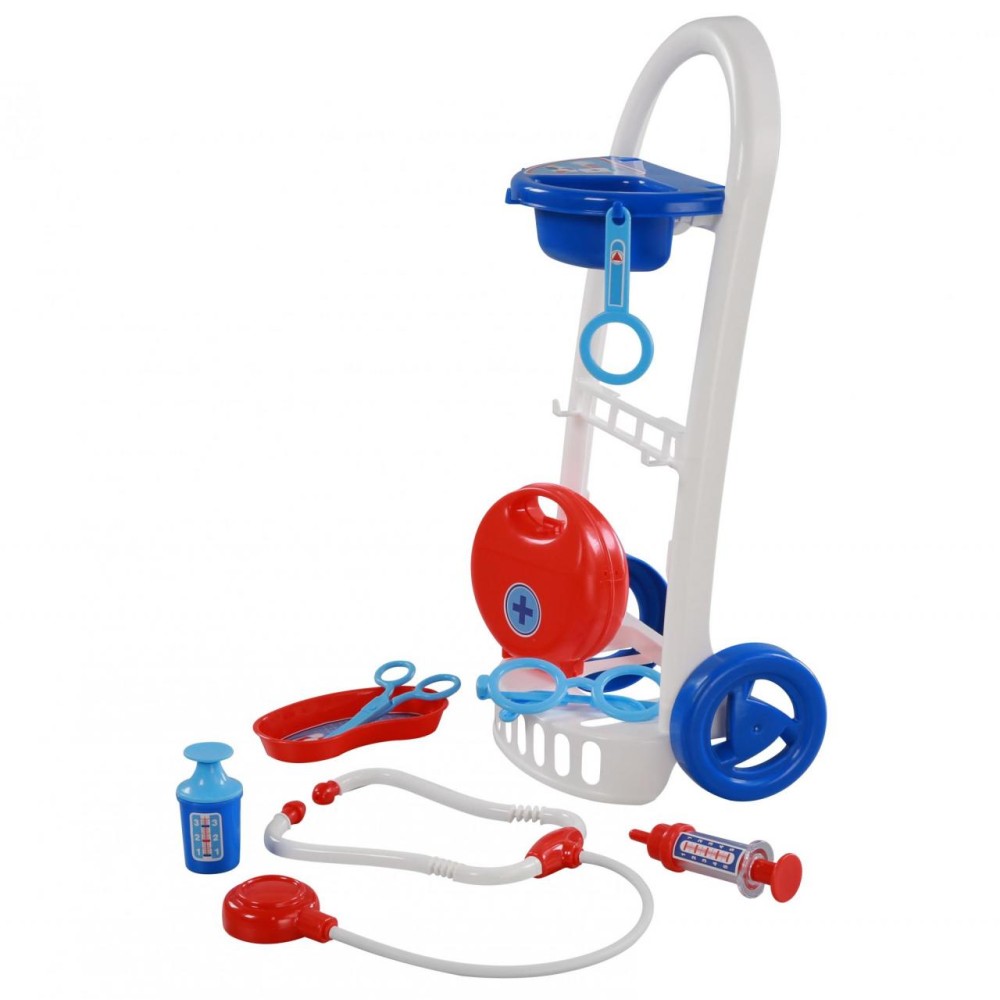 Набор "Доктор №11" от фабрики «Полесье» на тележке мобилен и удобен в перемещении, благодаря этому малыш сможет быстро оказать помощь своим пациентам. В этом ребёнку помогут безопасные игрушечные принадлежности: ножницы, очки, лупа, шприц, лоток для инструментов, стетоскоп (для прослушивания сердца и лёгких), баночка с крышечкой, медицинский чемоданчик. Возможно, именно с этого набора у будущего врача начнется любовь к медицине.