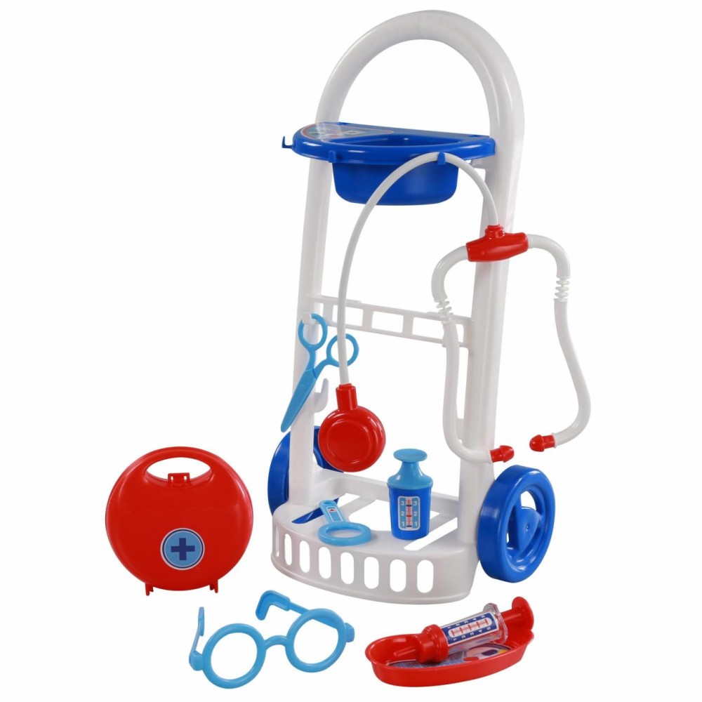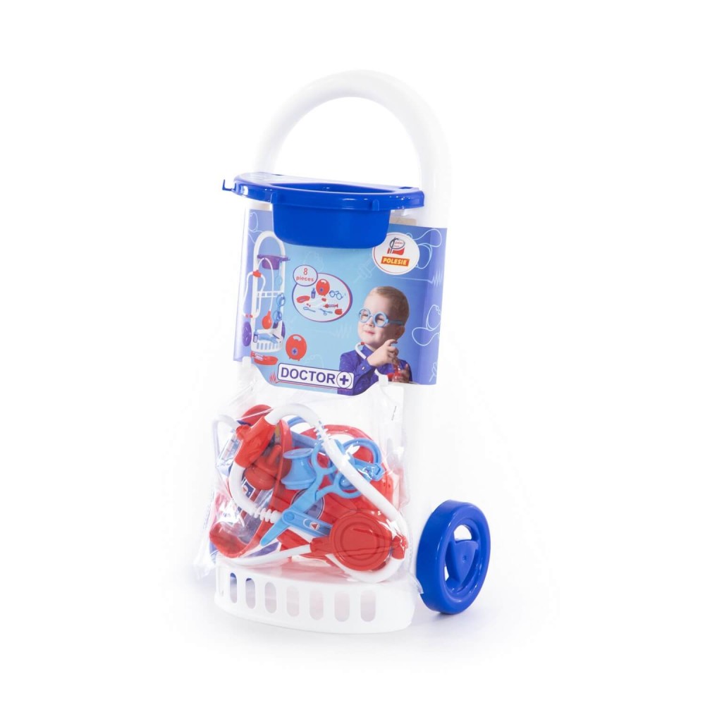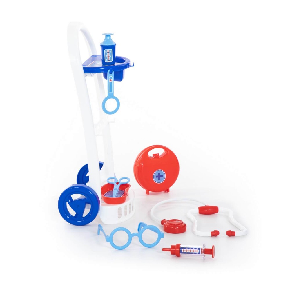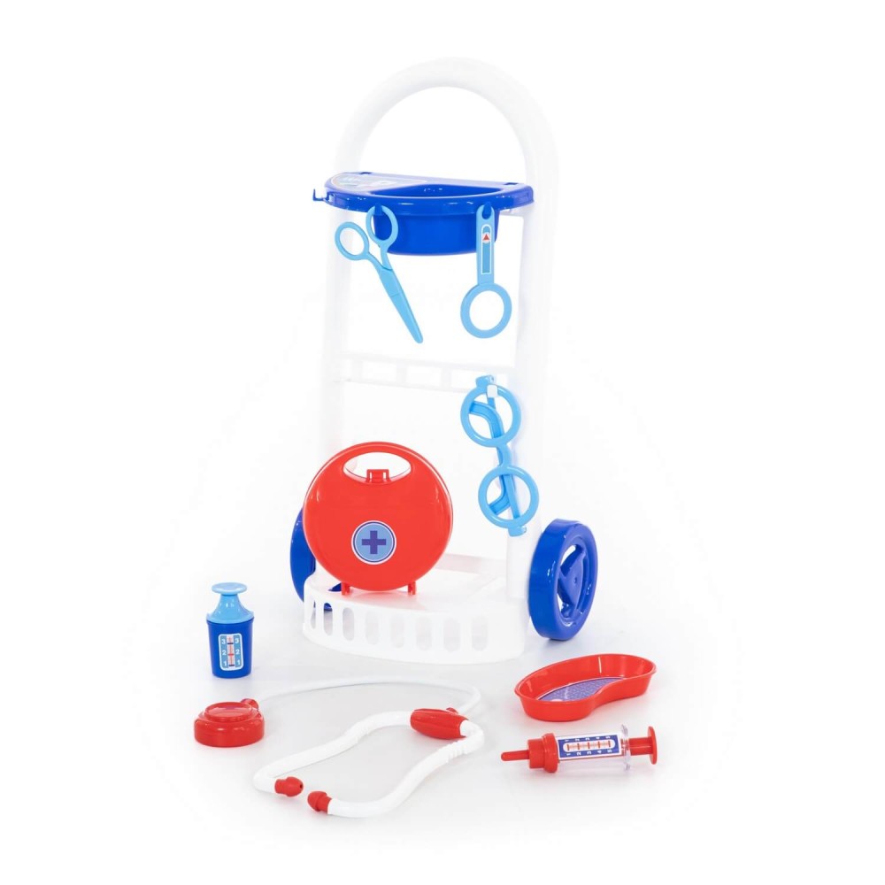 Набор "Доктор №11" от фабрики «Полесье» на тележке мобилен и удобен в перемещении, благодаря этому малыш сможет быстро оказать помощь своим пациентам. В этом ребёнку помогут безопасные игрушечные принадлежности: ножницы, очки, лупа, шприц, лоток для инструментов, стетоскоп (для прослушивания сердца и лёгких), баночка с крышечкой, медицинский чемоданчик. Возможно, именно с этого набора у будущего врача начнется любовь к медицине.