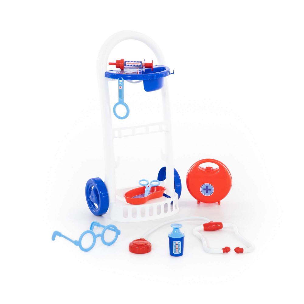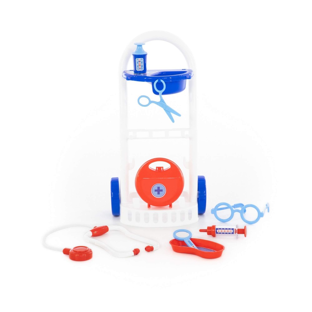 Набор "Доктор №11" (в коробке) от фабрики «Полесье» на тележке мобилен и удобен в перемещении, благодаря этому малыш сможет быстро оказать помощь своим пациентам. В этом ребёнку помогут безопасные игрушечные принадлежности: ножницы, очки, лупа, шприц, лоток для инструментов, стетоскоп (для прослушивания сердца и лёгких), баночка с крышечкой, медицинский чемоданчик. Возможно, именно с этого набора у ребёнка проснётся интерес к профессии врача.