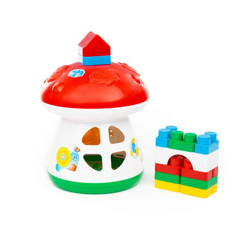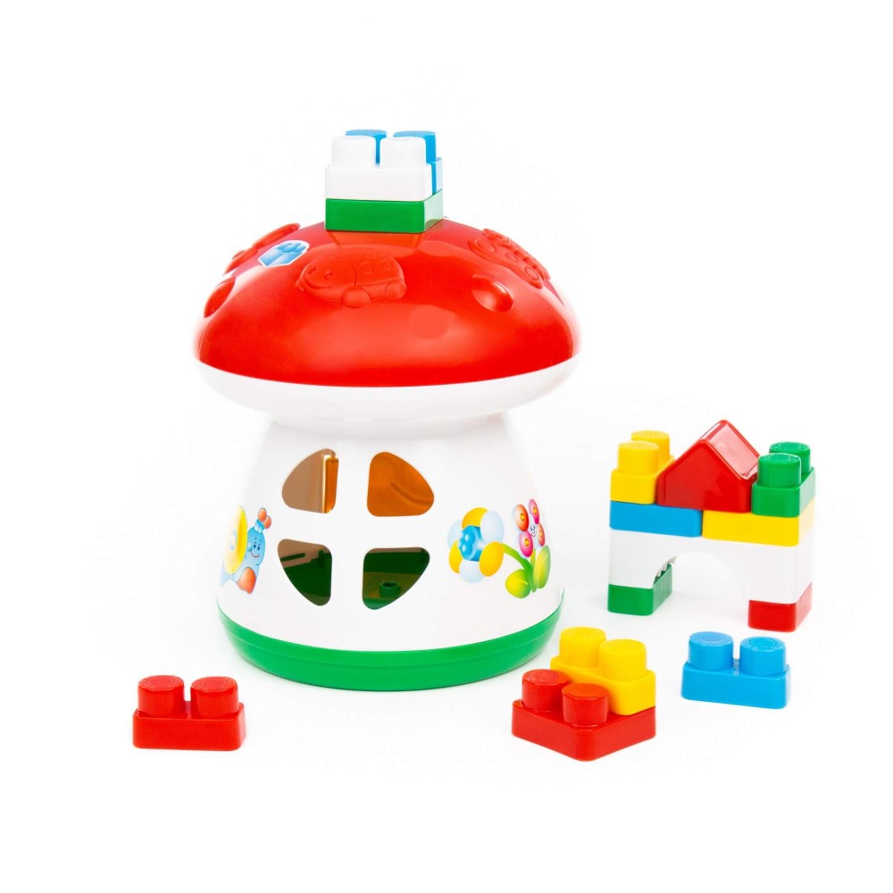 По лицензии Molto y Cia, S.A. (Испания)Игровой центр выполнен в форме гриба. На его шляпке расположено крепление для конструктора, который входит в набор. Игра с конструктором тренирует мелкую моторику рук ребёнка, развивает конструкторские способности малыша. На ножке гриба имеется дверца с забавным личиком, открыв её ребёнок найдёт место, куда можно складывать конструктор. Это упрощает хранение игрового набора.