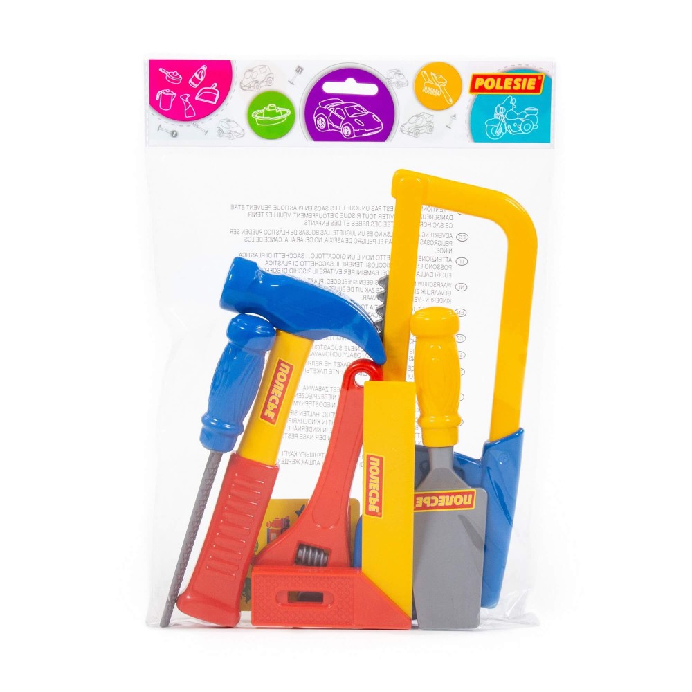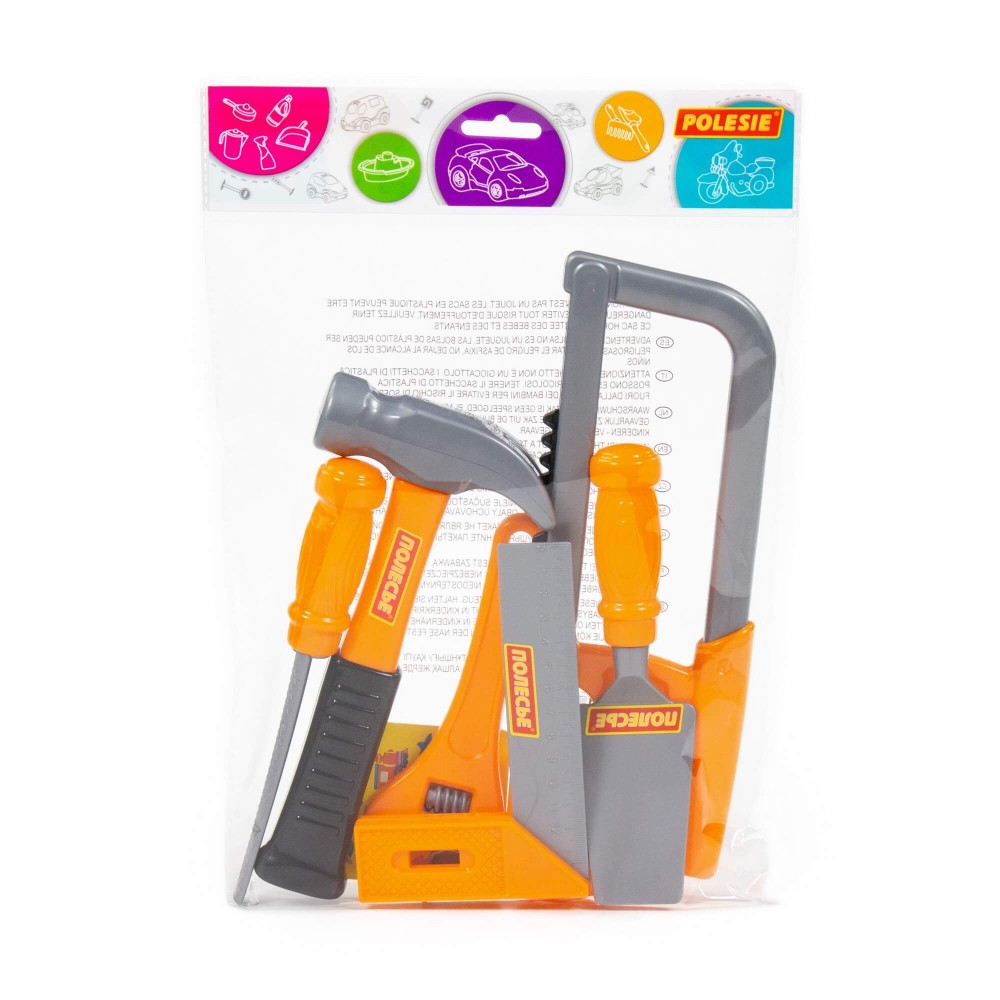 Наборы инструментов, производимые компанией «Полесье», могут использоваться как для проведения групповых занятий в дошкольных учреждениях, так и для самостоятельной игры ребёнка. Все инструменты набора функционально идентичны взрослым аналогам и позволяют развивать мелкую моторику и координацию ребёнка: ловкость и гибкость пальцев и кистей, точность движений. Набор инструментов помогает познакомить детей с основными особенностями взаимодействия отдельных частей и деталей, развивает пространственное воображение. Комплект включает в себя: