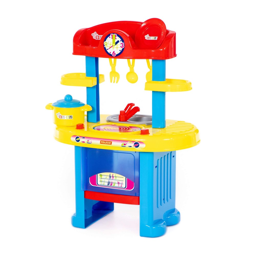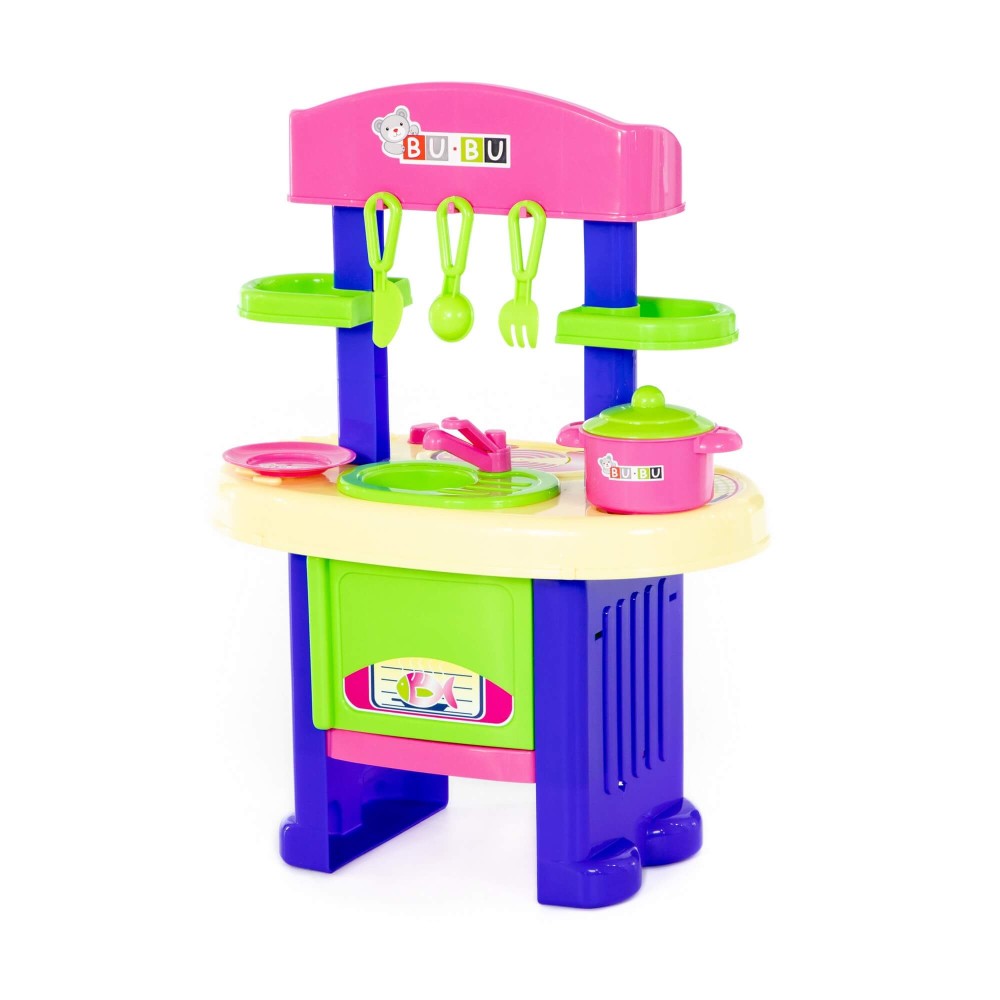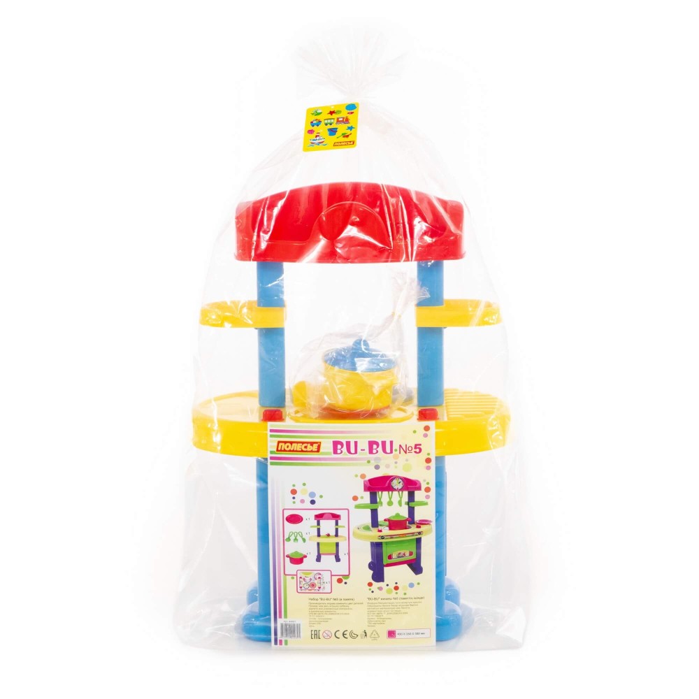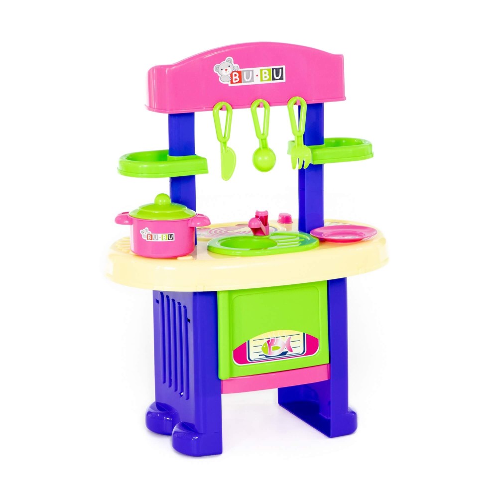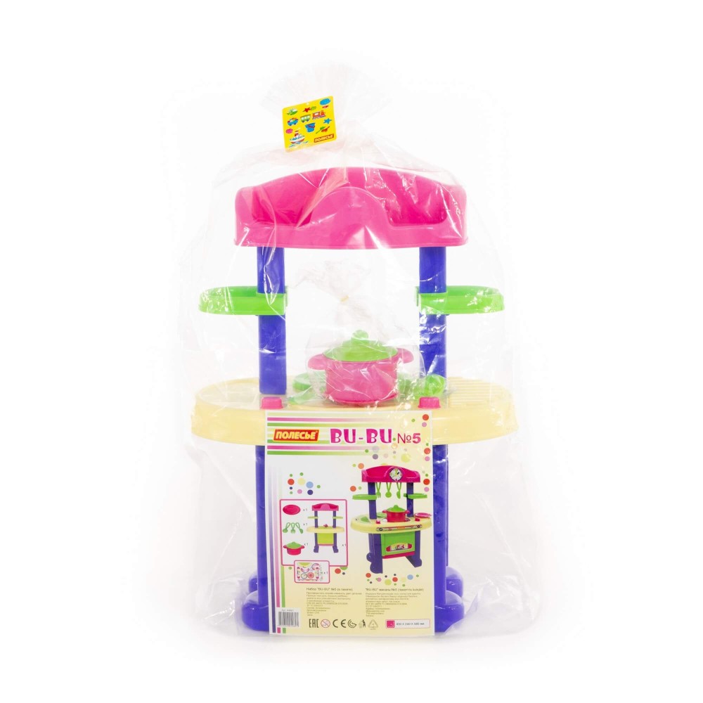 Игровой комплекс "BU-BU" №5 представляет собой маленькую кухню с плитой, мойкой и духовым шкафом. Также имеются две полочки, на которых могут храниться игрушечные продукты. Набор дополнен игрушечной посудой: