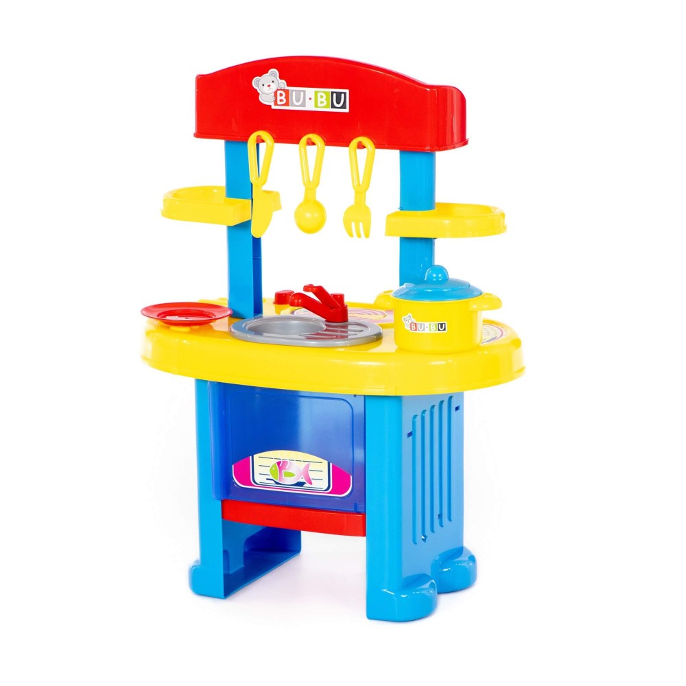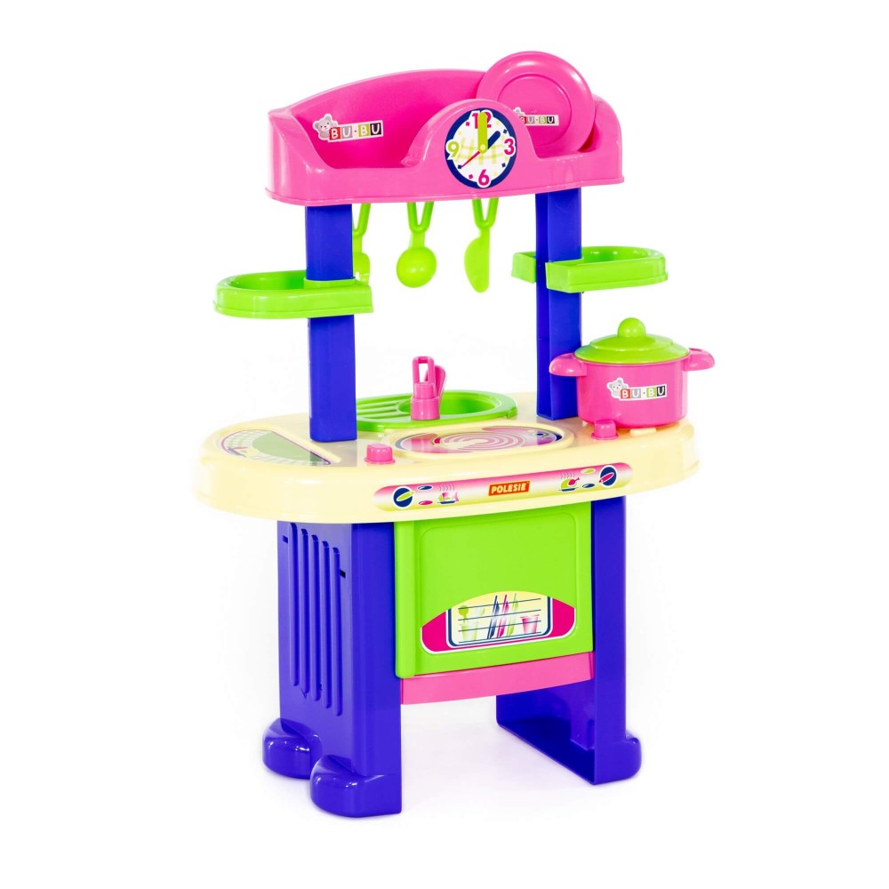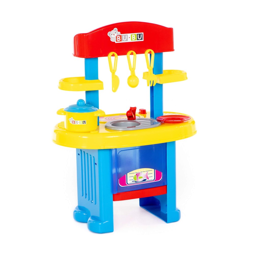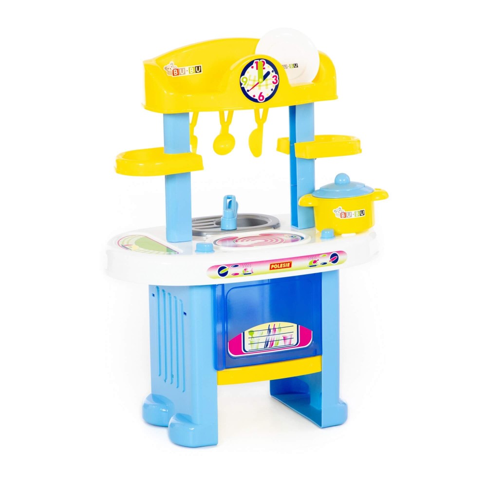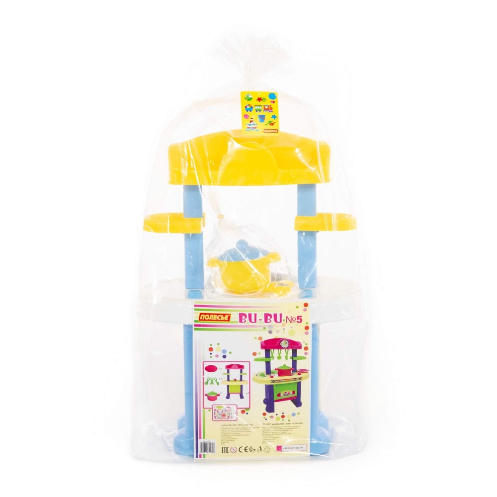 Игровой комплекс "BU-BU" №5 представляет собой маленькую кухню с плитой, мойкой и духовым шкафом. Также имеются две полочки, на которых могут храниться игрушечные продукты. Набор дополнен игрушечной посудой: