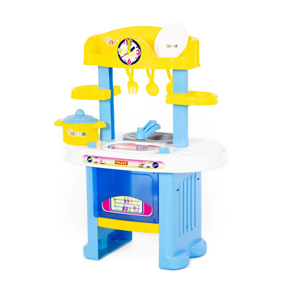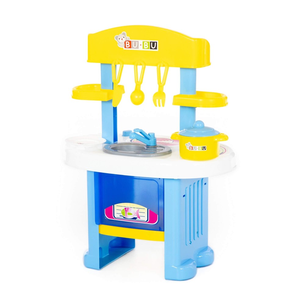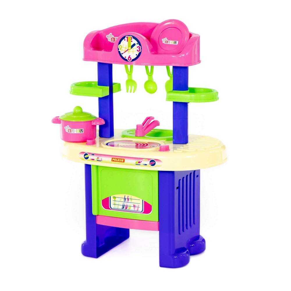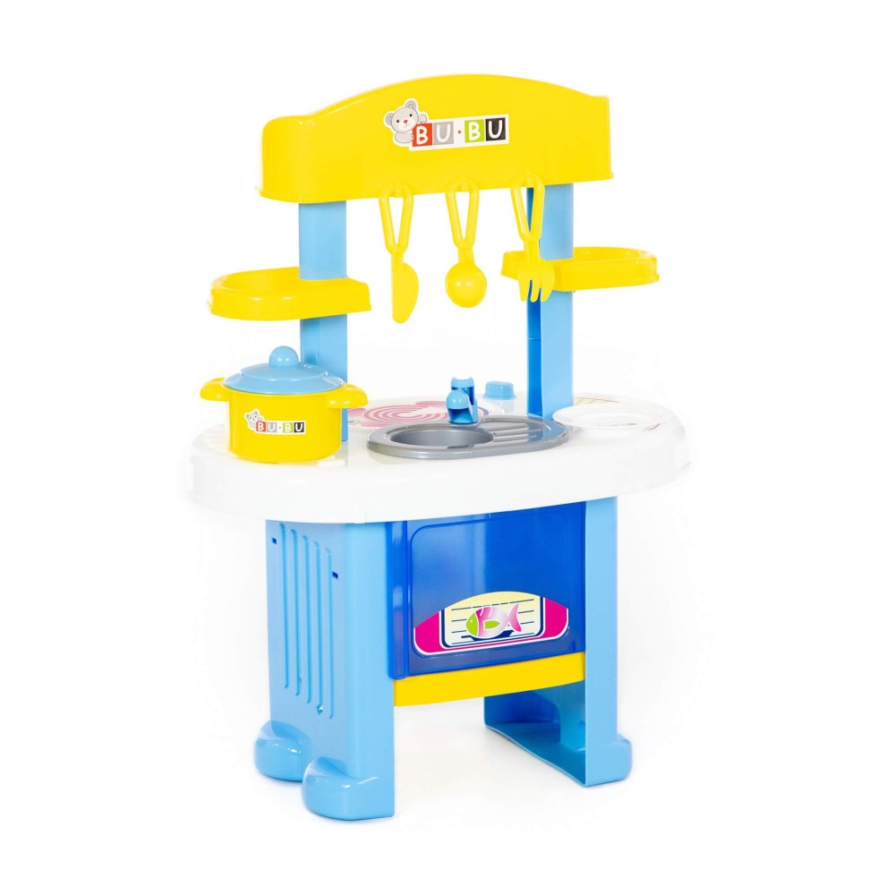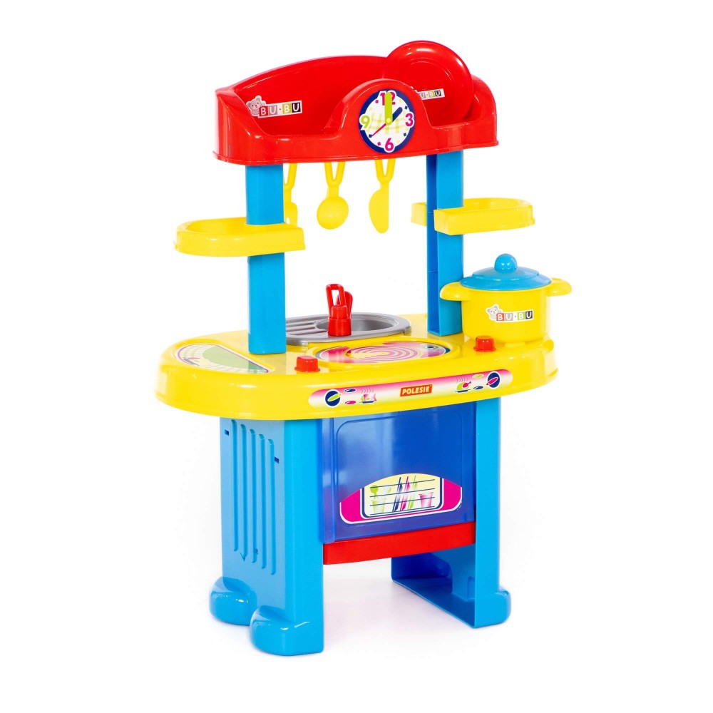 Игровой комплекс "BU-BU" №5 представляет собой маленькую кухню с плитой, мойкой и духовым шкафом. Также имеются две полочки, на которых могут храниться игрушечные продукты. Набор дополнен игрушечной посудой: