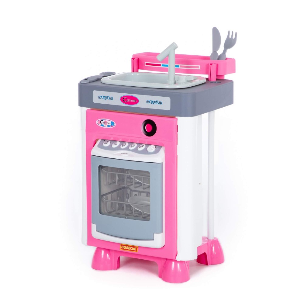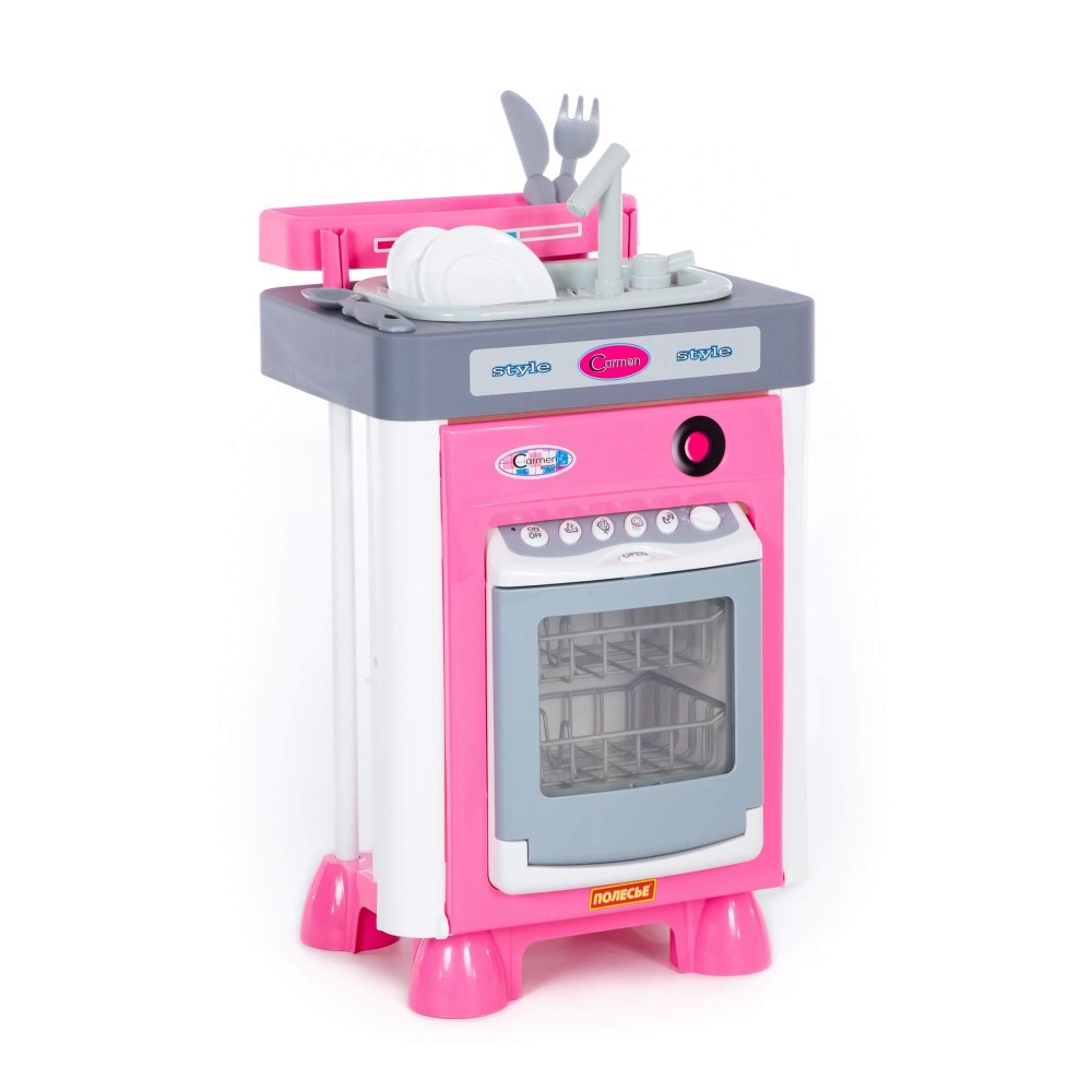 - посудомоечная машина со звуковыми эффектами (Реалистичность работы данного игрового элемента достигается за счёт специального резервуара для воды, расположенного в дверке посудомоечной машины. В рабочем режиме машинки вода разбрызгивается между двумя прозрачными стенками дверки и создается эффект реального мытья. На самом деле игрушечная посуда остается сухой.);