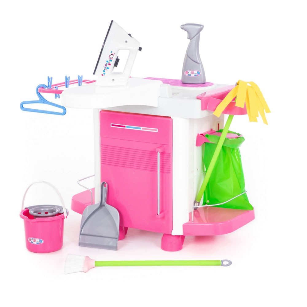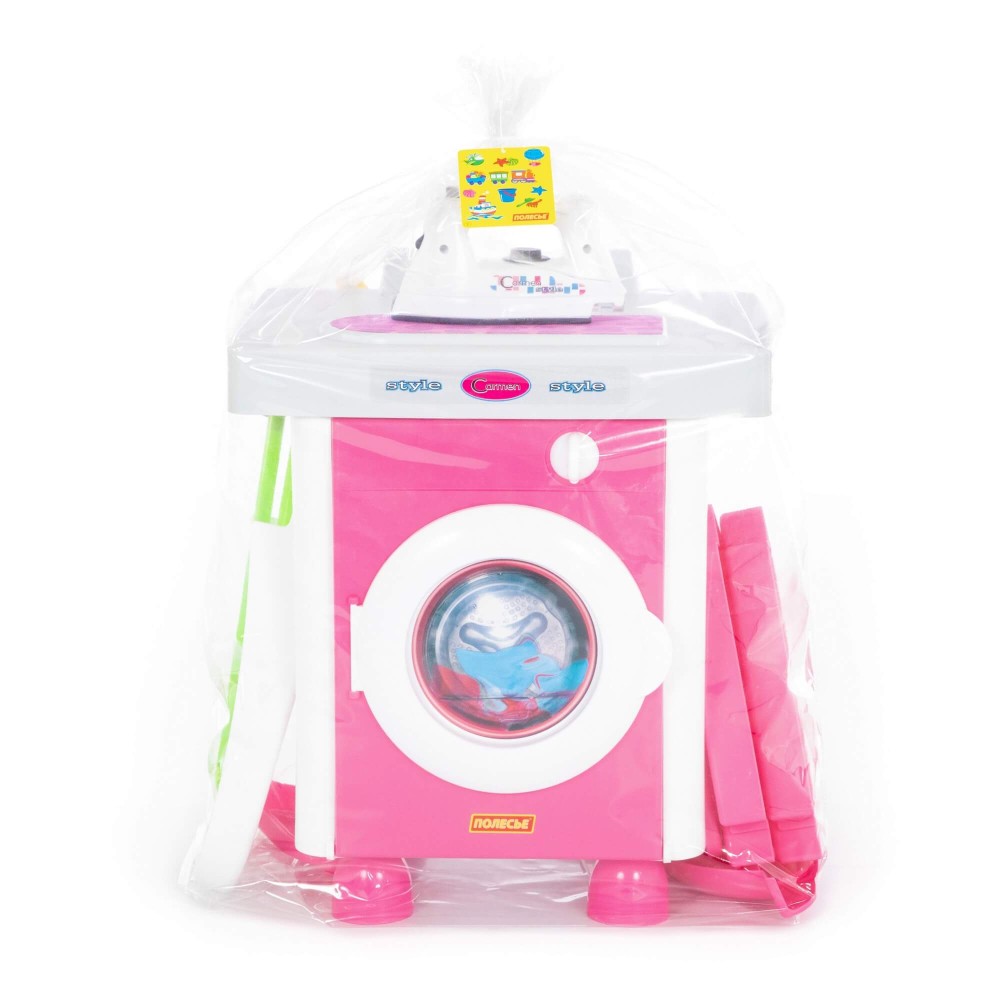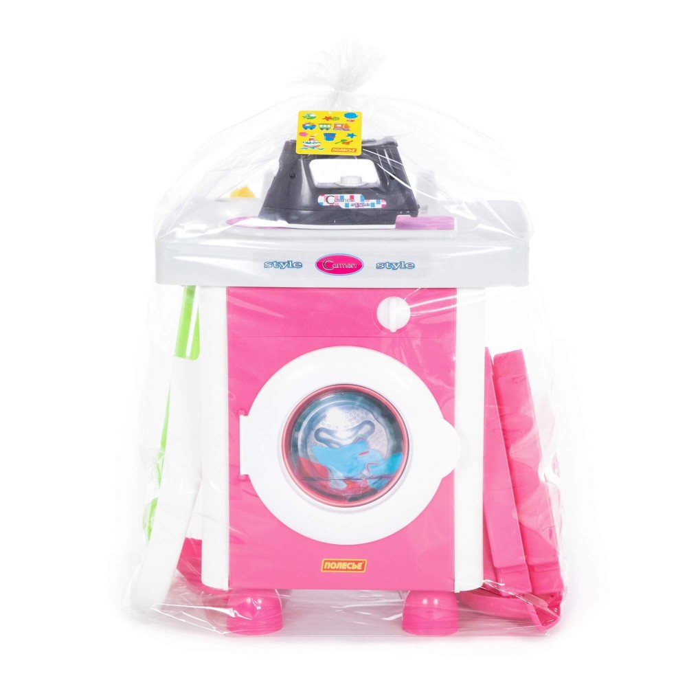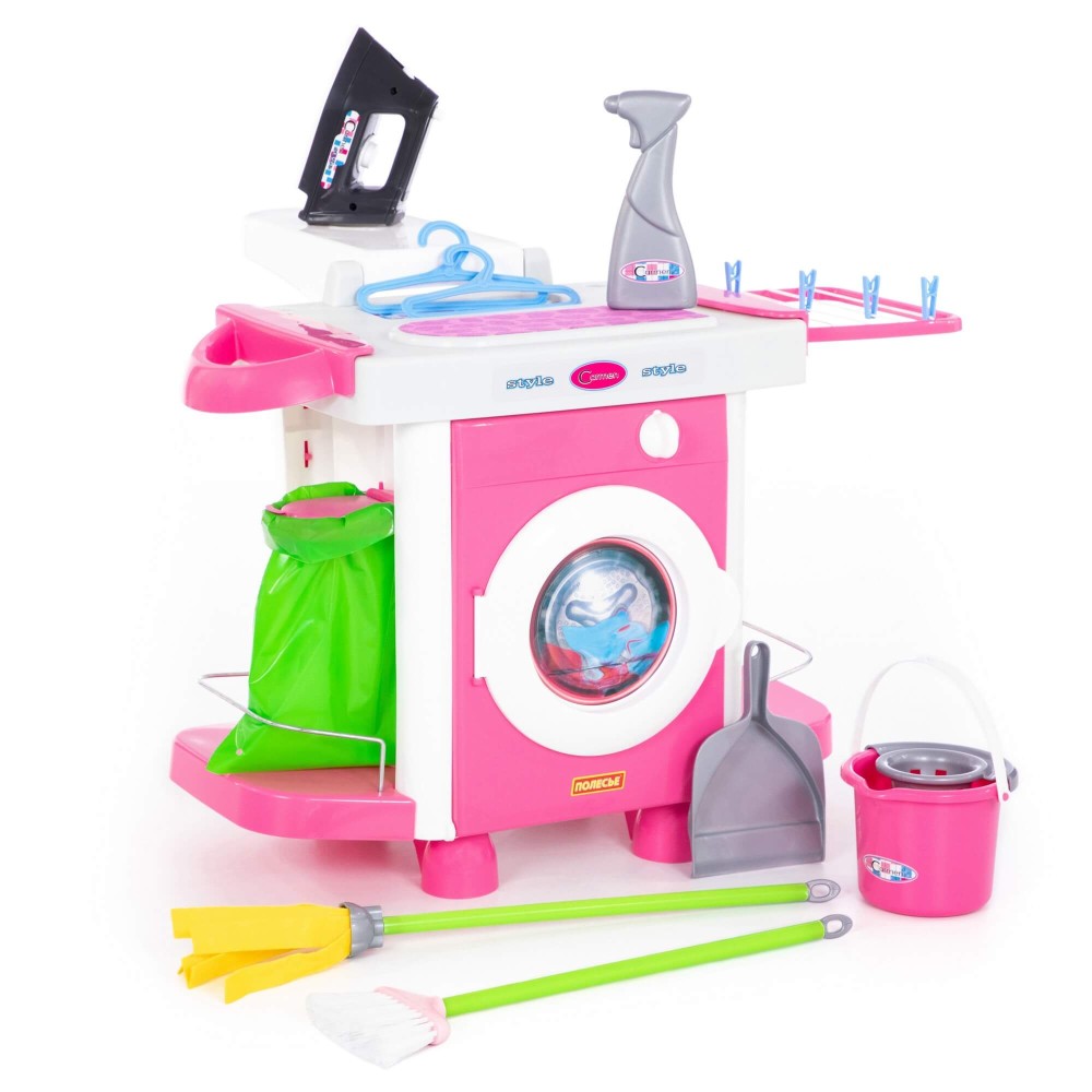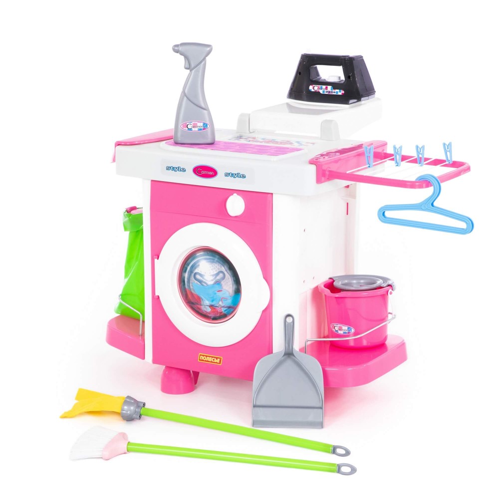 Набор «Carmen» №5 с аксессуарами состоит из одного модуля. И включает в себя: стиральную машину, утюг, сушилку, гладильную доску, инвентарь для уборки. Все элементы набора максимально реалистичны и имитируют приборы бытовой техники и аксессуаров. С одной стороны модуля – стиральная машина, которая имеет нишу для загрузки одежды. С другой - шкафчик с полочками: для хранения инвентаря и уже "постиранного" белья. Ребёнок сможет понарошку устроить стирку и сушить вещи на специальной сушилке. В дополнение в наборе предусмотрены: бельевая верёвка, прищепки (4 шт.) и вешалки (2 шт.). Наверху стиральной машины - гладильный стол с выносной гладильной доской. Особенно понравится детям утюг, который работает от трёх пальчиковых батареек. Если нажать на кнопочку в основании утюга, то прибор светится и имитирует звук отпаривания. Разнообразит игру маленьких помощников инвентарь для уборки: ведёрко с отжимом, швабра, щётка, совочек, пакет для сбора мусора. Набор воспитывает у детей чувство самостоятельности, приучает к порядку, развивает воображение, координацию, моторику рук.