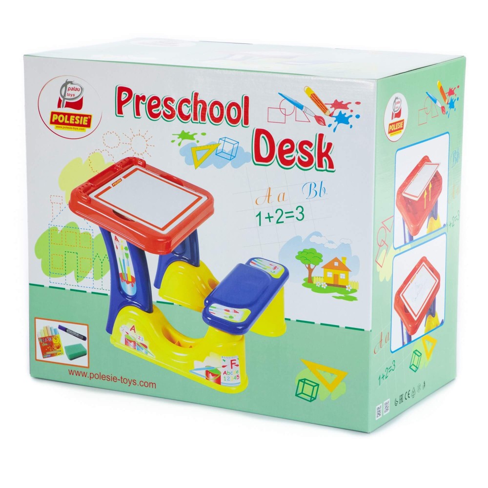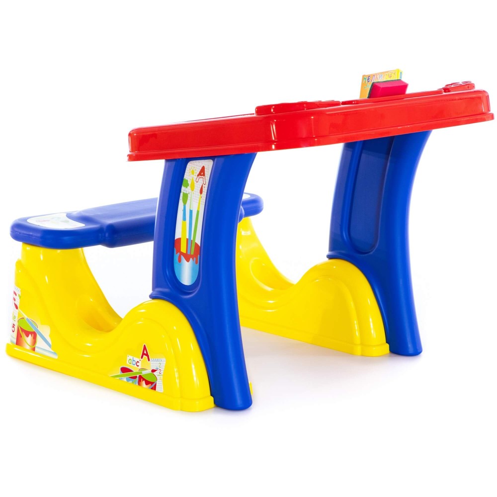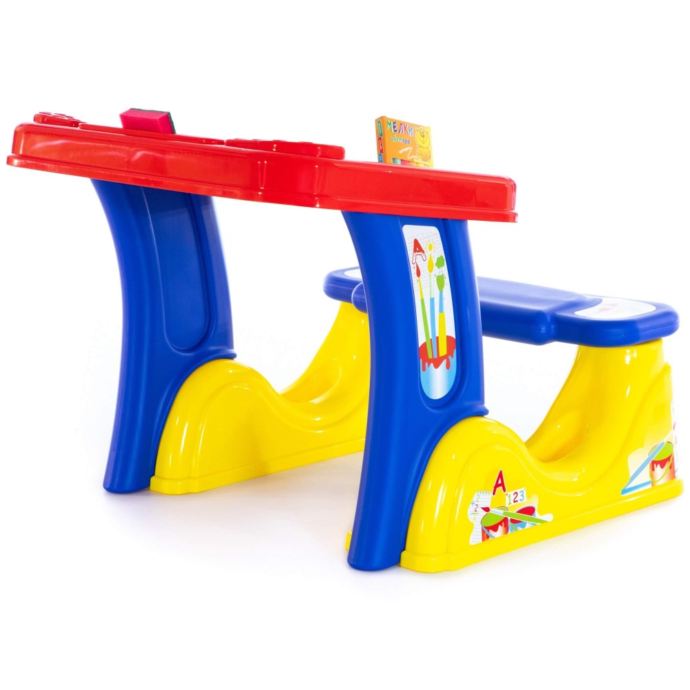 Парта соединена со скамейкой. Поверхность стола – съемная пластиковая панель, под которой находится органайзер для канцелярских принадлежностей. С одной стороны панели можно писать стирающимся маркером, с другой - мелками. Мелки, маркер и губка входят в комплект.