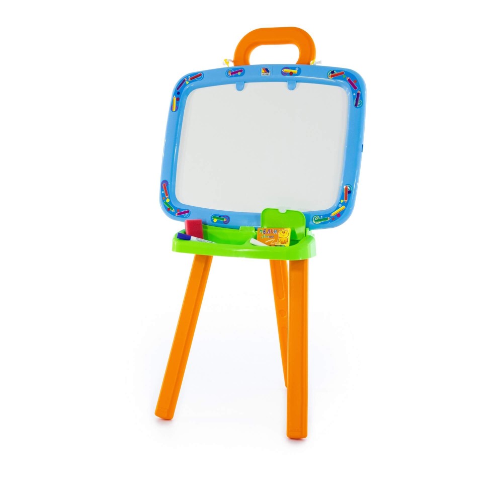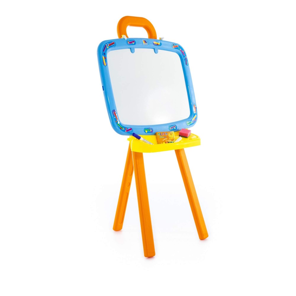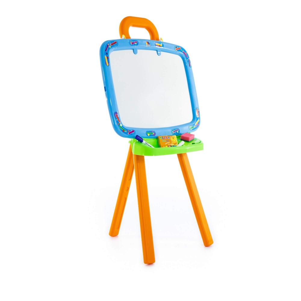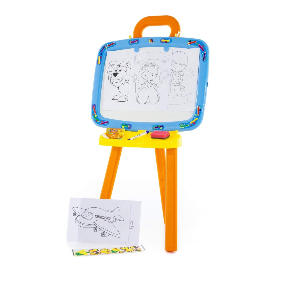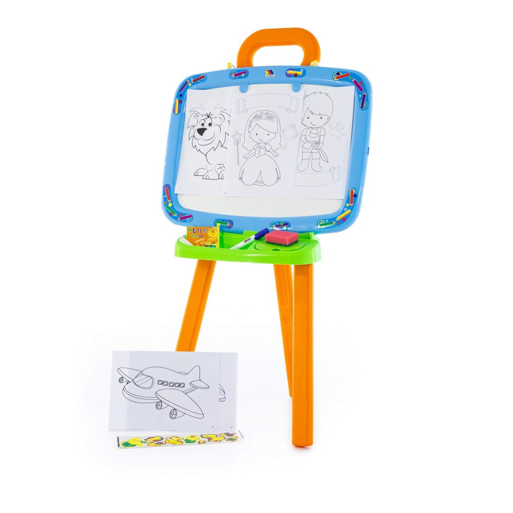 Доска для рисования двусторонняя: одна сторона предназначена для рисования мелками, другая – стирающимся маркером. Доску можно повесить на стену. В комплект входят: мелки, маркер, губка, 6 листов раскраски. Для лучшей устойчивости, в ножки подставки можно налить воду или насыпать песок, как показано в инструкции.