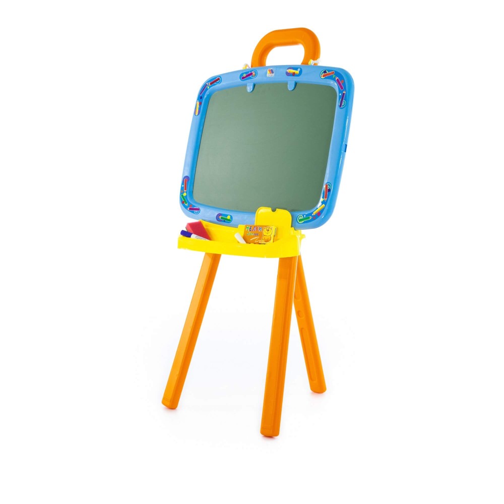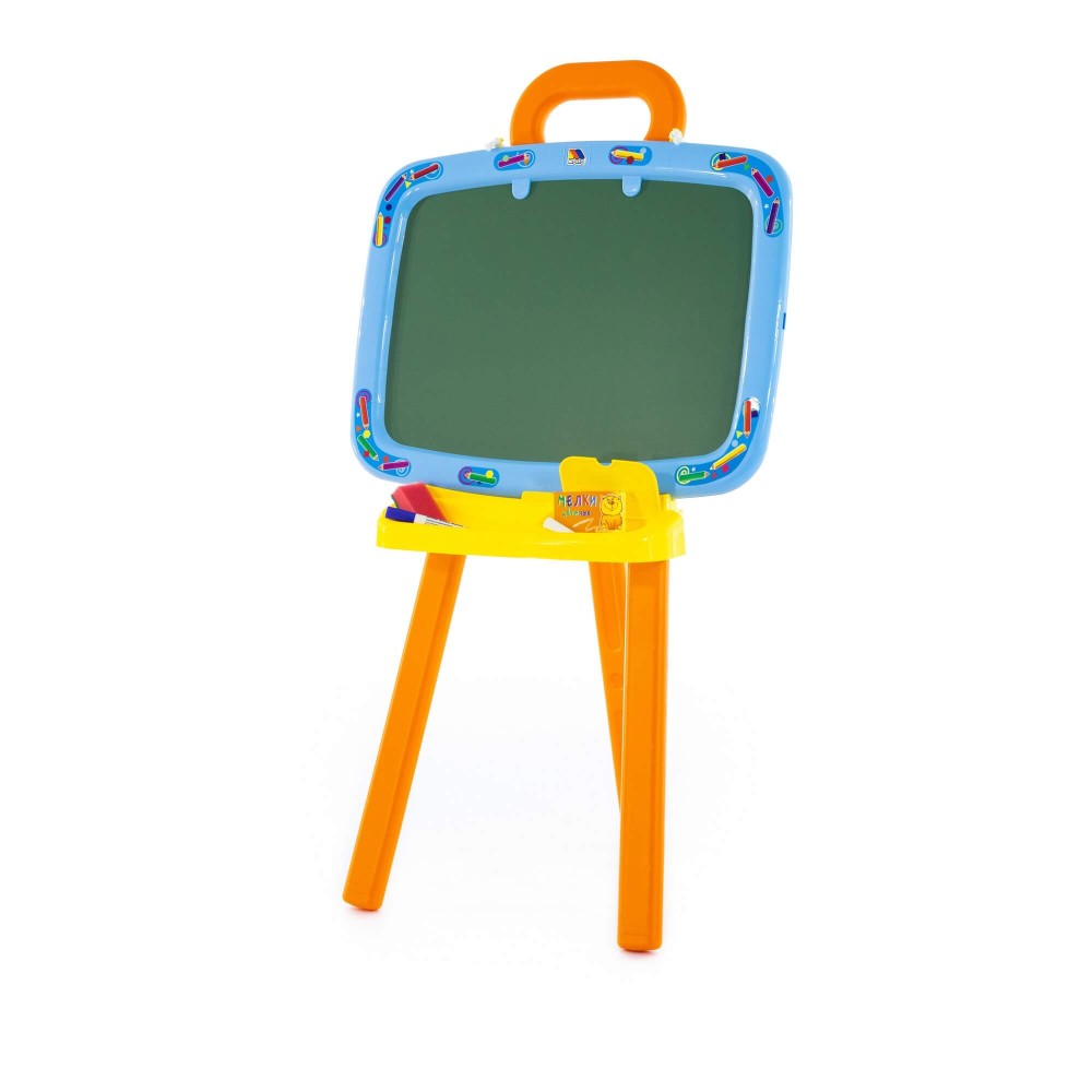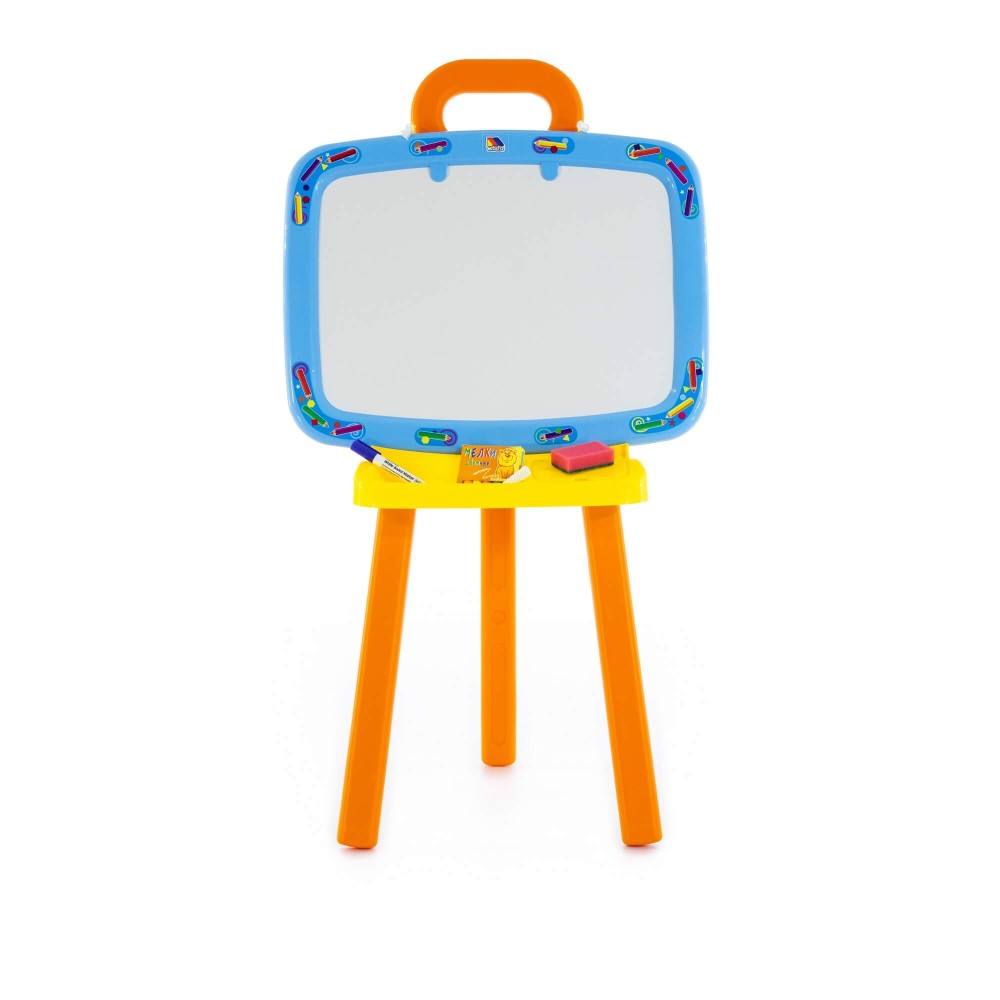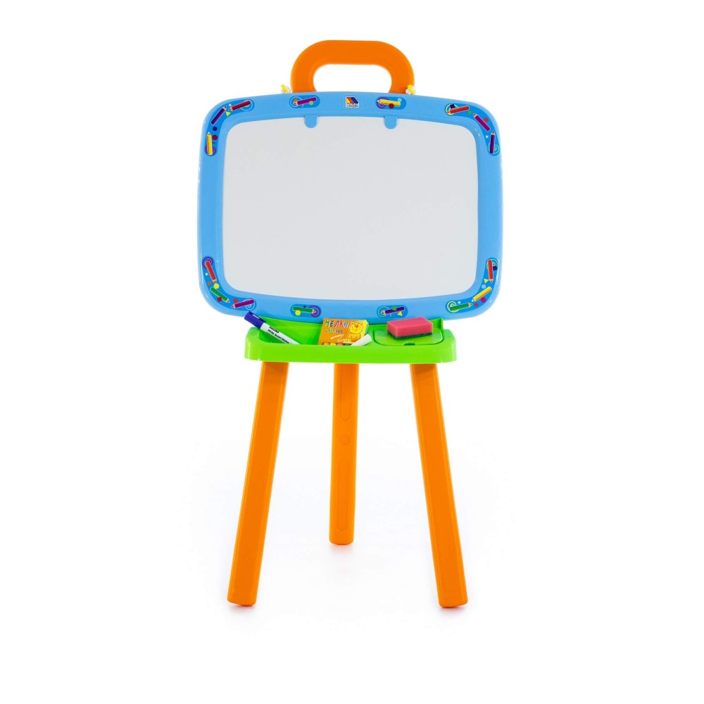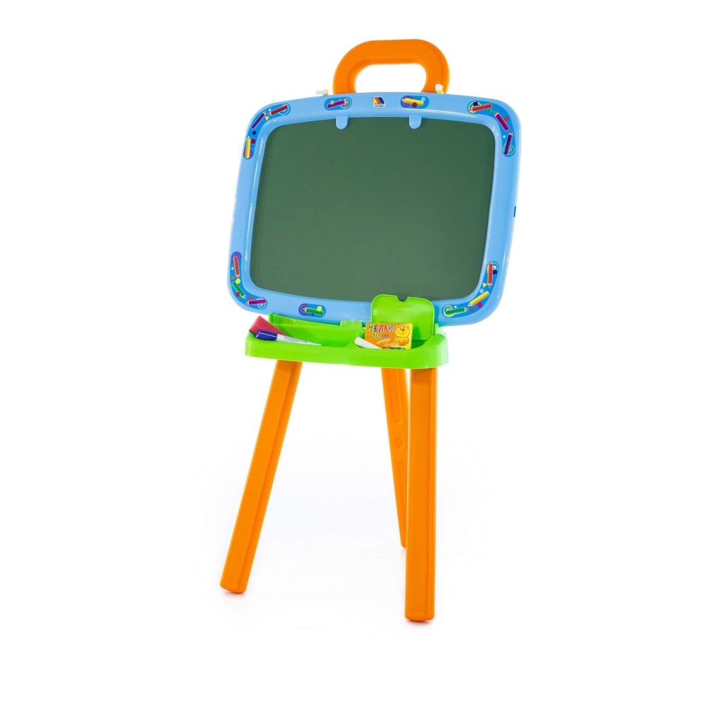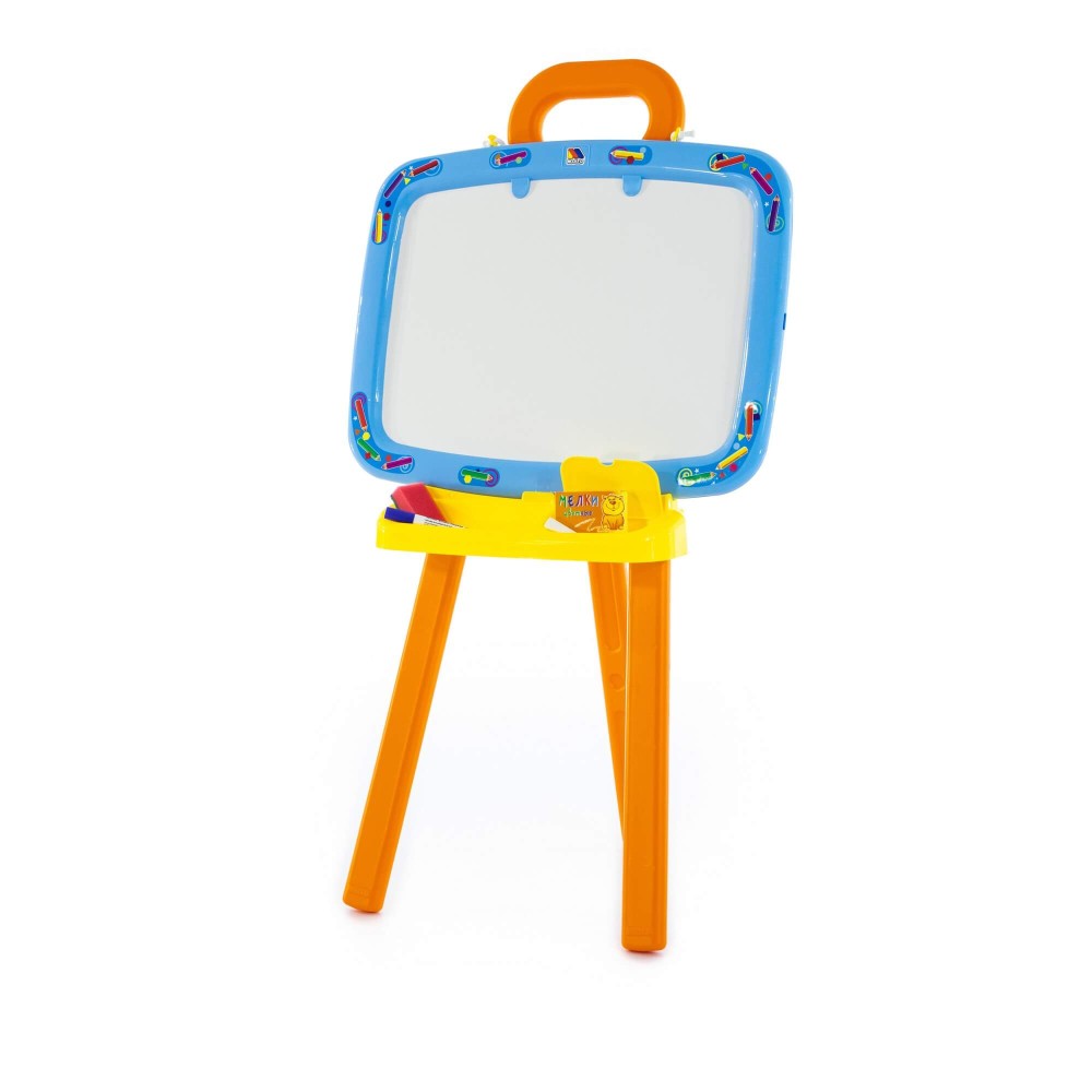 Доска для рисования двусторонняя: одна сторона предназначена для рисования мелками, другая – стирающимся маркером. Доску можно повесить на стену. В комплект входят: мелки, маркер, губка, 6 листов раскраски. Для лучшей устойчивости, в ножки подставки можно налить воду или насыпать песок, как показано в инструкции.