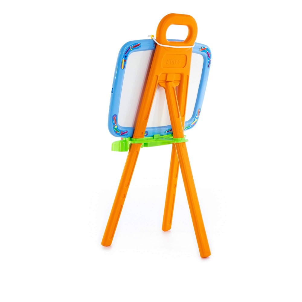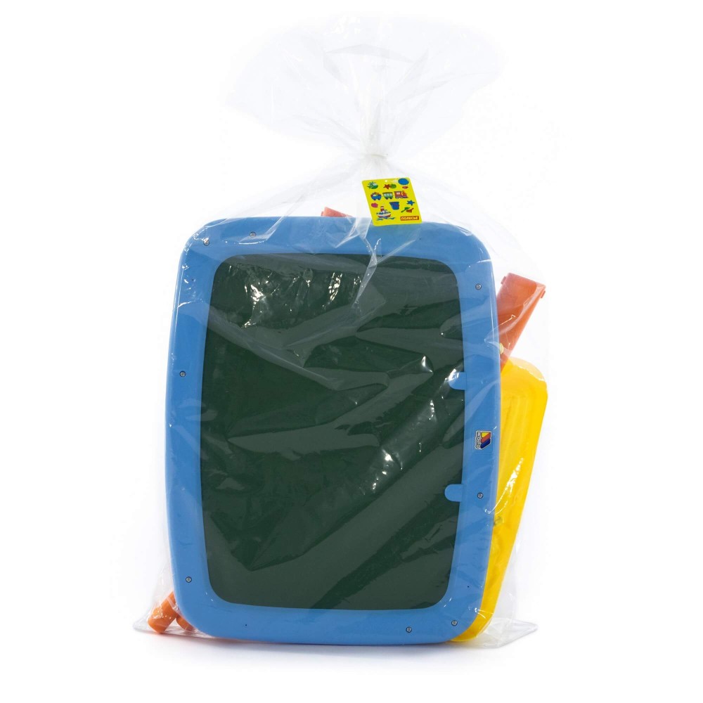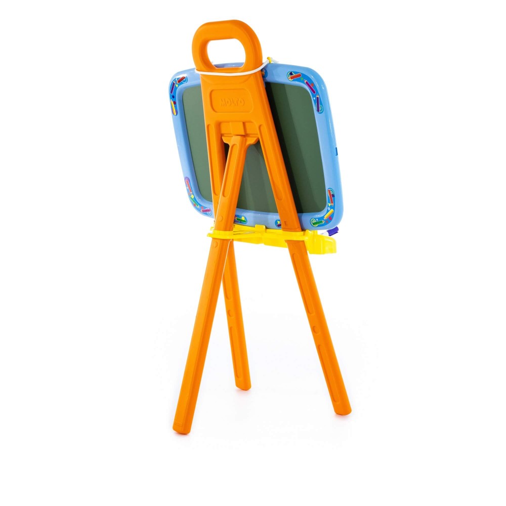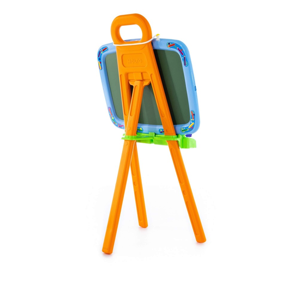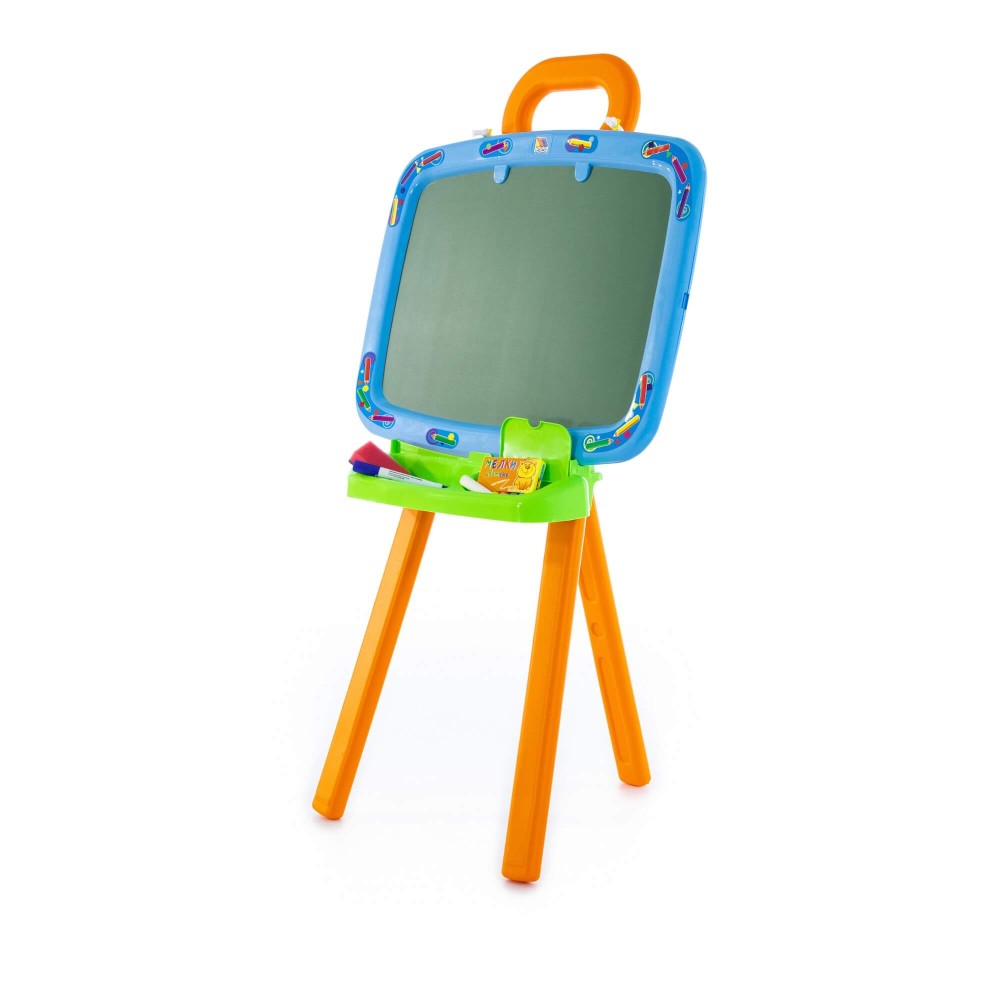 Доска для рисования двусторонняя: одна сторона предназначена для рисования мелками, другая – стирающимся маркером. Доску можно повесить на стену. В комплект входят: мелки, маркер, губка, 6 листов раскраски. Для лучшей устойчивости, в ножки подставки можно налить воду или насыпать песок, как показано в инструкции.