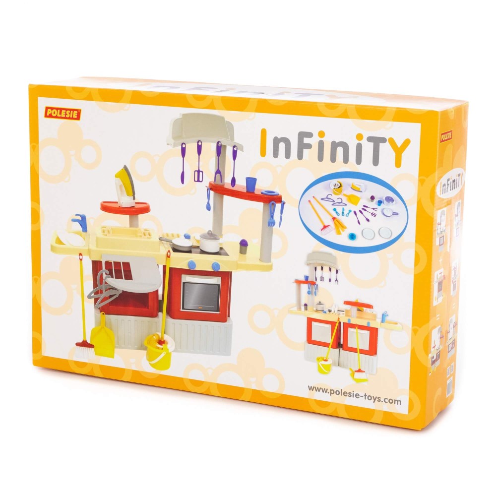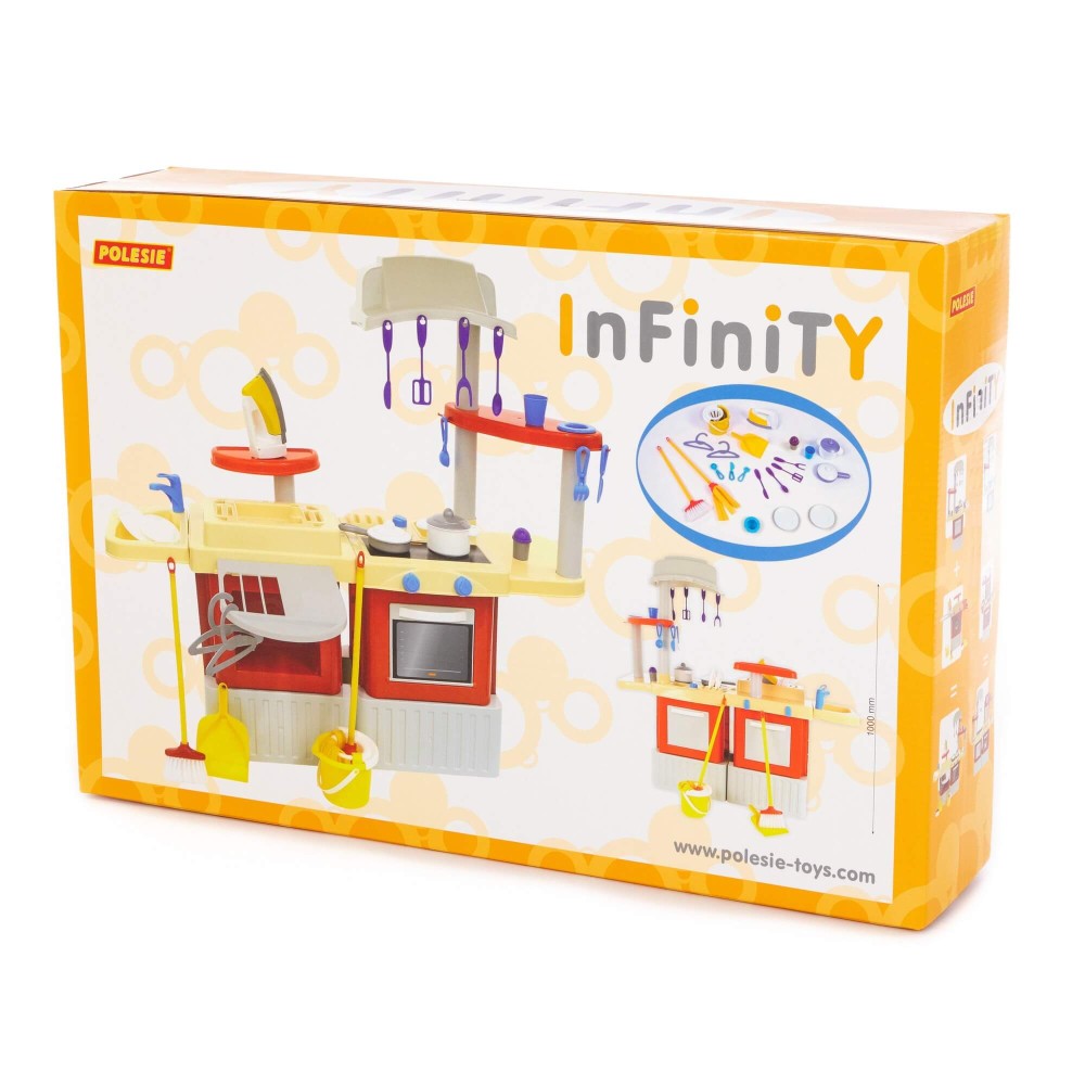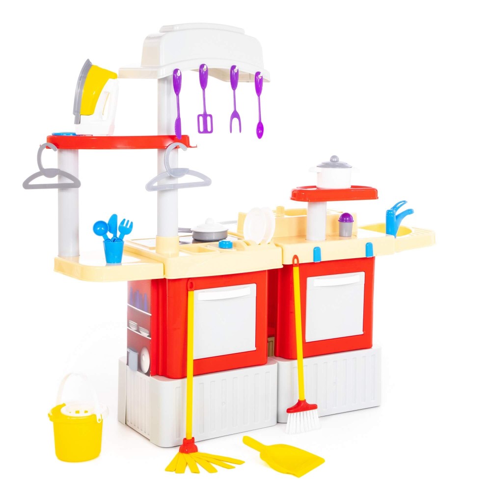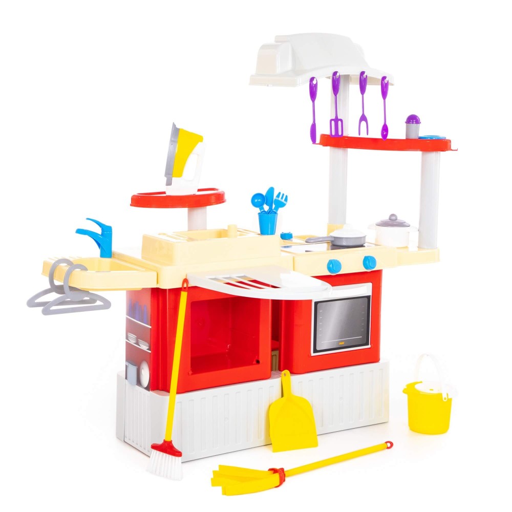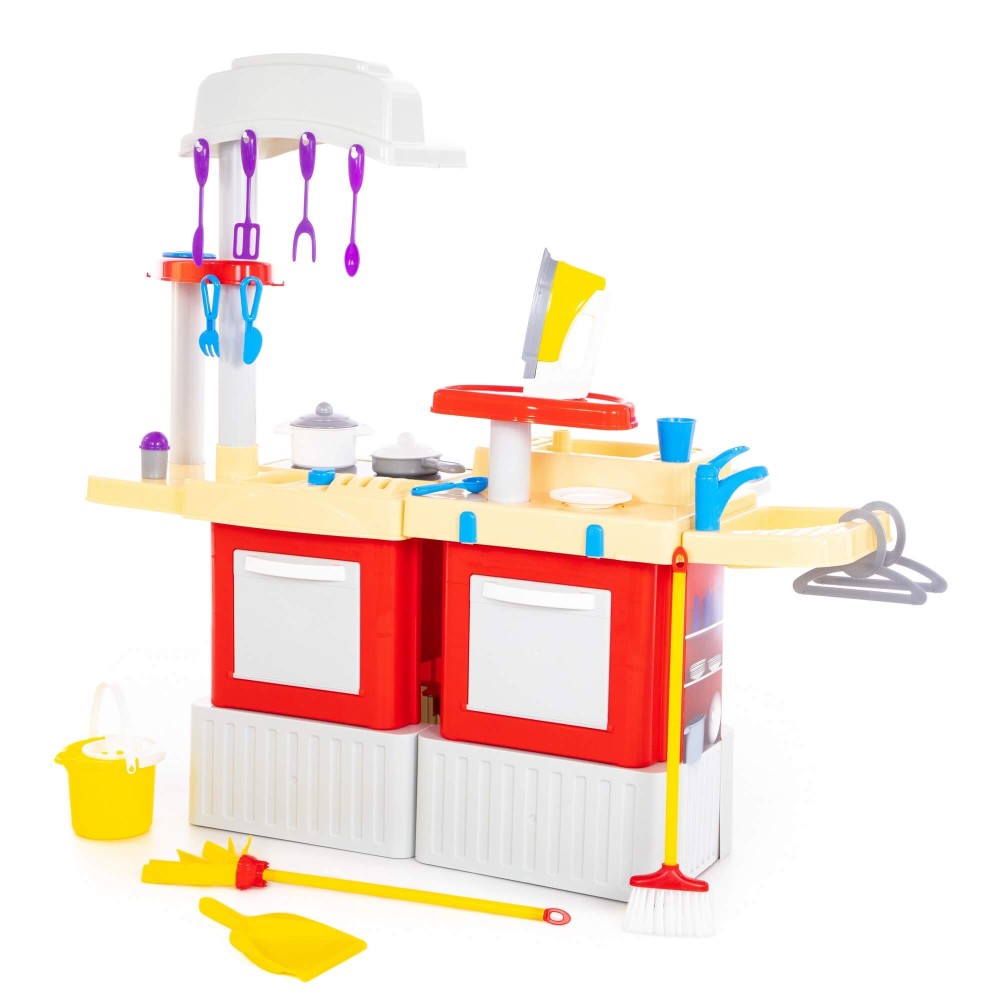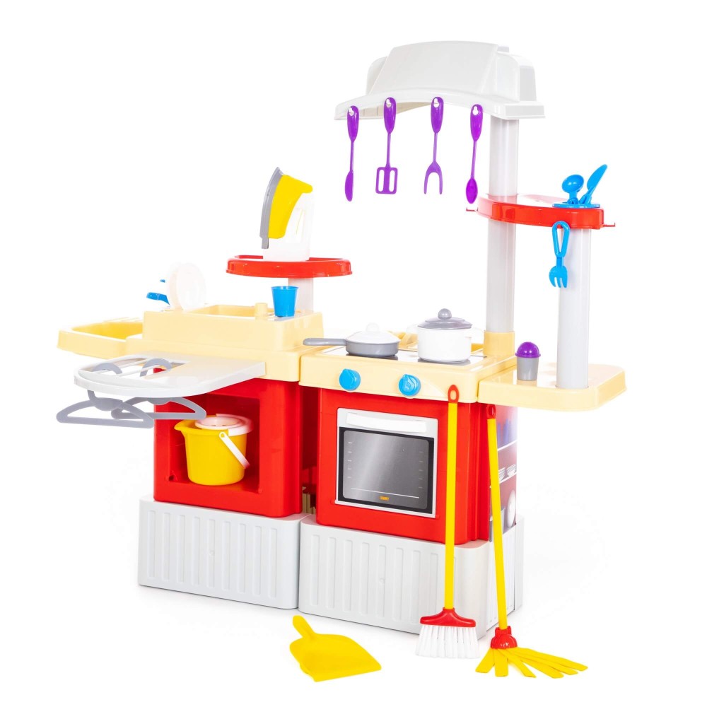 Большой игровой комплекс для девочек, заключающий в себе кухню и набор для уборки, стирки и глажки. Комплекс состоит из двух модулей, которые соединяются между собой, но в игре можно использовать и каждый в отдельности. Кухня оснащена плитой, вытяжкой, духовкой, шкафчиком и полочками, сушилкой для посуды и крючками для навешивания столовых и кухонных приборов. В набор также входят: