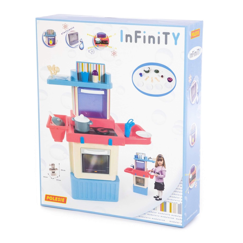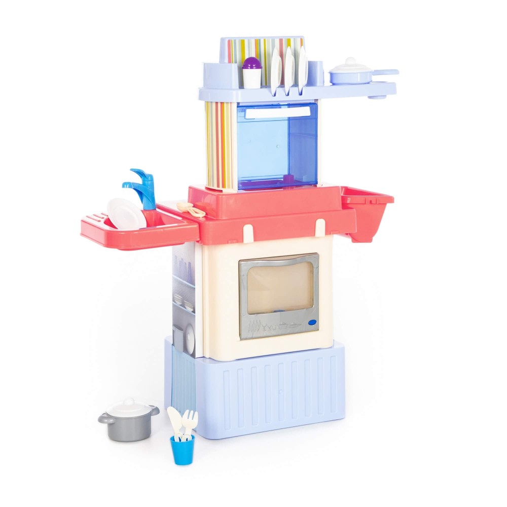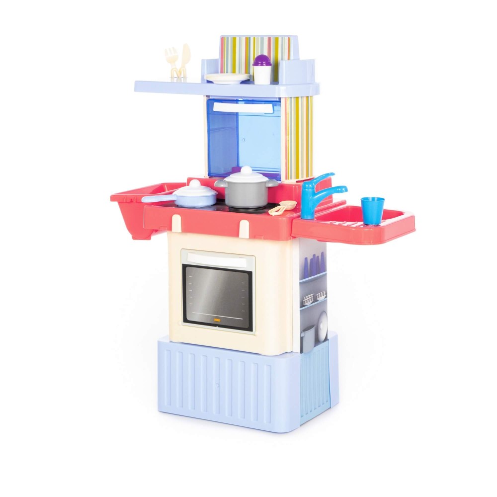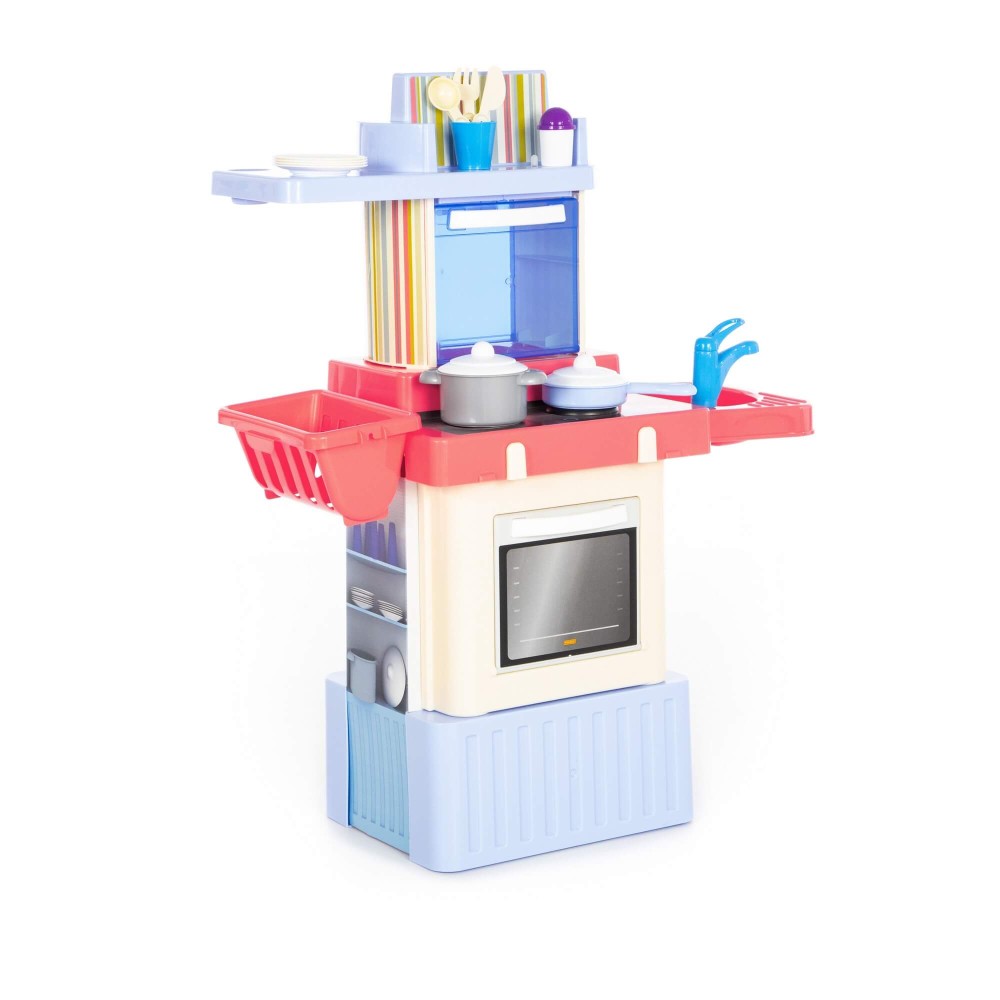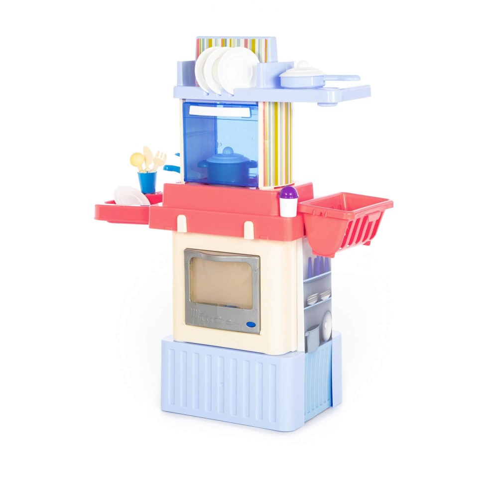 Кухня содержит 3 электронных элемента: озвученная плита, подсветка шкафчика и посудомоечная машина. В дверку машинки заливается вода. При нажатии кнопки включения моторчик в дверке создает брызги и издает звук. Плита начнет "жарить" (зазвучит), если на неё поставить кастрюльку или сковороду. В комплект посуды входят: