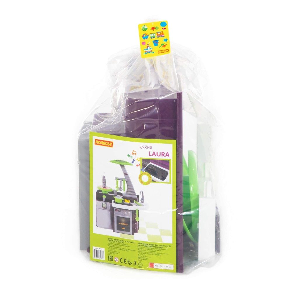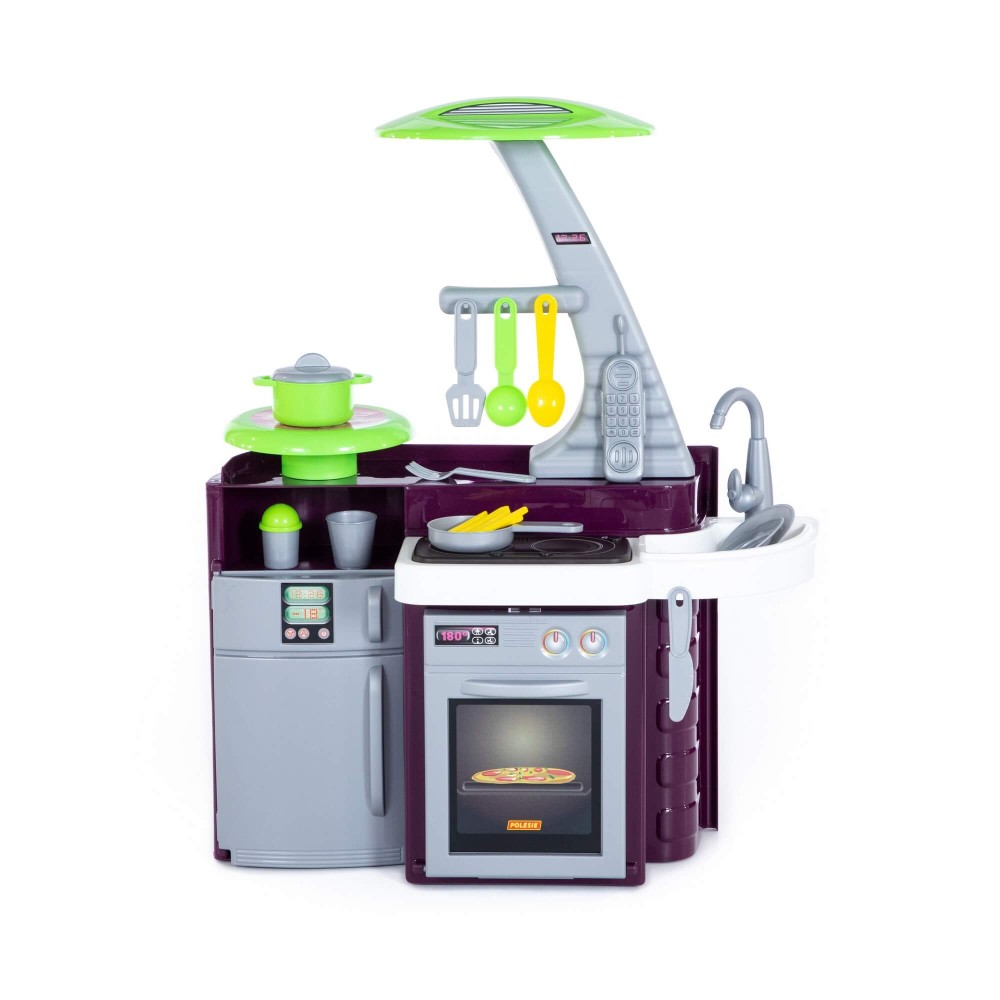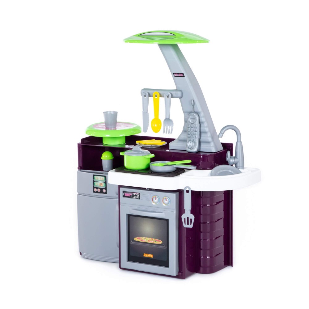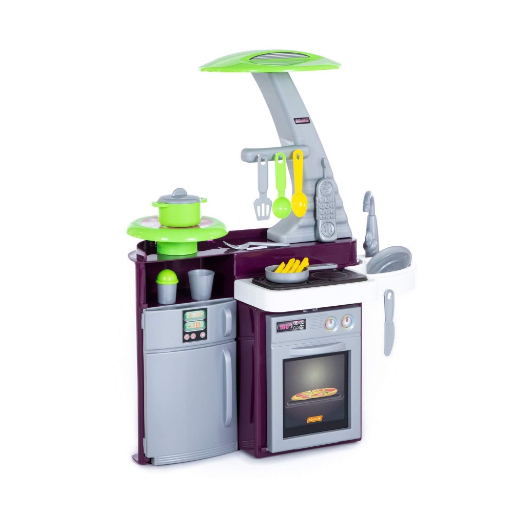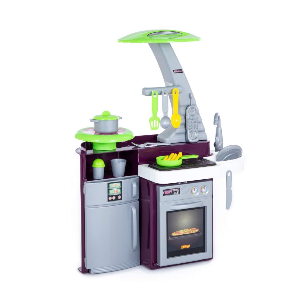 Кухня оснащена электронной озвученной варочной панелью с подсветкой. На панели 4 кнопки: две для включения правой и левой конфорок, одной кнопкой включается звук вытяжки, и еще одной - 3 развлекательных мелодии. Включение конфорки приводит в действие подсветку, после чего появляется звук "жарки". Через 2 секунды после выключения конфорки выключается звук, затем гаснет подсветка. В набор также входит: