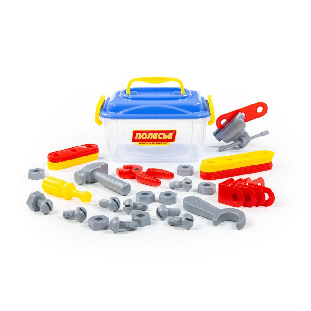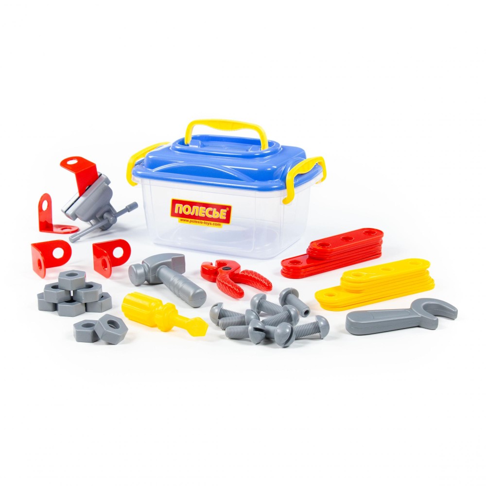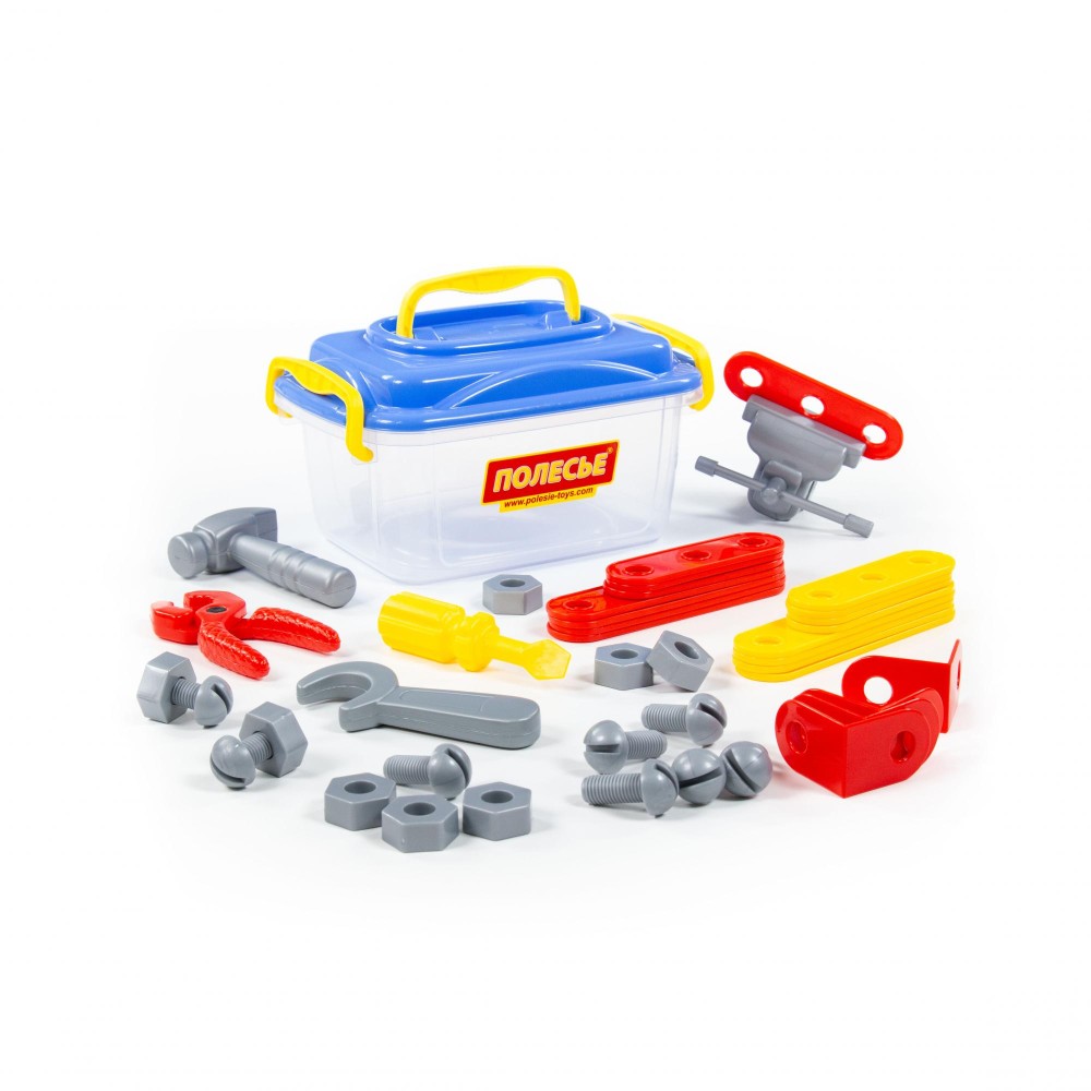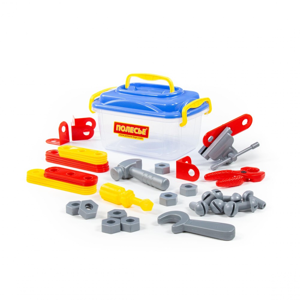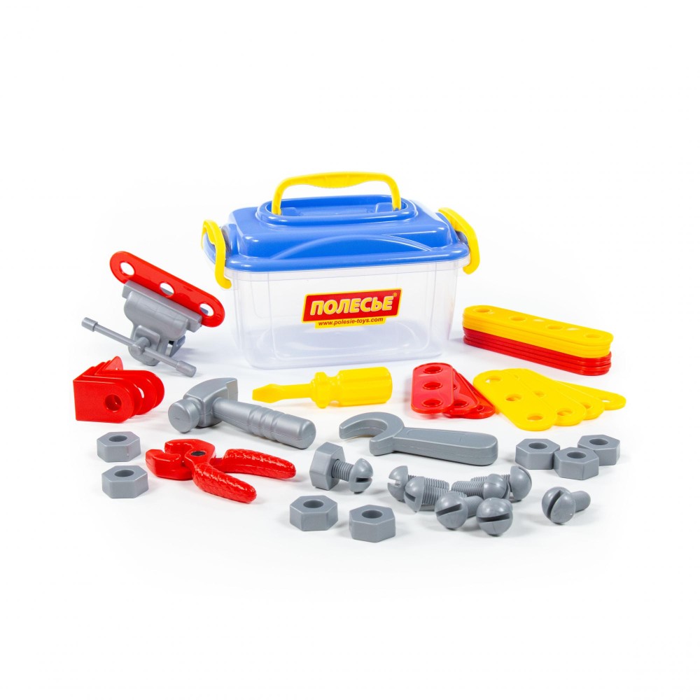 Набор для мальчиков, состоящий из отвертки, гаечного ключа, пассатижей, молотка, слесарных тисков, а также соединительных пластин, уголков, винтов и гаек. Набор отлично подойдет для первого знакомства мальчика со слесарным инструментом, его назначением, принципами работы. Укомплектован в контейнер, который упрощает хранение и перемещение игрушки.