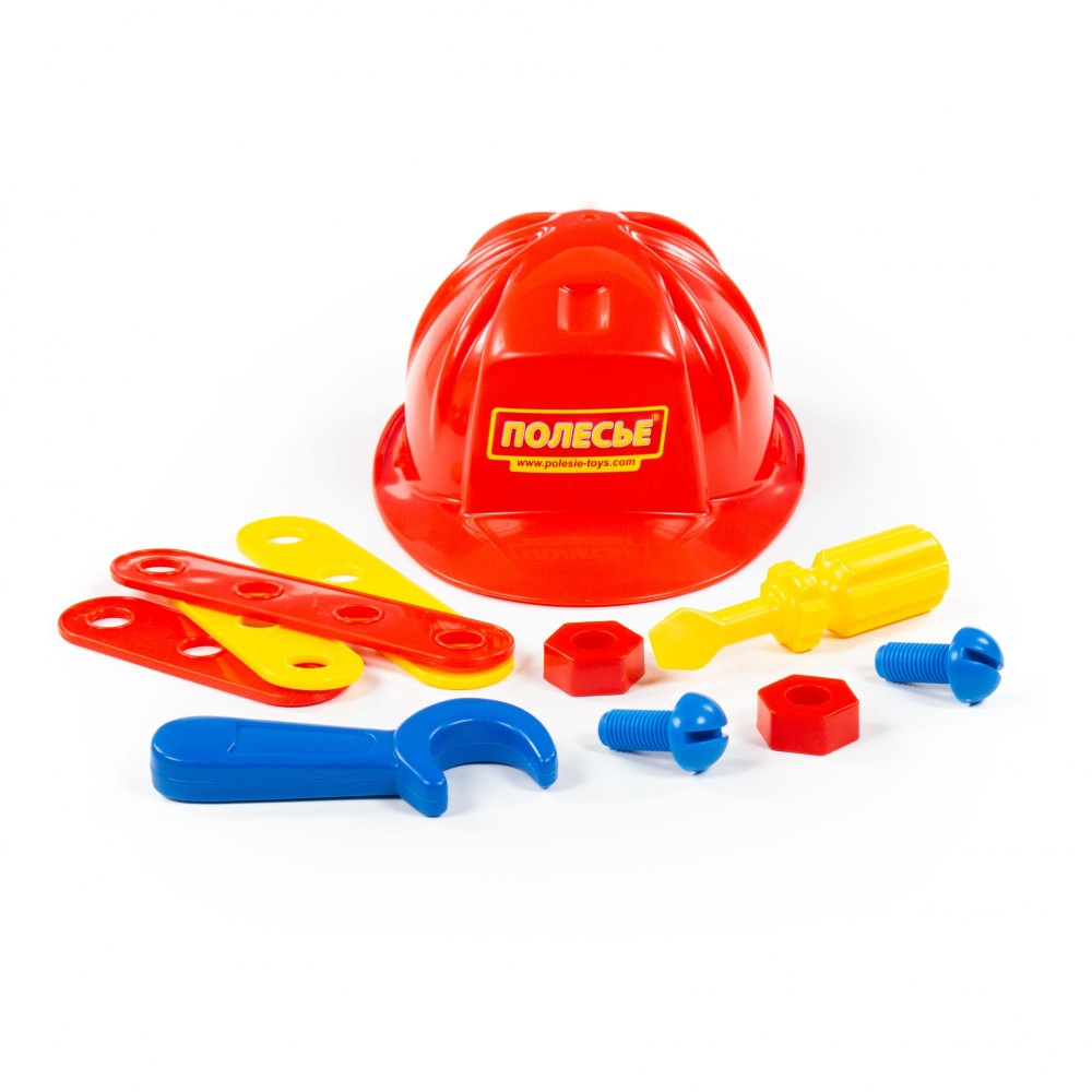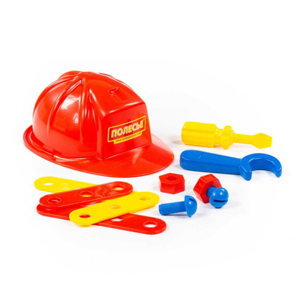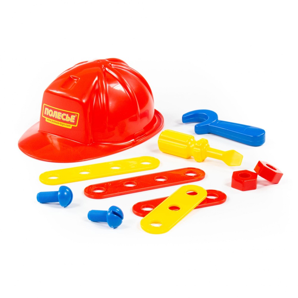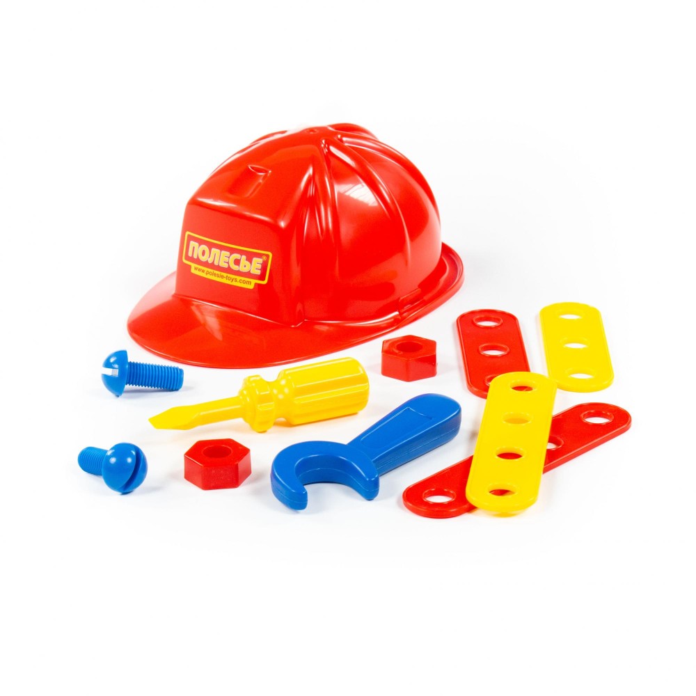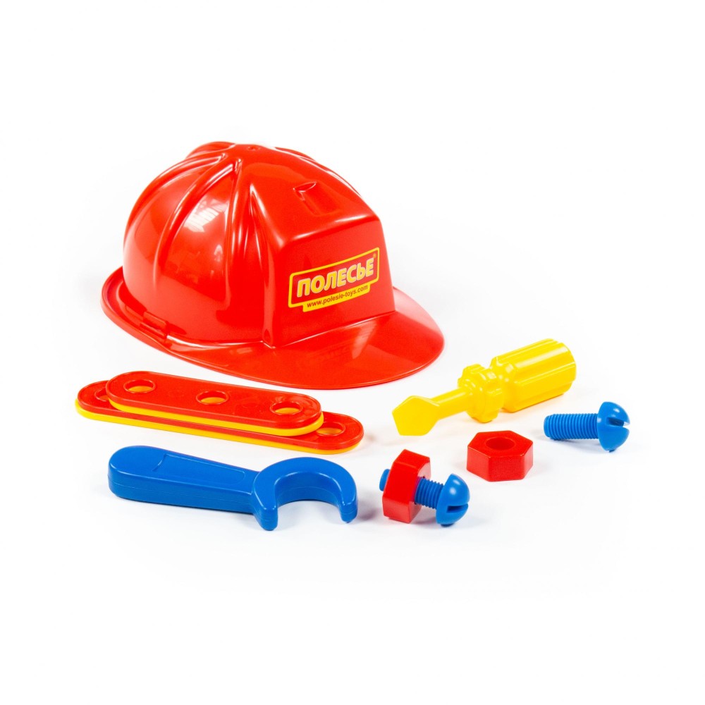 Набор для мальчиков, состоящий из отвертки, гаечного ключа, а также соединительных пластин, винтов, гаек и самого главного атрибута слесаря - каски. Набор отлично подойдет для первого знакомства Вашего мальчика со слесарным инструментом, его назначением, принципами работы.