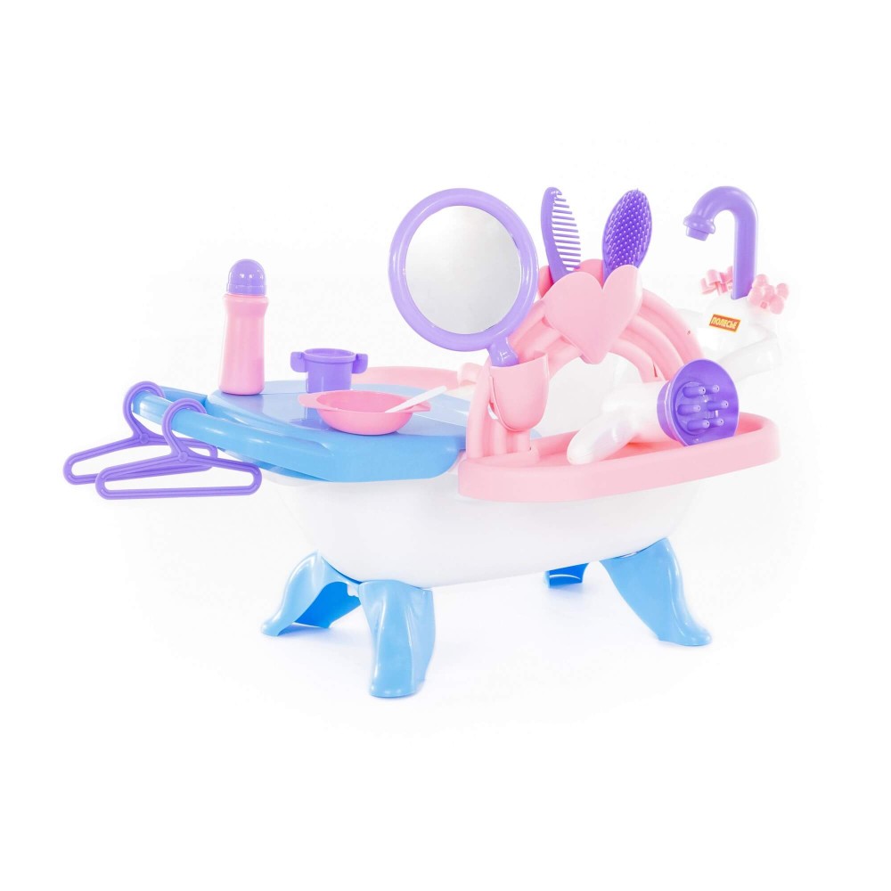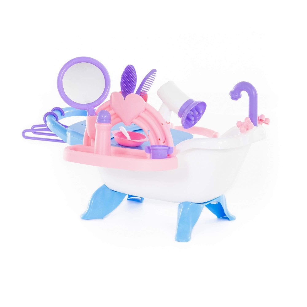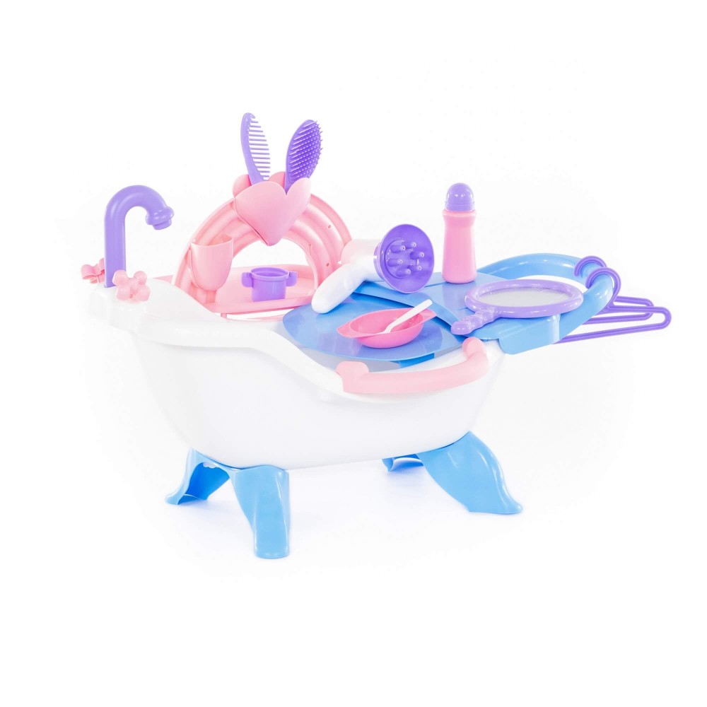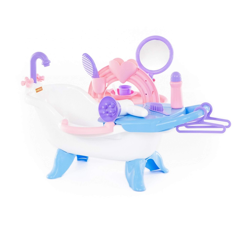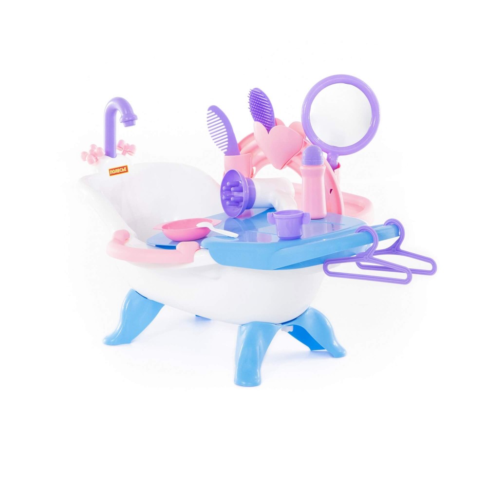 Набор представляет собой ванну на 4 ножках для кукол. Куклу можно не только искупать, но и причесать, накормить. К ванне крепится пеленальный столик с выдвижной полочкой, карманчики для игрушечных детских принадлежностей. В набор входят: фен, расчески (2 шт.), зеркальце, вешалки (2 шт.), миска, ложка, поильник, флакон. Кукла в набор не входит.