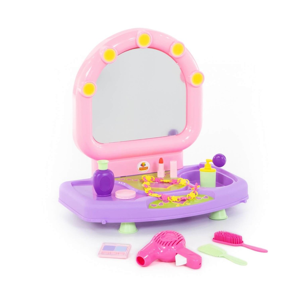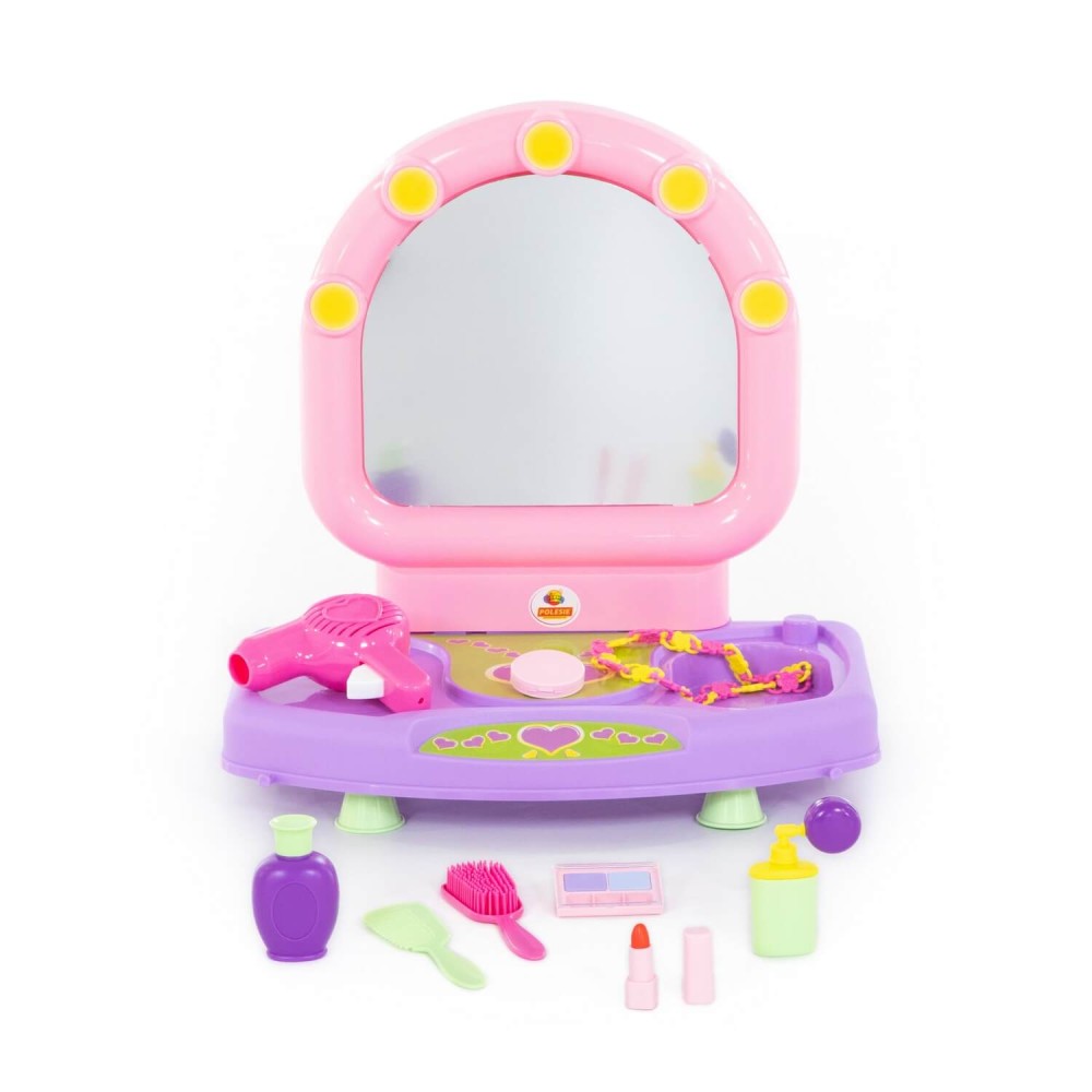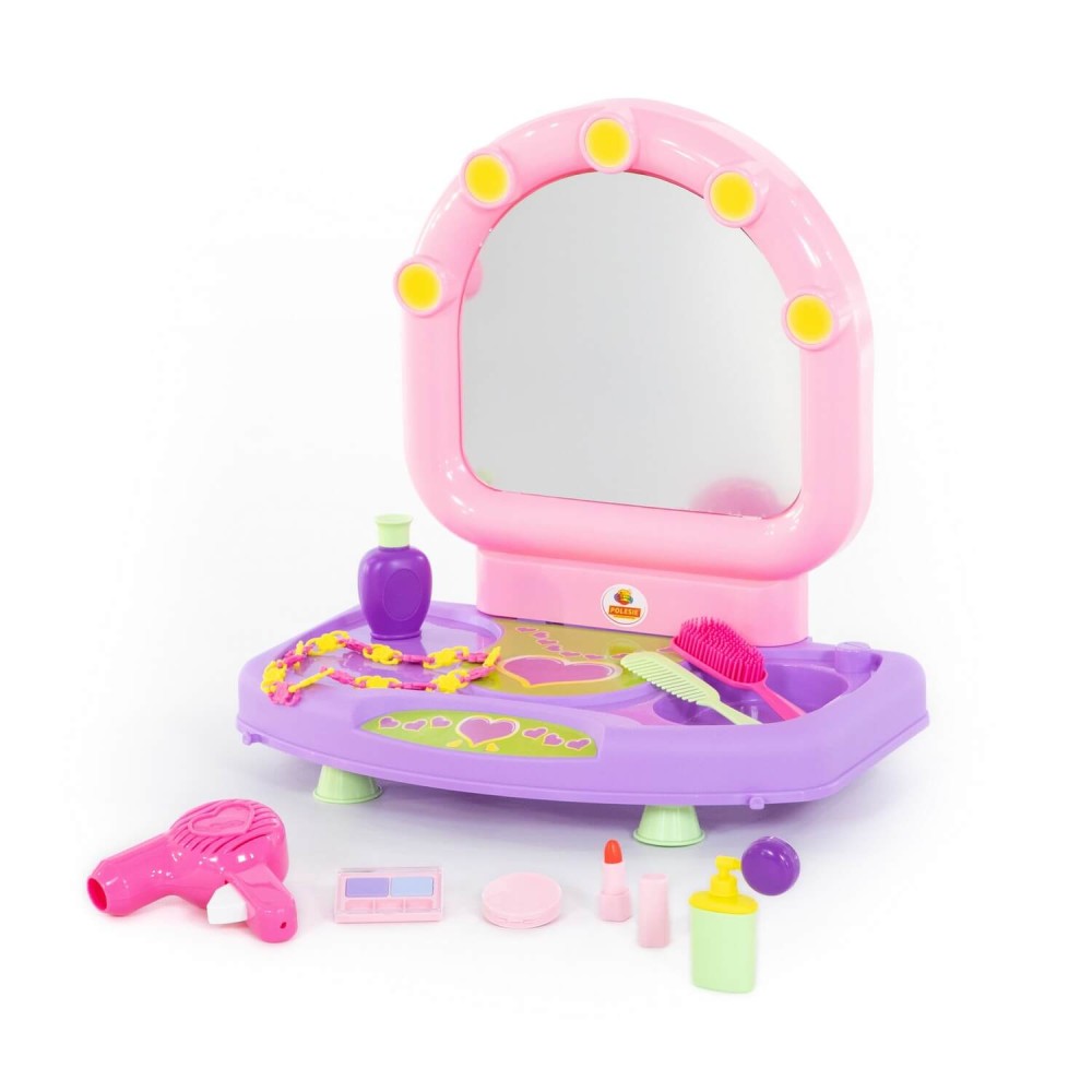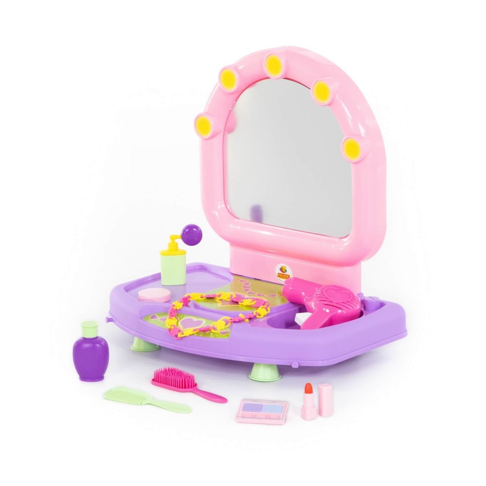 Настольный салон красоты для маленьких красавиц представляет собой туалетный столик с зеркальцем. В набор входят игрушечные принадлежности: фен, расчески (2 шт.), ожерелье, пудреница, тени для век, помада, флакончики для косметических средств. С помощью набора маленькая модница сможет организовать свой салон красоты и примерить на себя роль парикмахера, визажиста или стилиста.