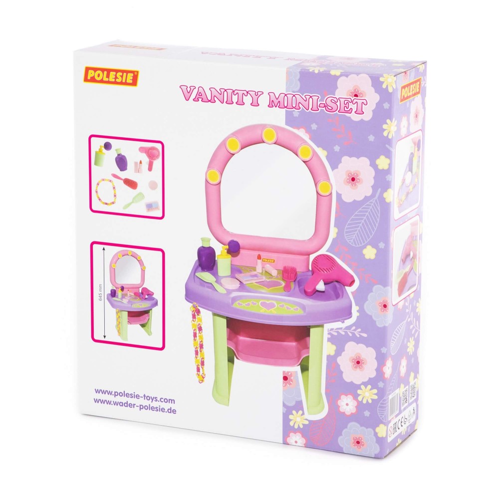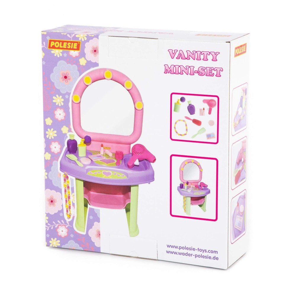Мини-туалетный столик с зеркальцем и полочкой. Зеркальце абсолютно безопасно, так как вместо стекла здесь используется пластик. Для удобного хранения аксессуаров предусмотрена вместительная полочка. В набор входят следующие принадлежности: фен, расчески (2 шт.), ожерелье, пудреница, тени для век, помада, флаконы для духов и других косметических средств. С помощью этого набора маленькая модница сможет организовать свой салон красоты и примерить на себя роль парикмахера, визажиста или стилиста.