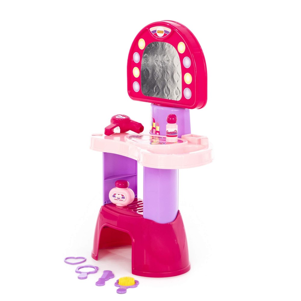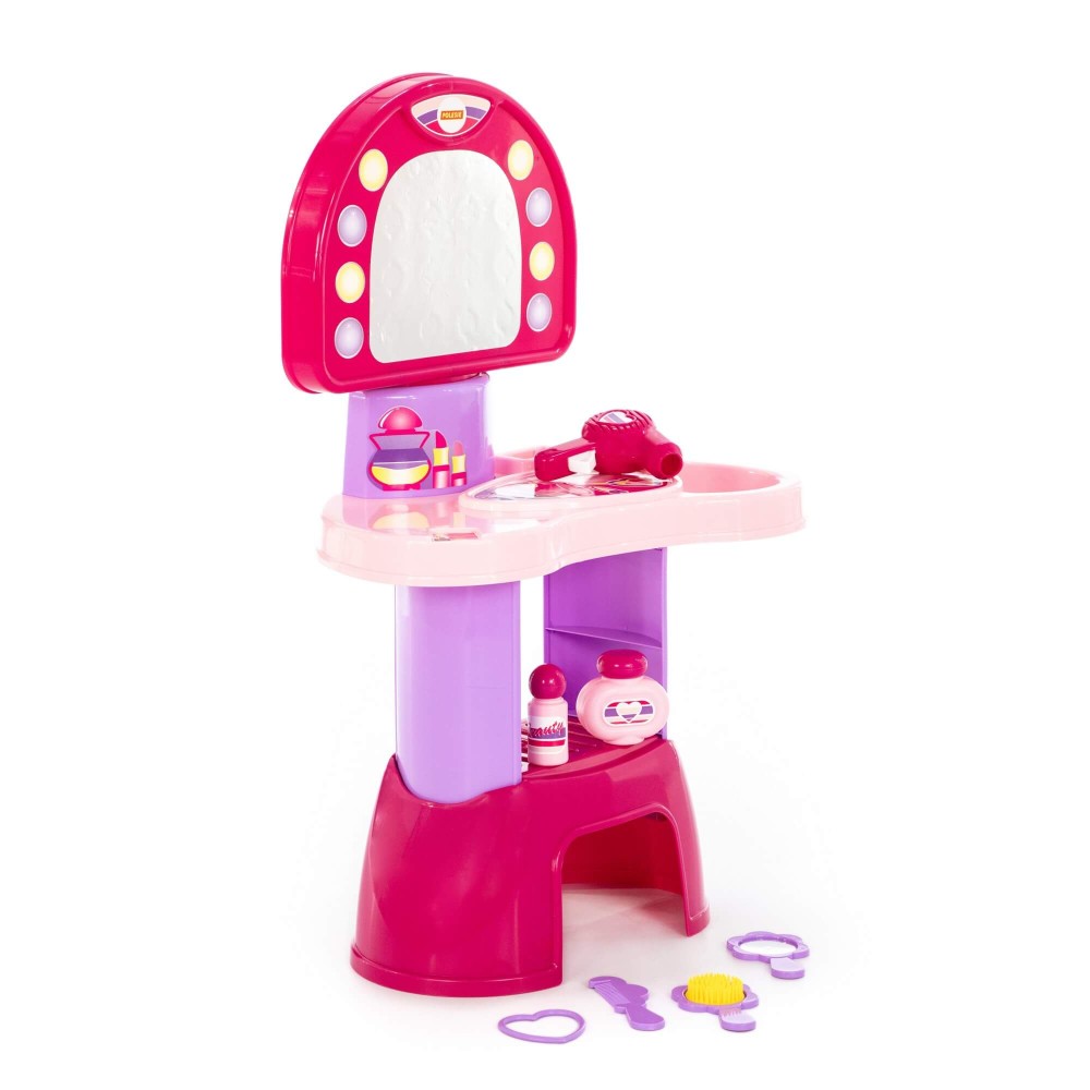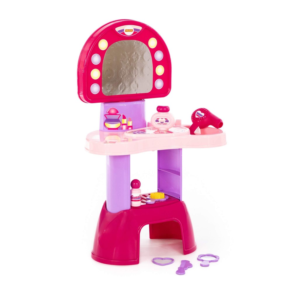 Салон красоты состоит из туалетного столика и аксессуаров. Под столиком расположена большая полочка для парикмахерских принадлежностей. Хранить детскую косметику и украшения также можно на столешнице. Зеркало абсолютно безопасно, так как вместо стекла здесь используется пластик. В комплект аксессуаров входят: