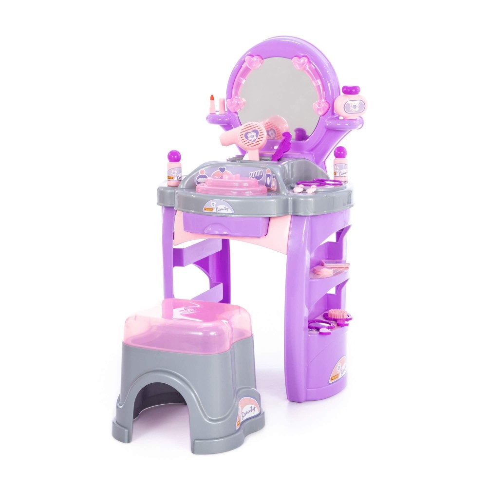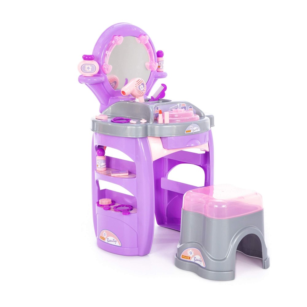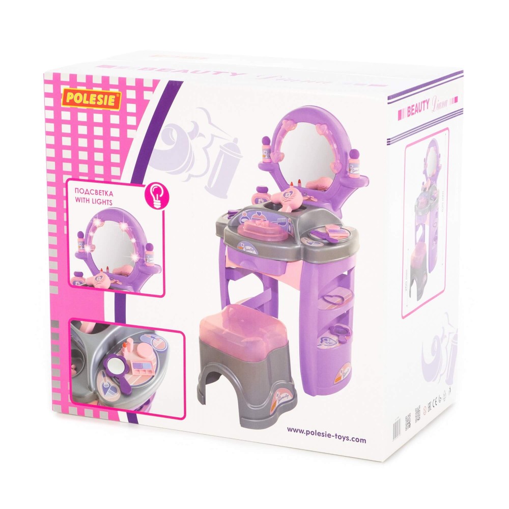 Игровой набор упакован в коробку. В комплект входят инструкция по сборке и наклейки. Салон красоты состоит из туалетного столика, стульчика и аксессуаров. Стульчик легко спрятать под столик, поэтому набор получается компактным. По бокам столика расположены удобные полочки для парикмахерских принадлежностей. Для хранения детской косметики и украшений предусмотрены выдвижной ящик и шкатулочка на самой столешнице. Круглое зеркало обыгрывается подсветкой, которая работает от трёх пальчиковых батареек (входят в комплект). Зеркало абсолютно безопасно, так как вместо стекла здесь используется пластик. По бокам зеркала имеются дополнительные полочки для миниатюрных предметов (например, можно повесить бусы). В комплект аксессуаров входят: игрушечный фен, две расчески, флакончики для косметических средств, маленькое зеркальце, браслетики, клипсы, имитация помады, теней для век и пудреницы. С помощью такой игрушки девочка учится следить за собой и делать причёски, знакомится с профессией парикмахера. У ребёнка раскрываются творческие способности, развиваются чувство стиля и фантазия. Игрушка подходит для игры в группе.