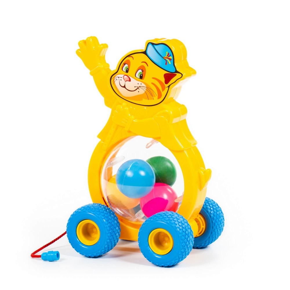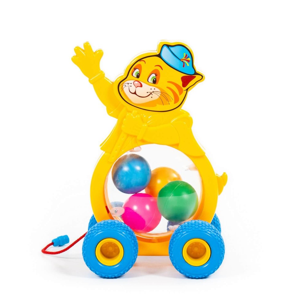 Она выполнена из безопасного пластика, в жизнерадостной цветовой гамме. Представляет из себя веселого персонажа с основой в виде сферы на прорезиненных колесиках, внутри которой расположены разноцветные шарики, изменяющие свое положение при движении игрушки. Этот процесс привлекает внимание малыша. А наличие веревочки, за которую можно передвигать бимбосферу, делает игрушку еще более интересной.