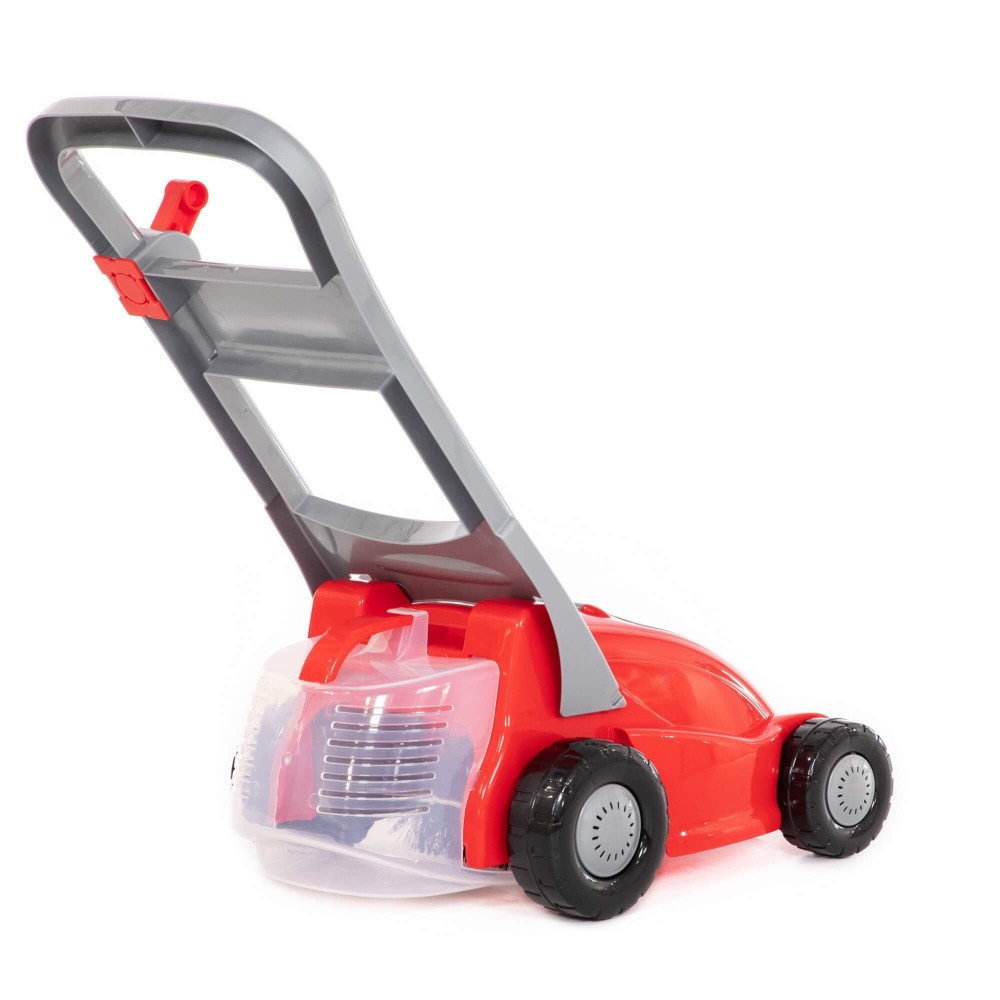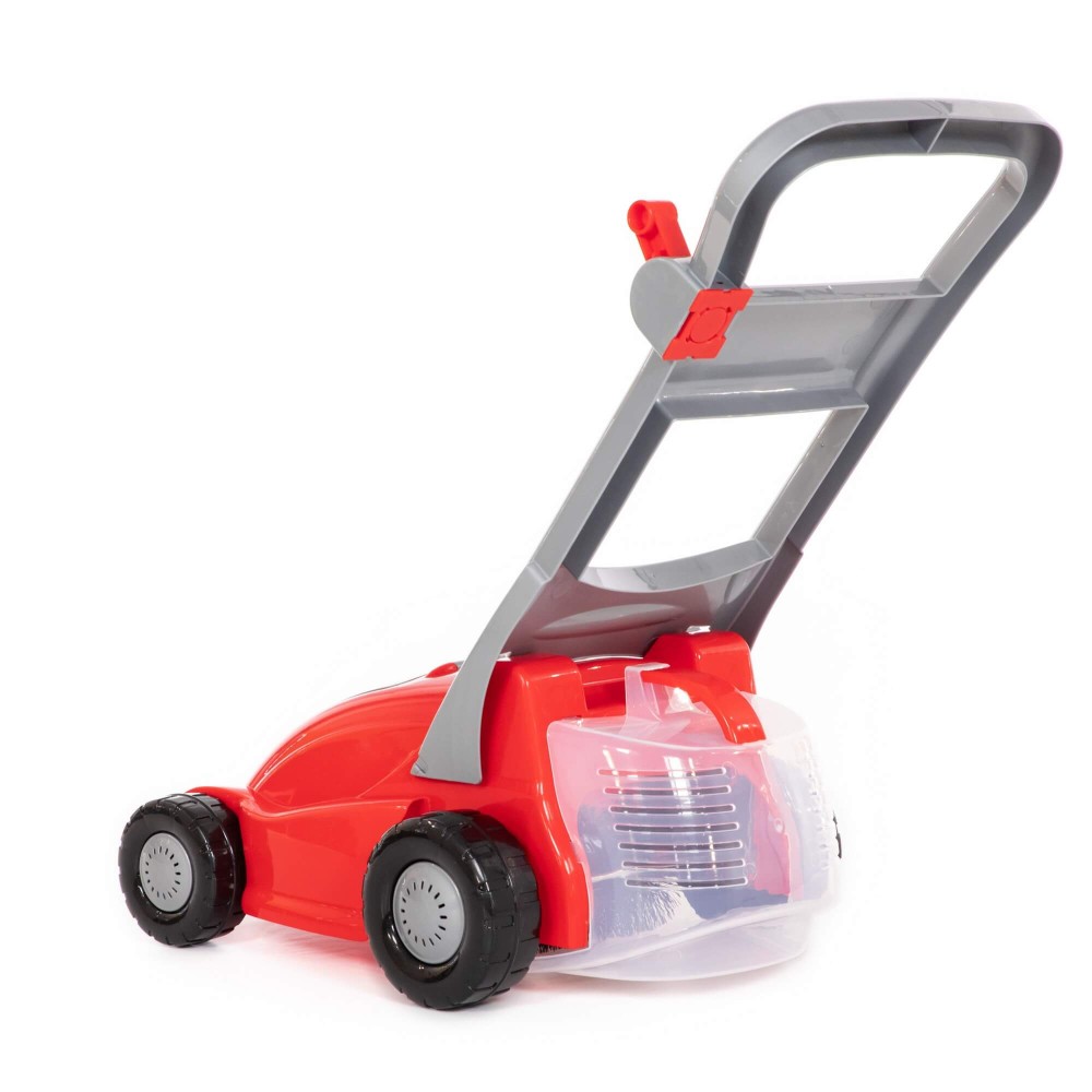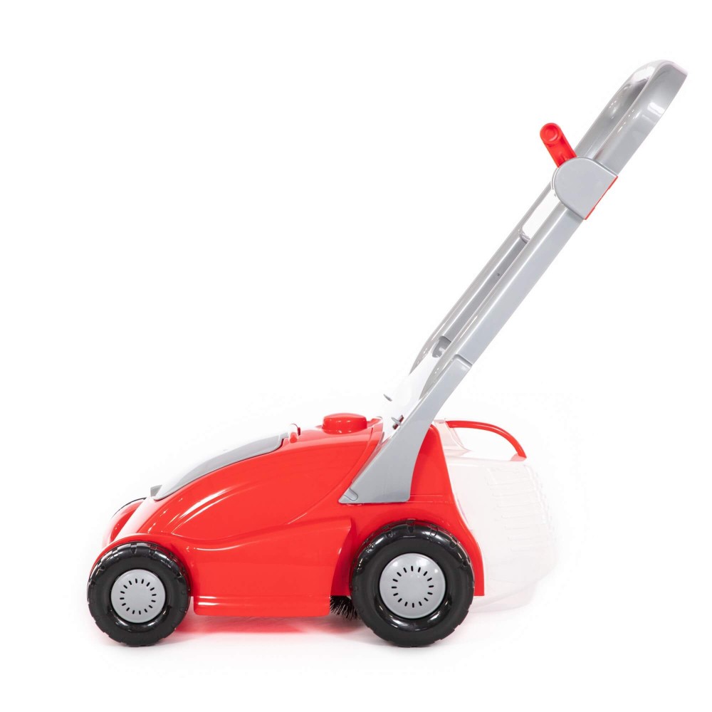 Газонокосилка № 2 от фабрики «Полесье» разнообразит игру детей на свежем воздухе. Ручка газонокосилки подвижная. На корпусе под крышечкой есть углубление-ниша. Если нажать на рычажок на ручке, то игрушка издаёт звук, имитирующий покос травы. Во время движения игрушечного прибора внизу крутится гребешок и захватывает траву, что делает газонокосилку более реалистичной. Игрушка универсальная и подойдёт для детей разного возраста. Малыши могут использовать её в качестве каталки, держась за ручку и толкая перед собой. Так усовершенствуются навыки ходьбы. Для детей постарше игрушечная газонокосилка станет прекрасным практическим пособием, которое развивает пространственное мышление, воображение и приучает к труду.