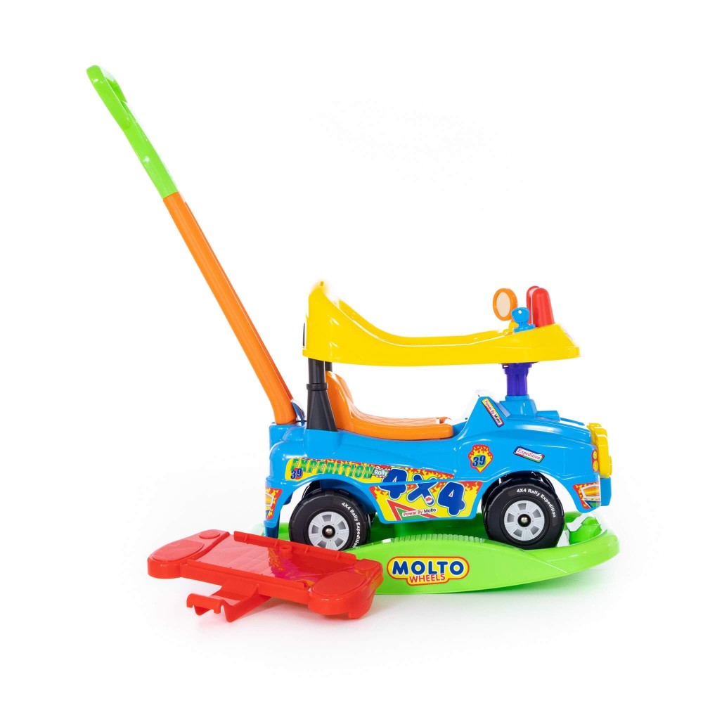 Каталка выполнена в виде джипа в ярких цветах и имеет оригинальный дизайн. На такой каталке ребенок сможет самостоятельно кататься, отталкиваясь ногами. А если малыш устанет, на каталку всегда можно быстро установить ручку и подножки и кататься при помощи взрослых.
