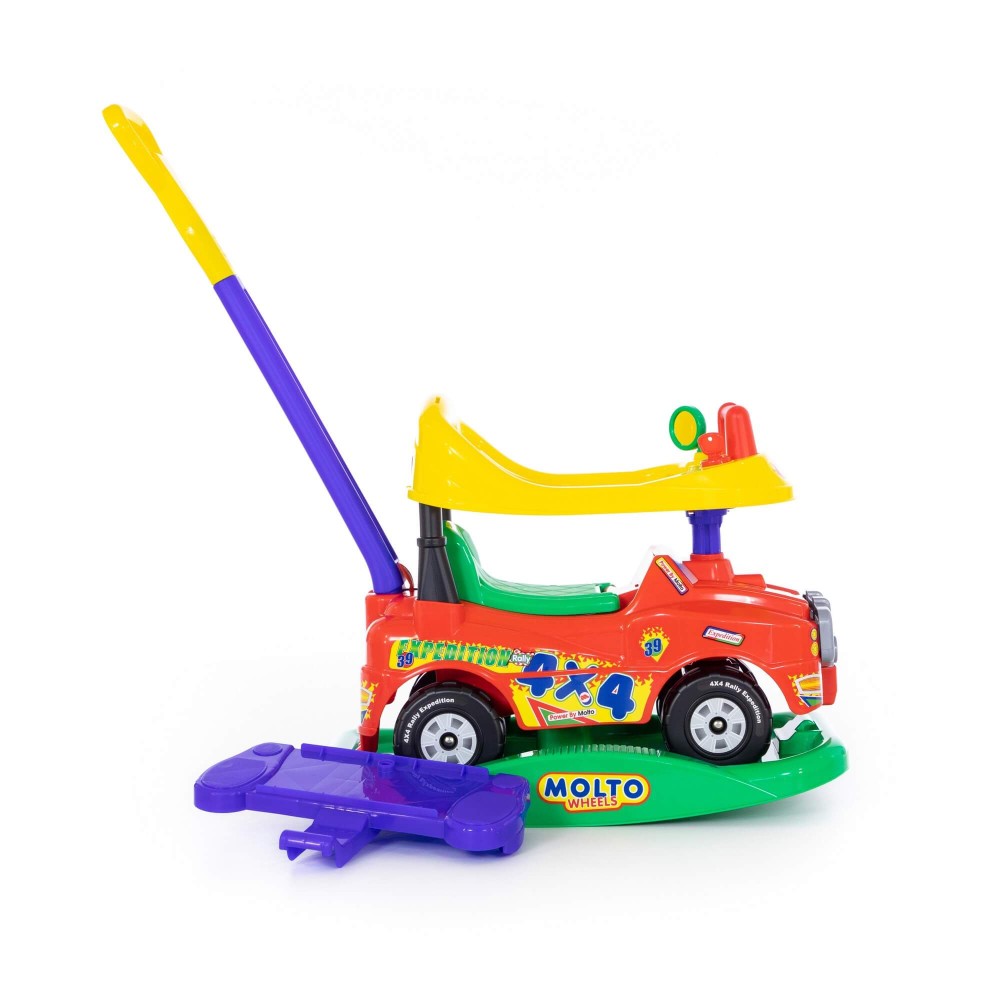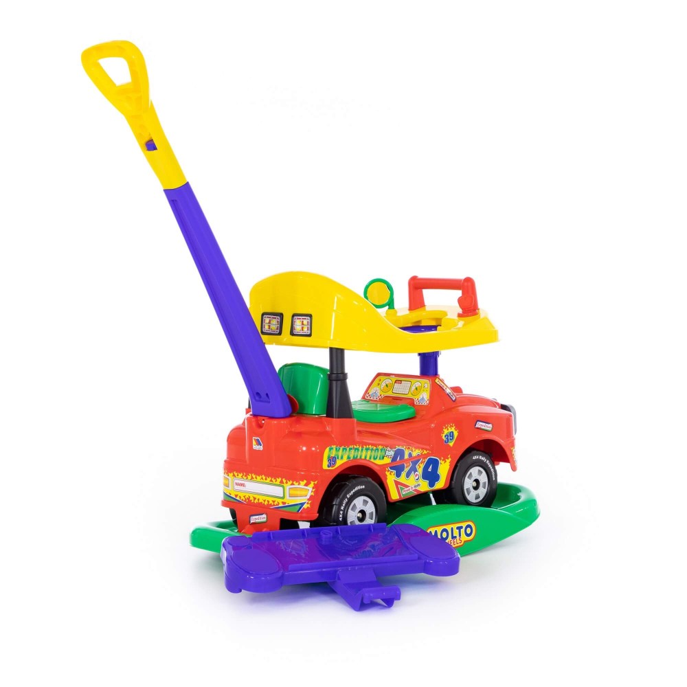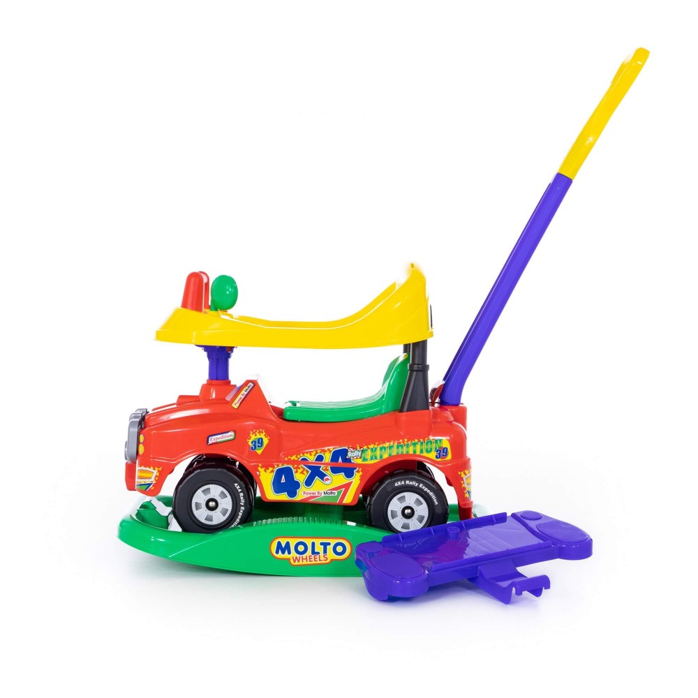 Автомобиль Джип-каталка с ручкой — это автомобиль 4 в 1, оснащенный ручкой, подножками, ограждением, а также съёмной платформой (превращает каталку в качалку). Все детали легко крепятся и снимаются. Ребенок может толкать автомобиль перед собой, держась за спинку каталки, совершенствуя навыки ходьбы. Также автомобиль отлично подойдёт для самостоятельного катания ребенка, путём отталкивания ножками.