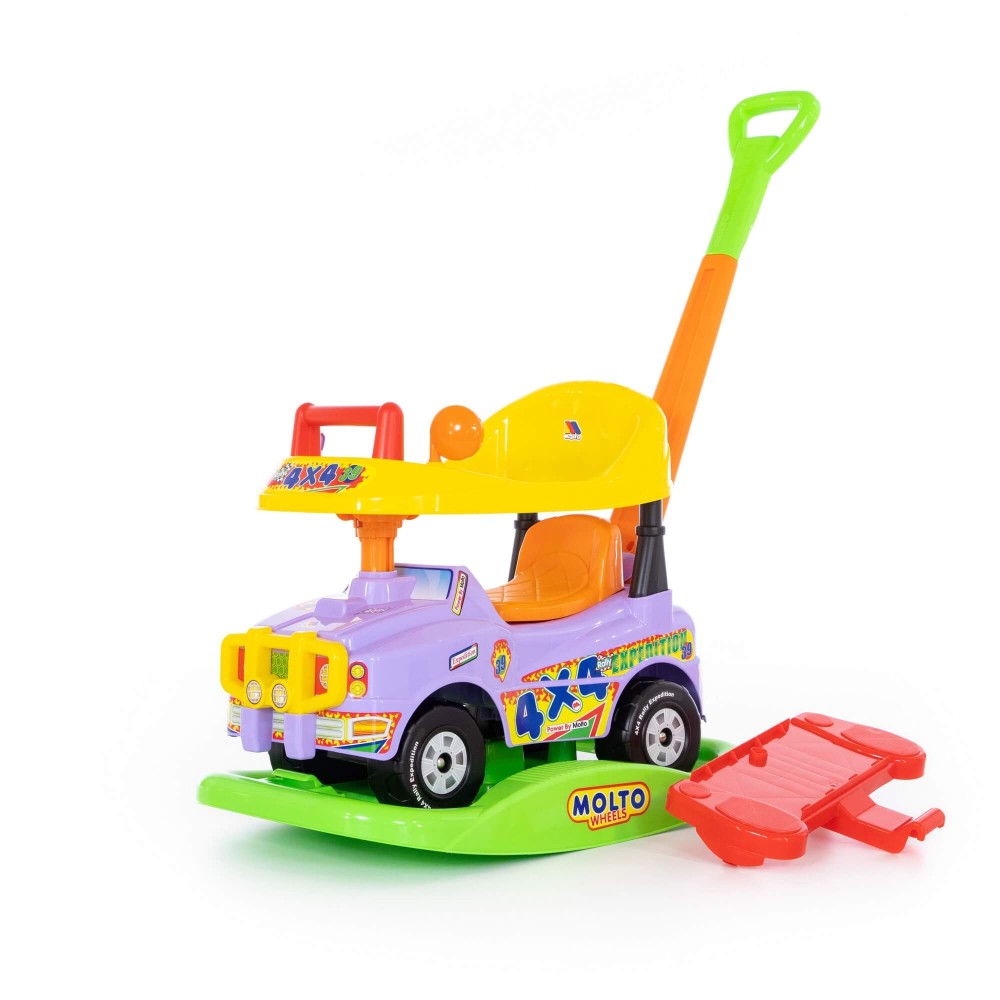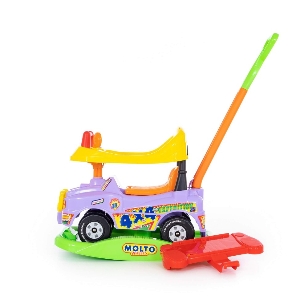 Каталка выполнена в виде джипа в ярких цветах и имеет оригинальный дизайн. На такой каталке ребенок сможет самостоятельно кататься, отталкиваясь ногами. А если малыш устанет, на каталку всегда можно быстро установить ручку и подножки и кататься при помощи взрослых.
