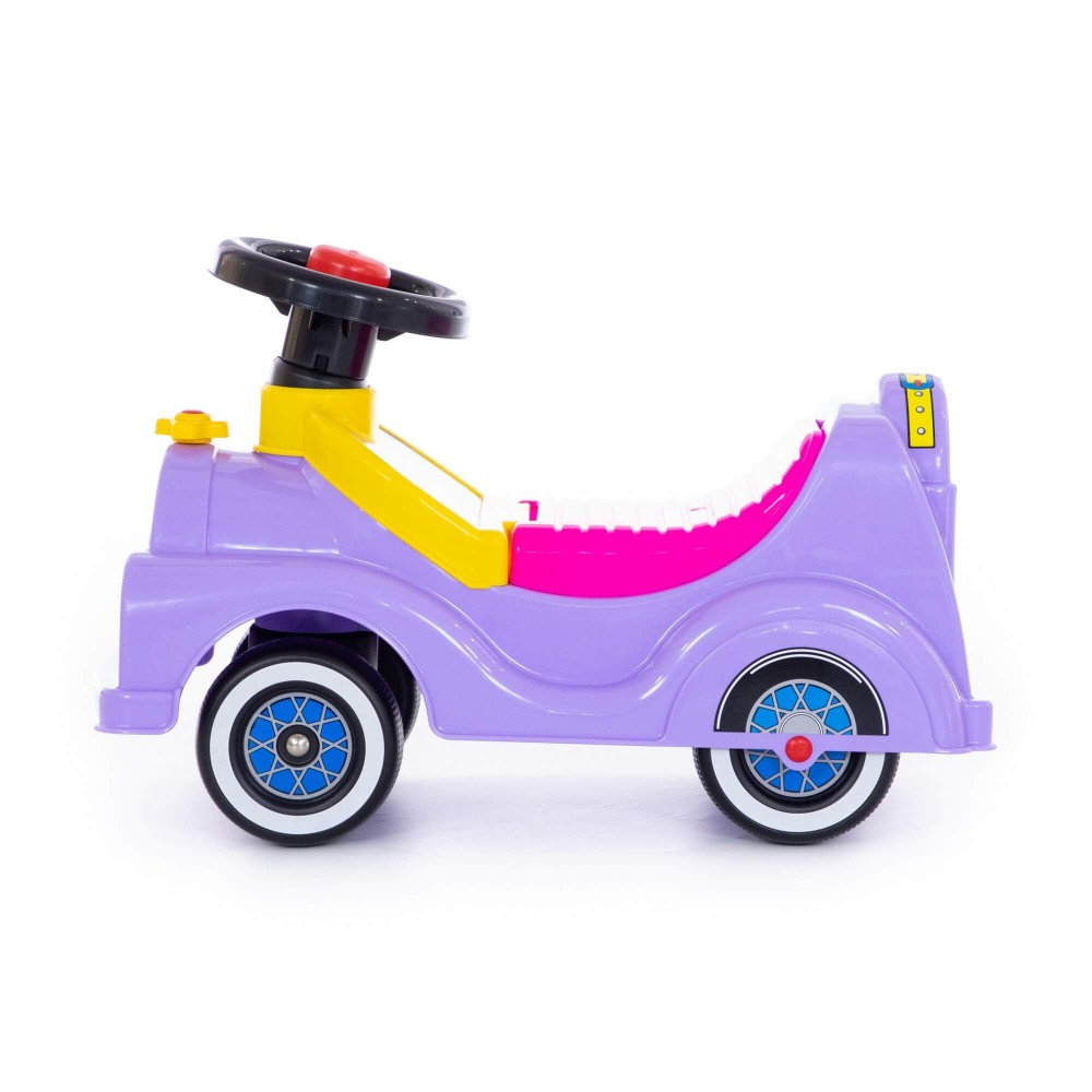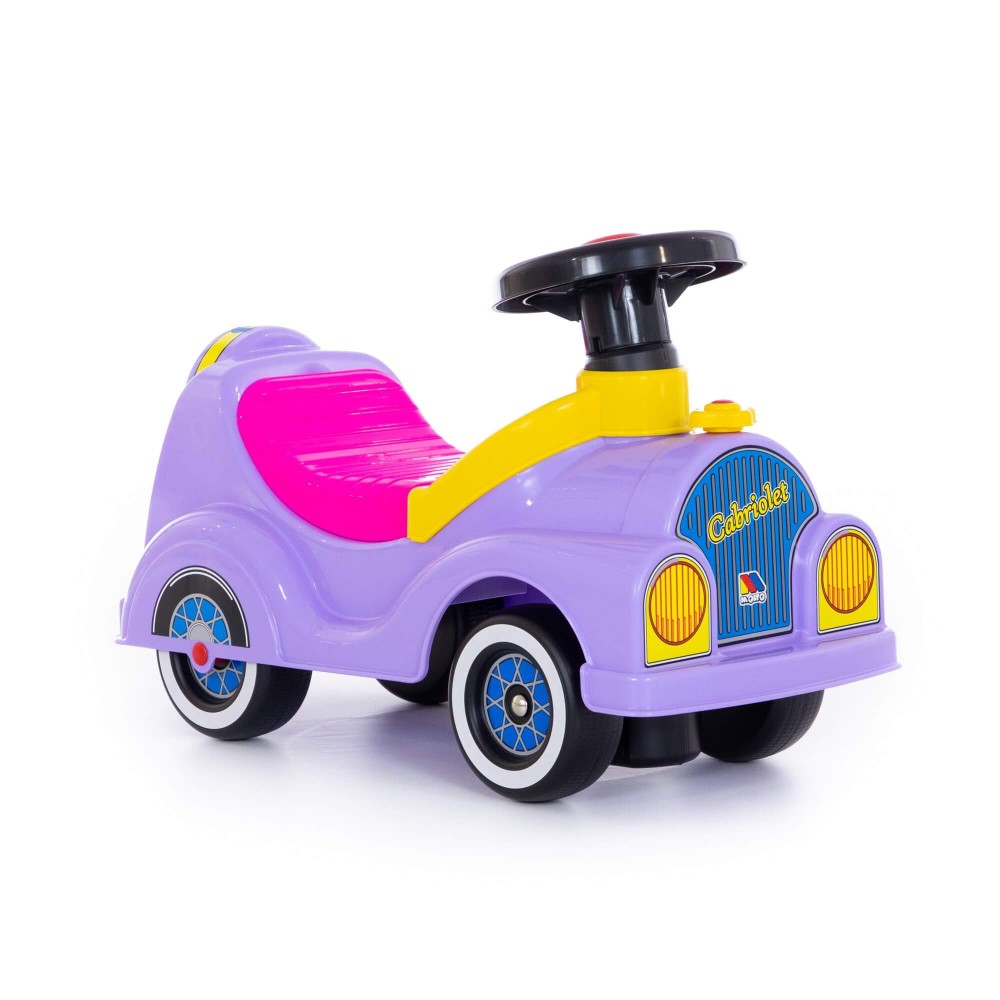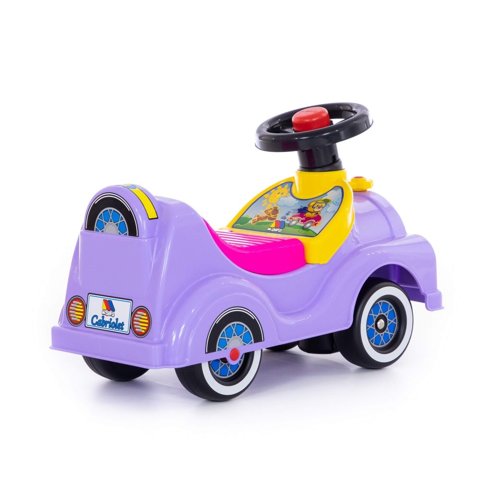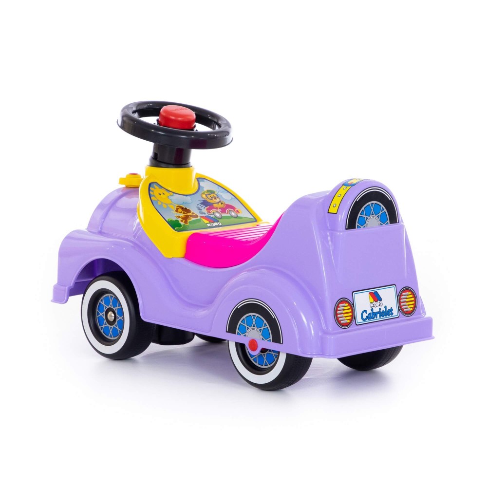 "Кабриолет" - автомобиль-каталка сиреневого цвета с розовым сиденьем. Каталка предназначена для катания ребёнка, путём отталкивания ножками. Руль автомобиля с музыкальным сигналом, под сиденьем находится багажник для любимых небольших игрушек малышки. Катание развивает первоначальные движения и общую координацию ребенка, способствует его физическому развитию.