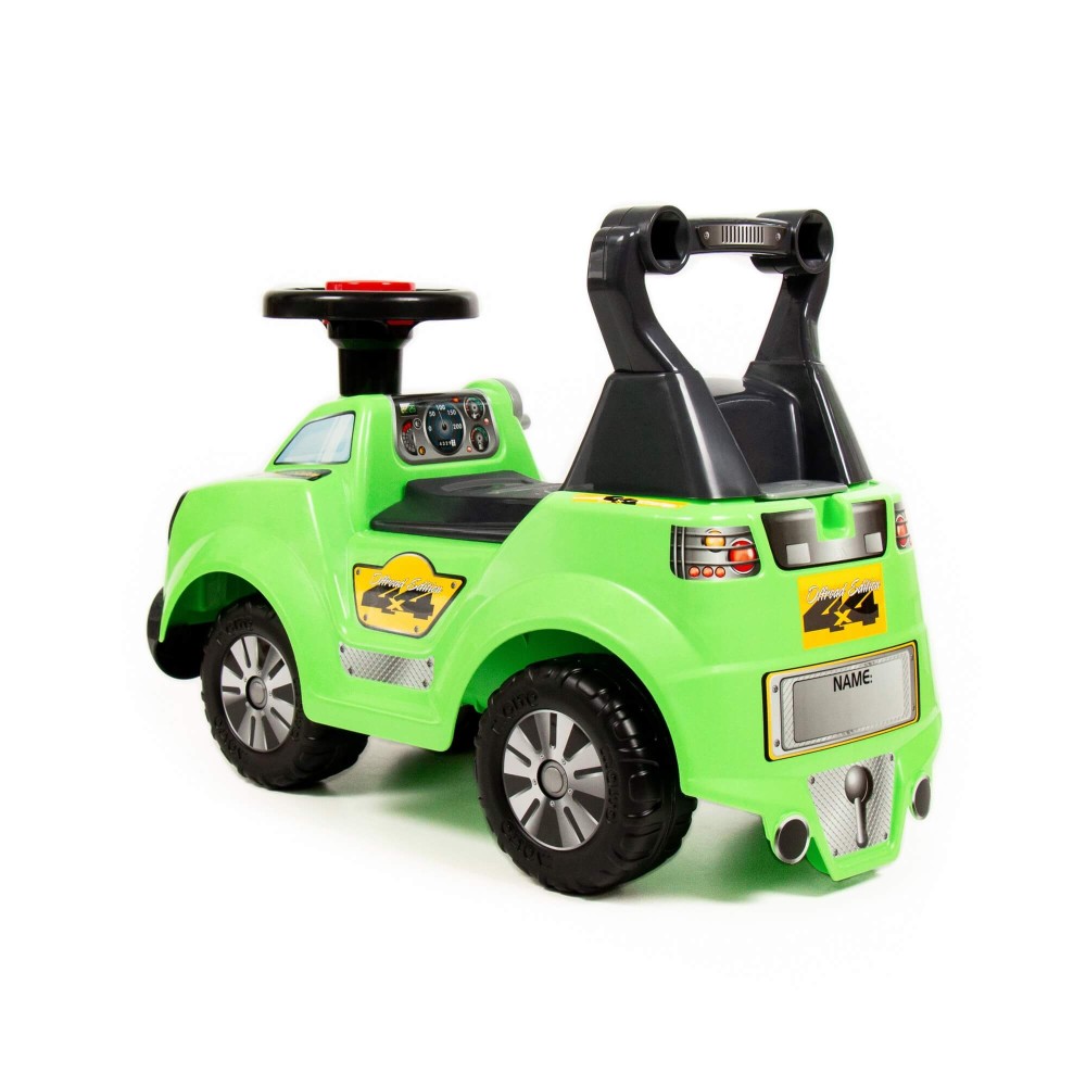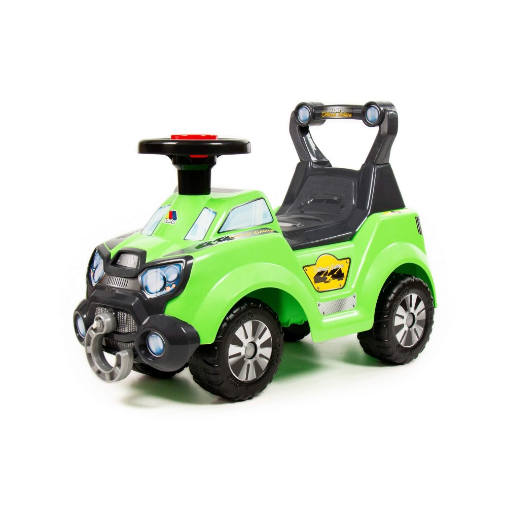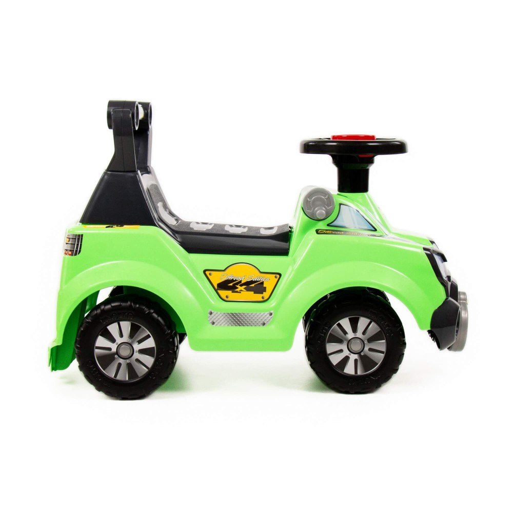 Каталка-автомобиль "Sokol" в виде джипа. Ребёнок, сидя на каталке, отталкивается ножками и тем самым развивает мышцы спины, ног и рук. Такое катание способствует развитию общей координации движений. Ребёнок может катать каталку перед собой, совершенствуя навыки ходьбы. Задний бампер джипа занижен для предотвращения опрокидывания каталки назад. Руль оснащён музыкальным сигналом. Под сиденьем находится багажник, куда ребёнок может поместить мелкие игрушки.