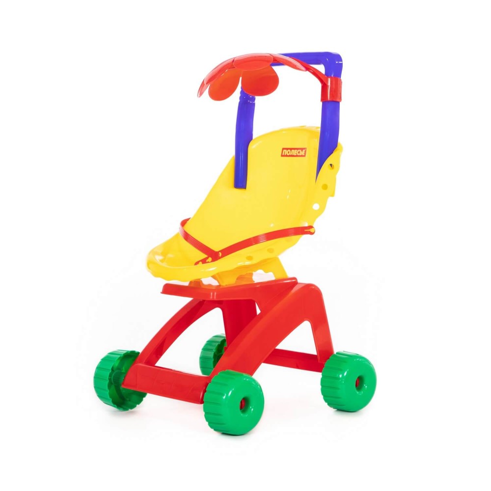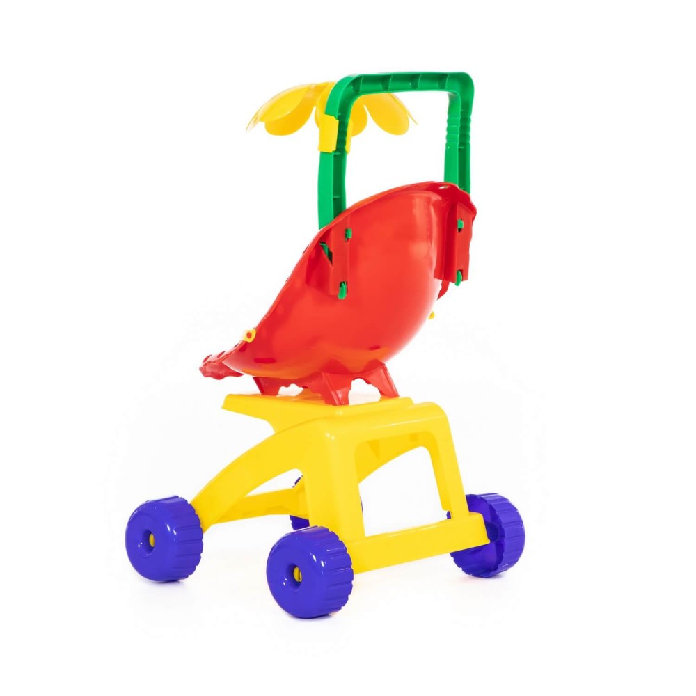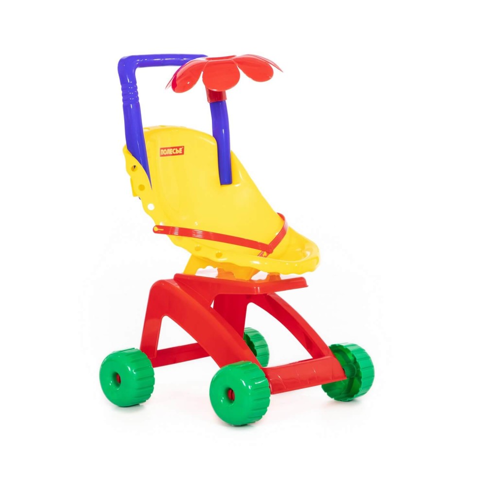 "Ромашка" - это коляска для кукол, пупсов, а также мягких друзей ребёнка. Пассажиров коляски можно пристегнуть ремешком. Коляска выполнена в базовых цветах, которые в первую очередь изучает ребенок, что способствует развитию у него цветовосприятия. Ещё интереснее игру с коляской сделает трещотка, установленная на колесе.