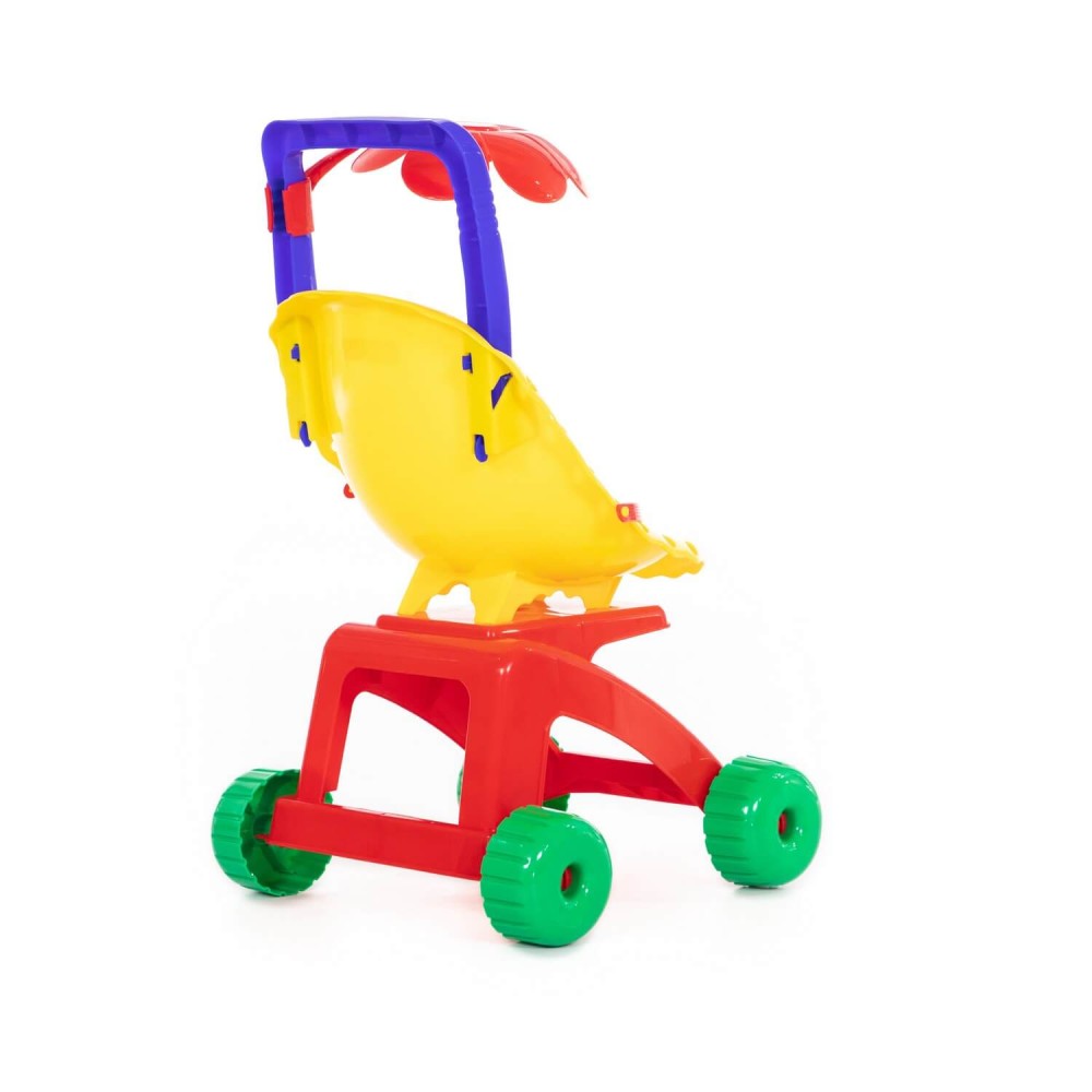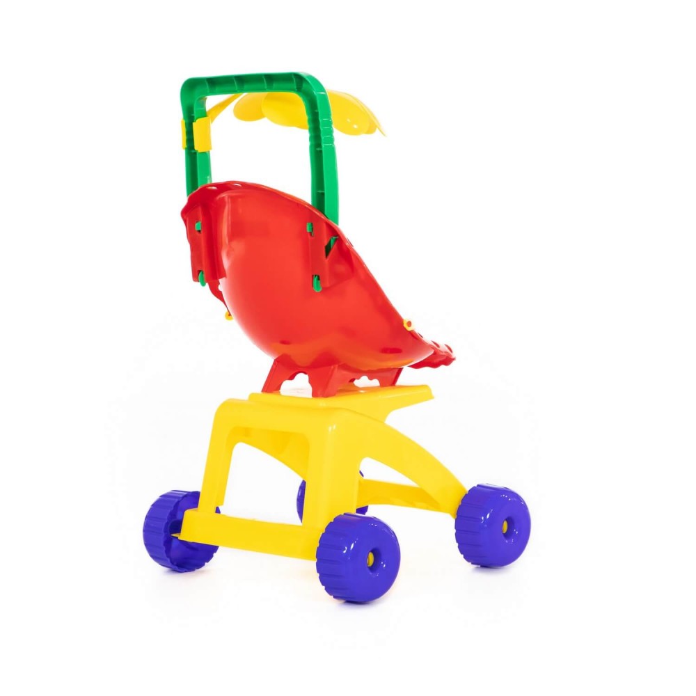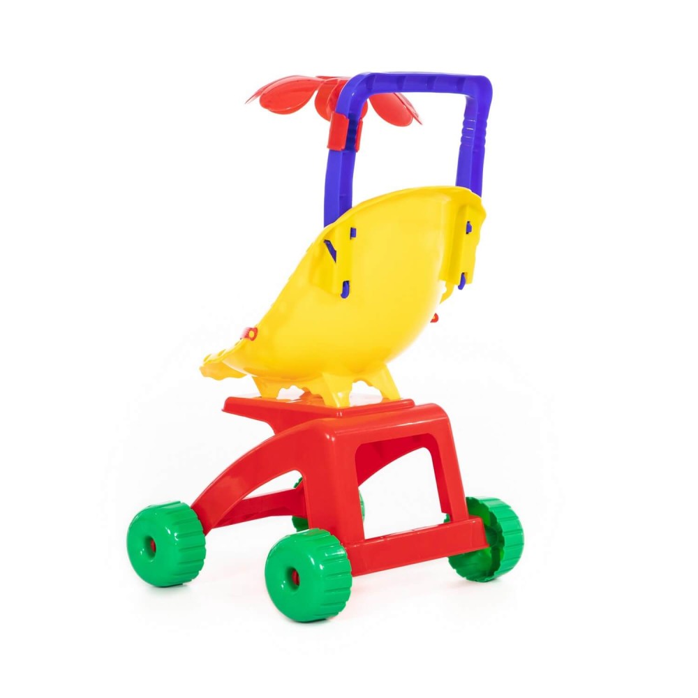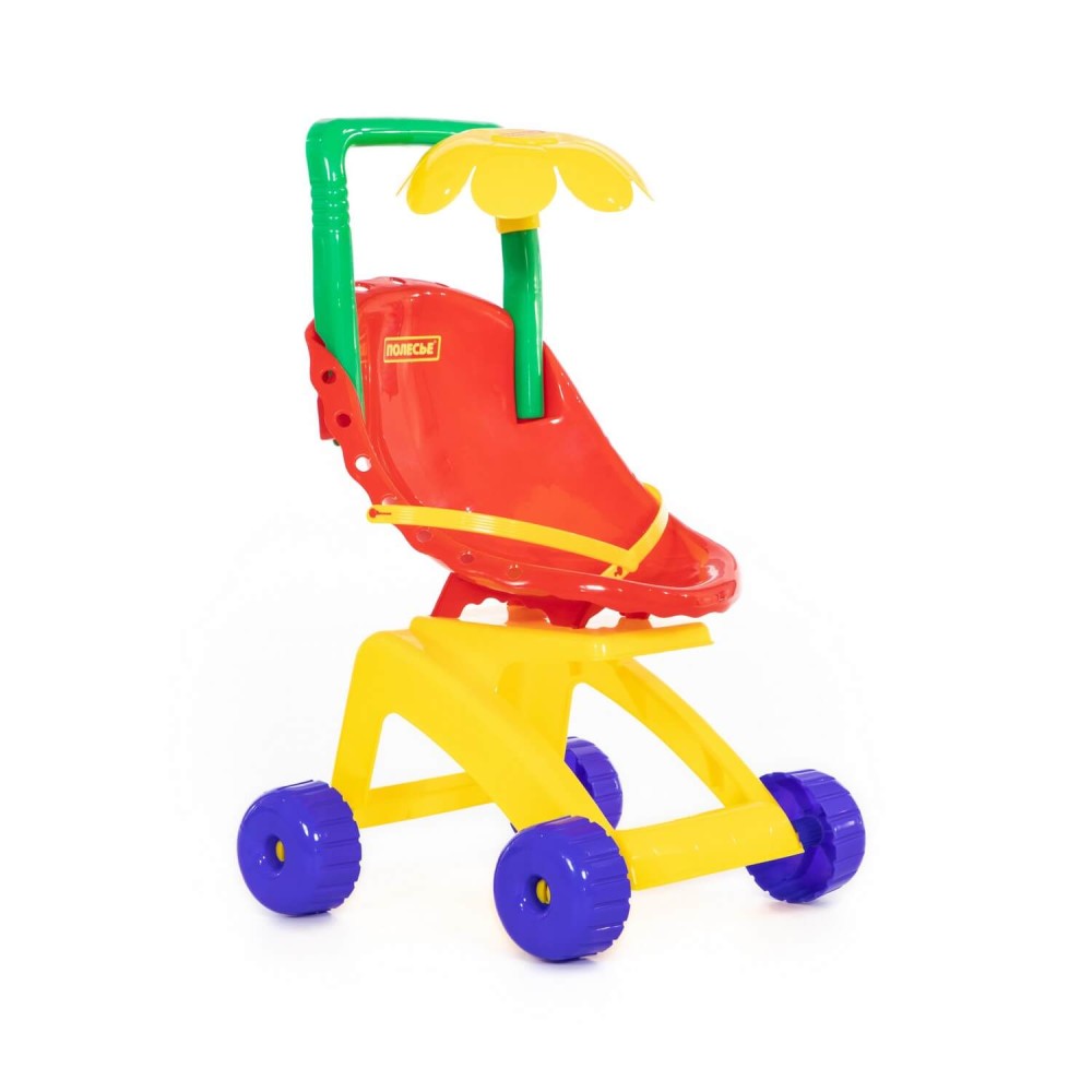 "Ромашка" - это коляска для кукол, пупсов, а также мягких друзей ребёнка. Пассажиров коляски можно пристегнуть ремешком. Коляска выполнена в базовых цветах, которые в первую очередь изучает ребенок, что способствует развитию у него цветовосприятия. Ещё интереснее игру с коляской сделает трещотка, установленная на колесе.