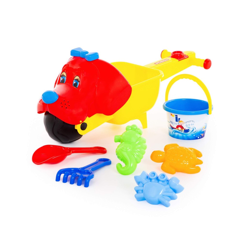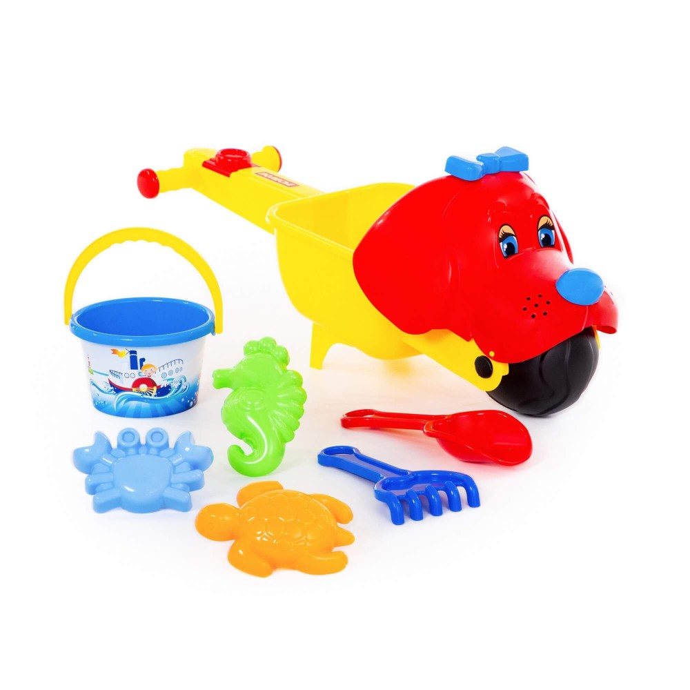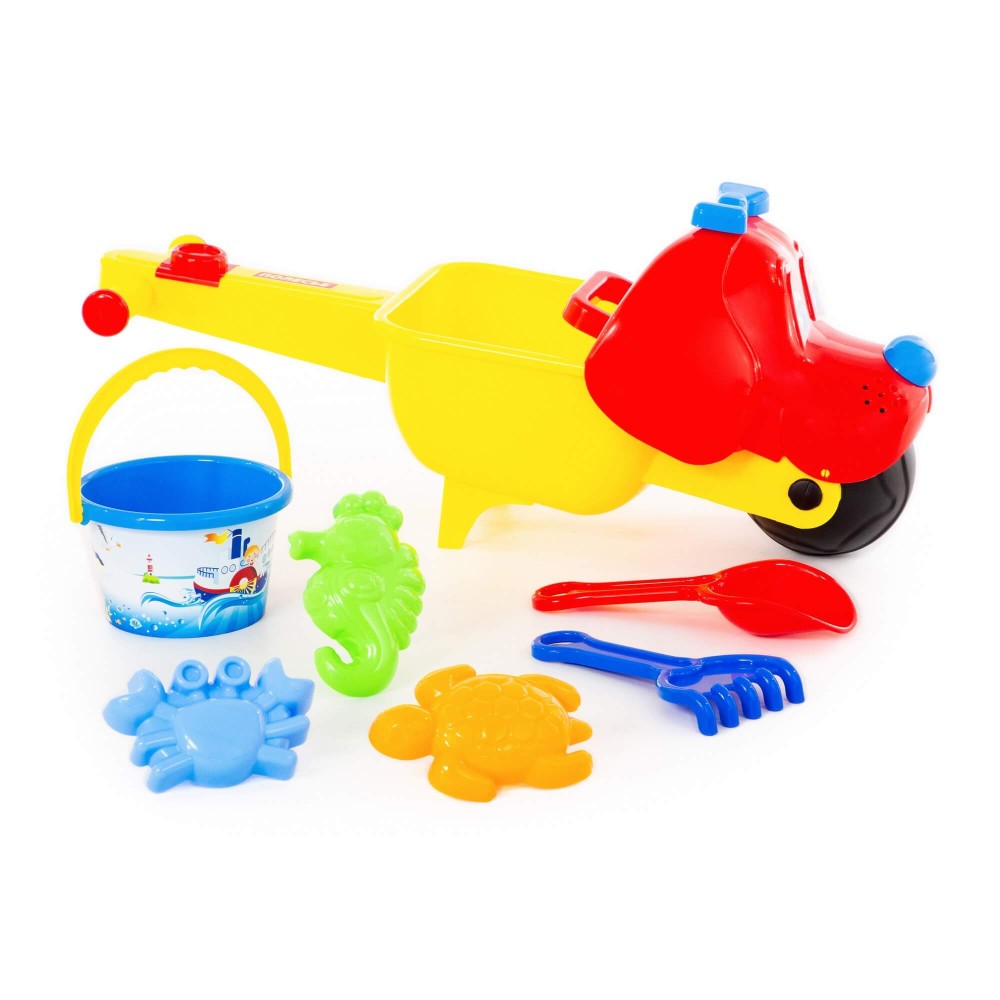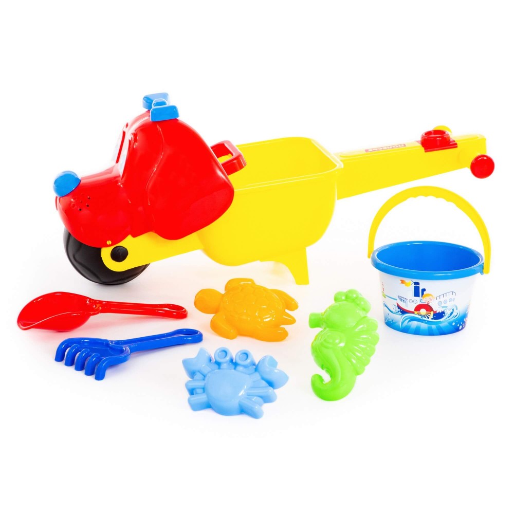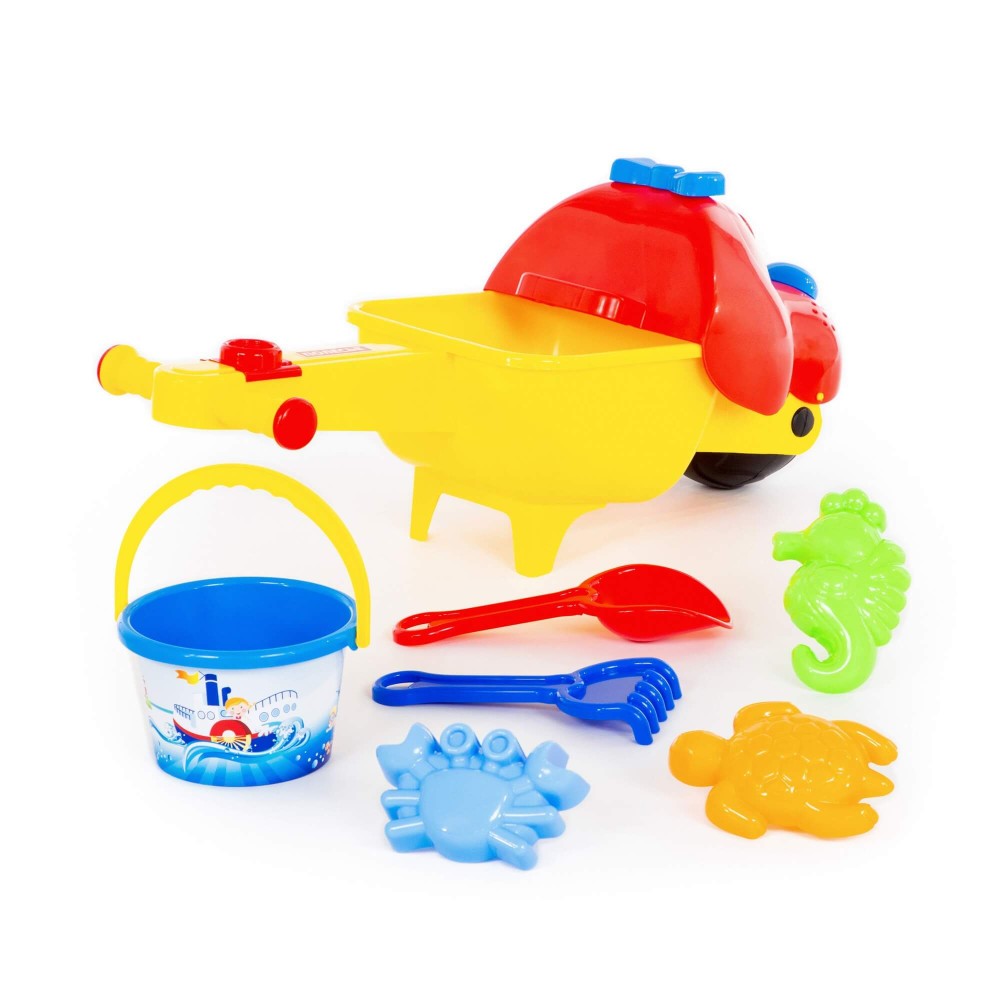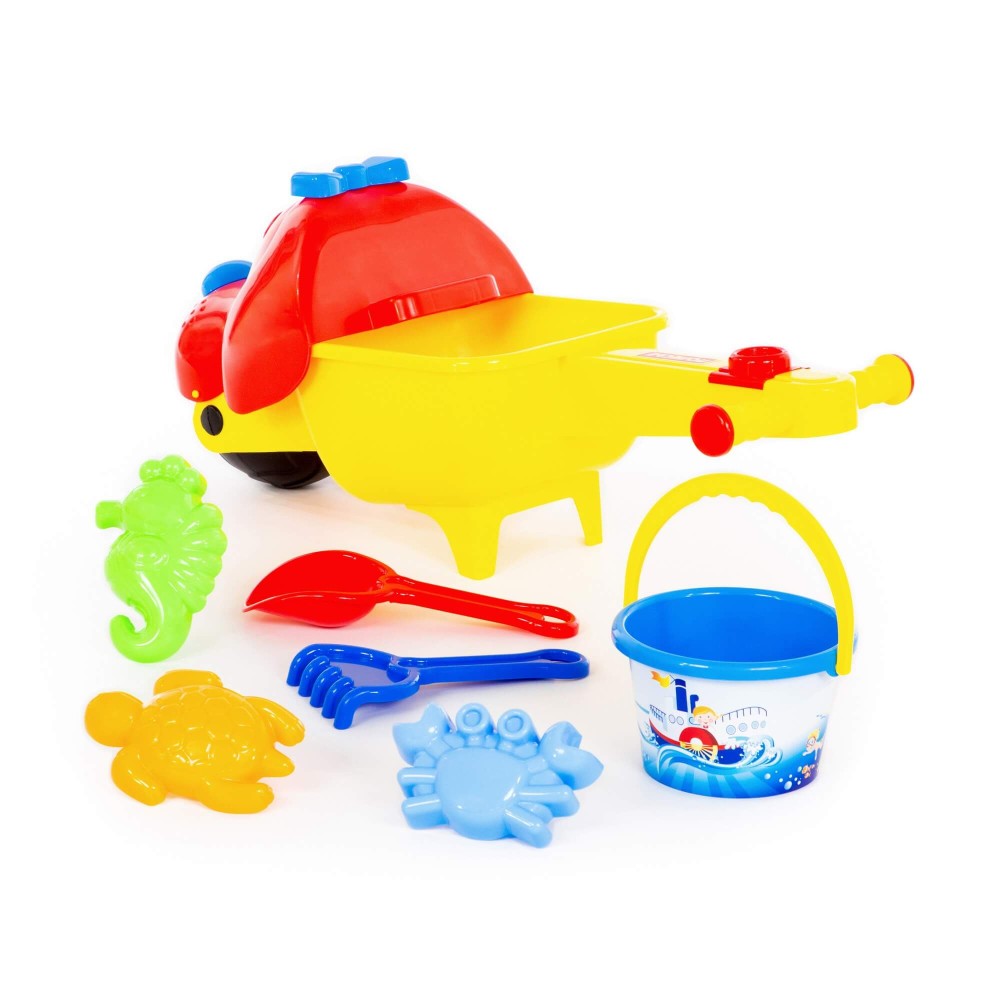 Тачка "Малыш Тяпа", ведро среднее с наклейкой, совок №10, грабли №10, формочки (краб №1 + черепаха + морской конёк)