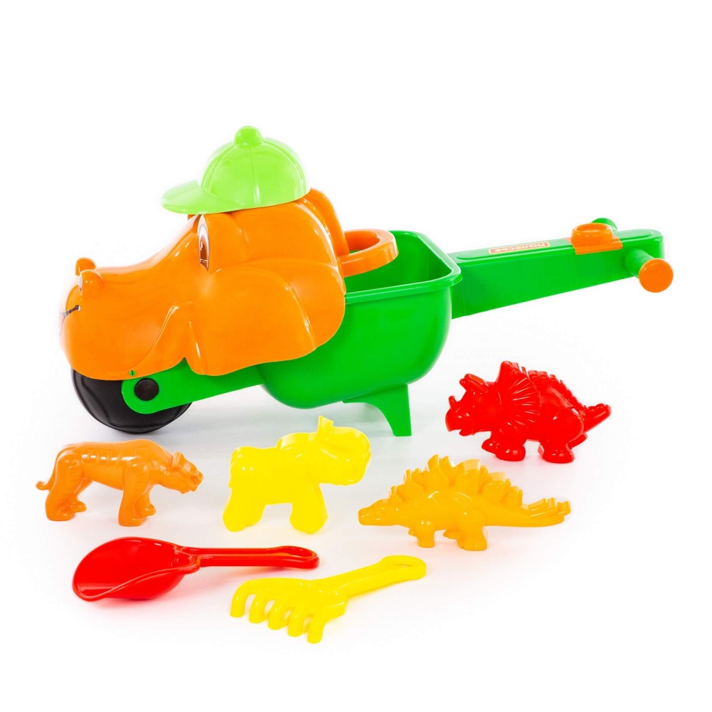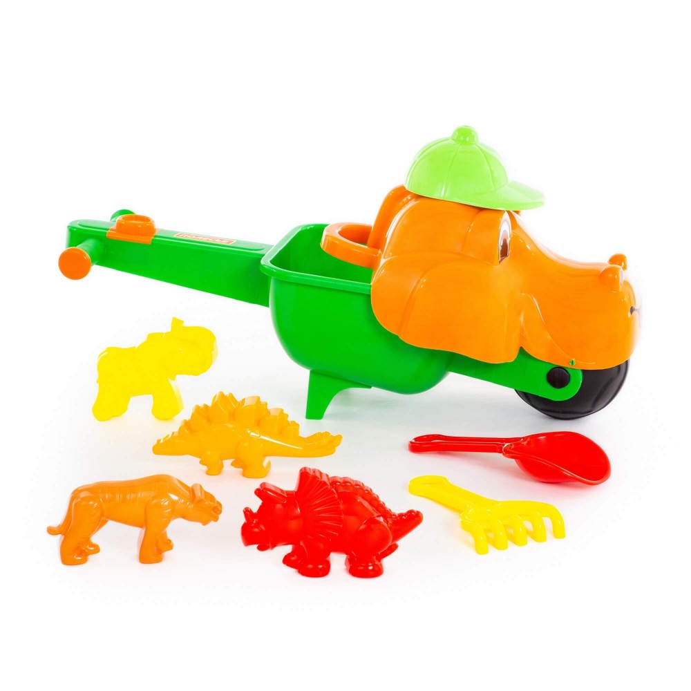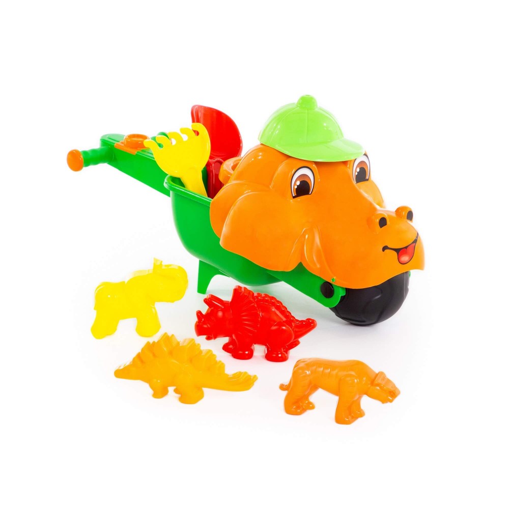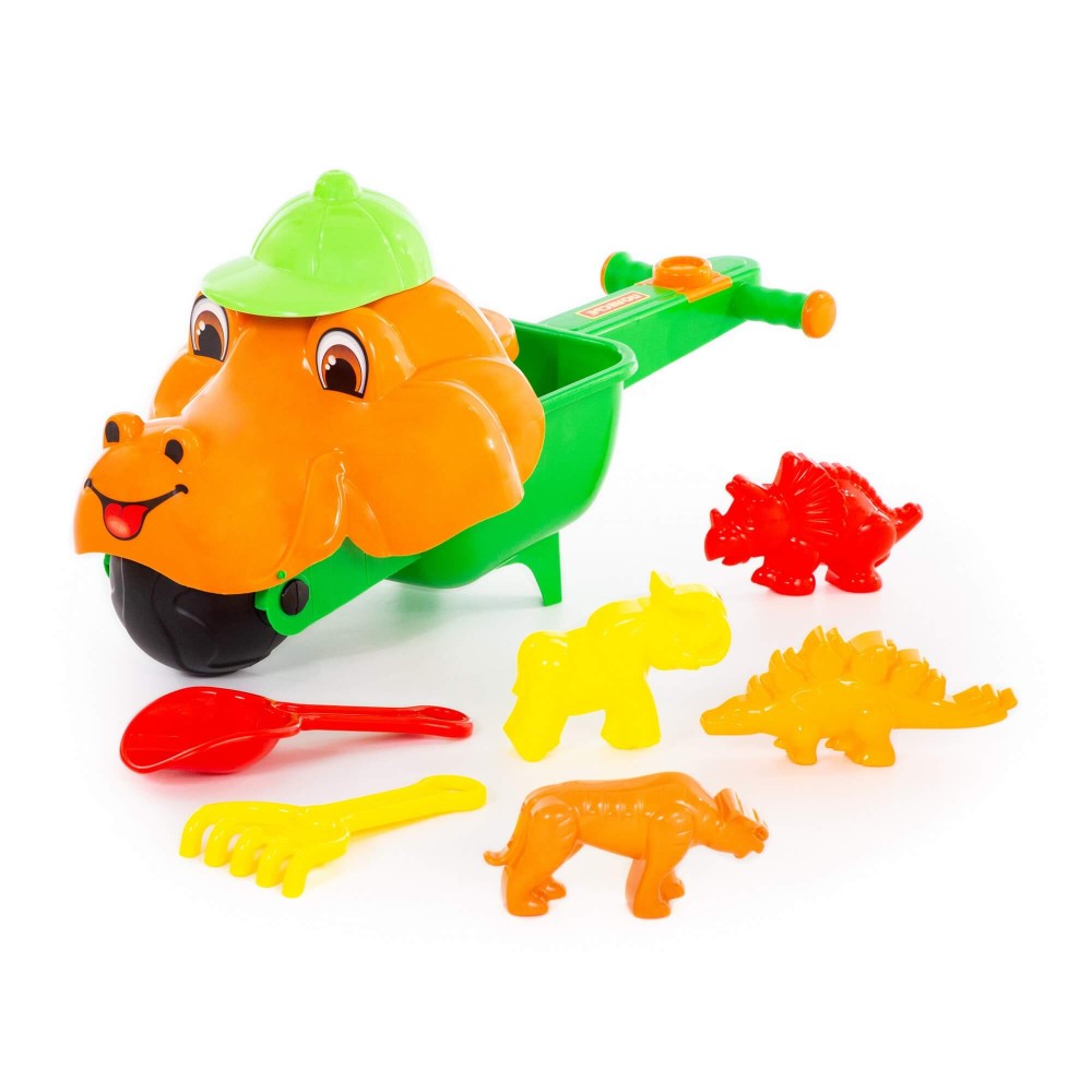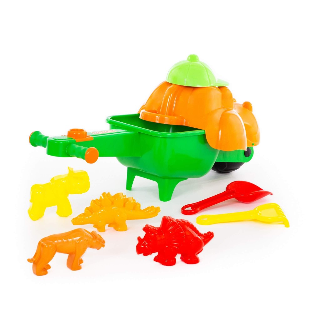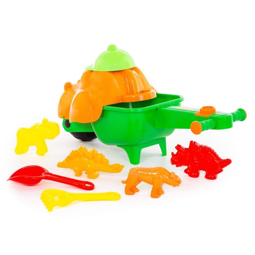 Тачка "Малыш Дин", совок №10, грабли №10, формочки (тигр + мамонт + динозавр №1 + динозавр №2)