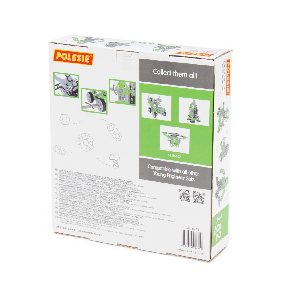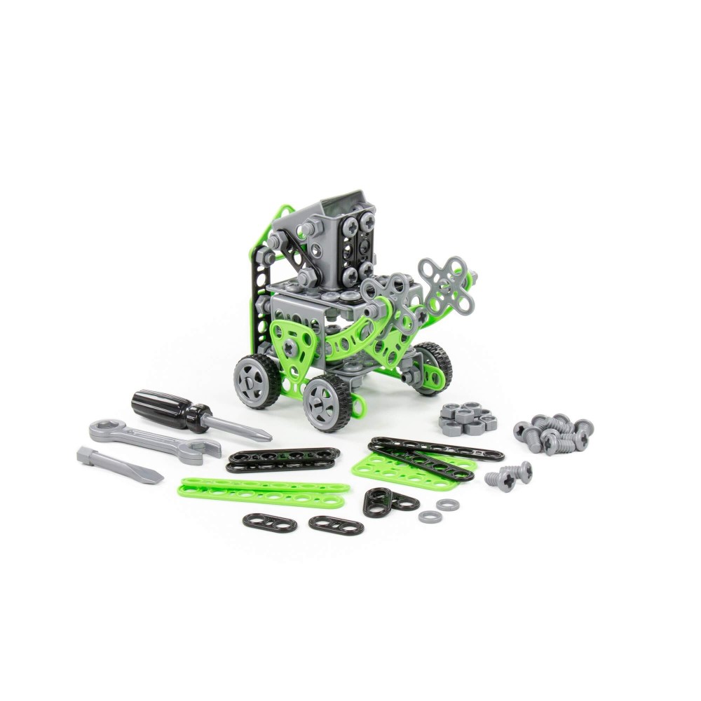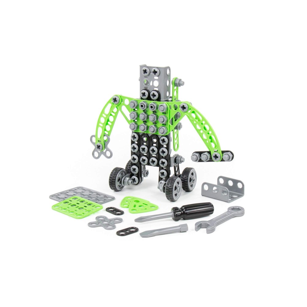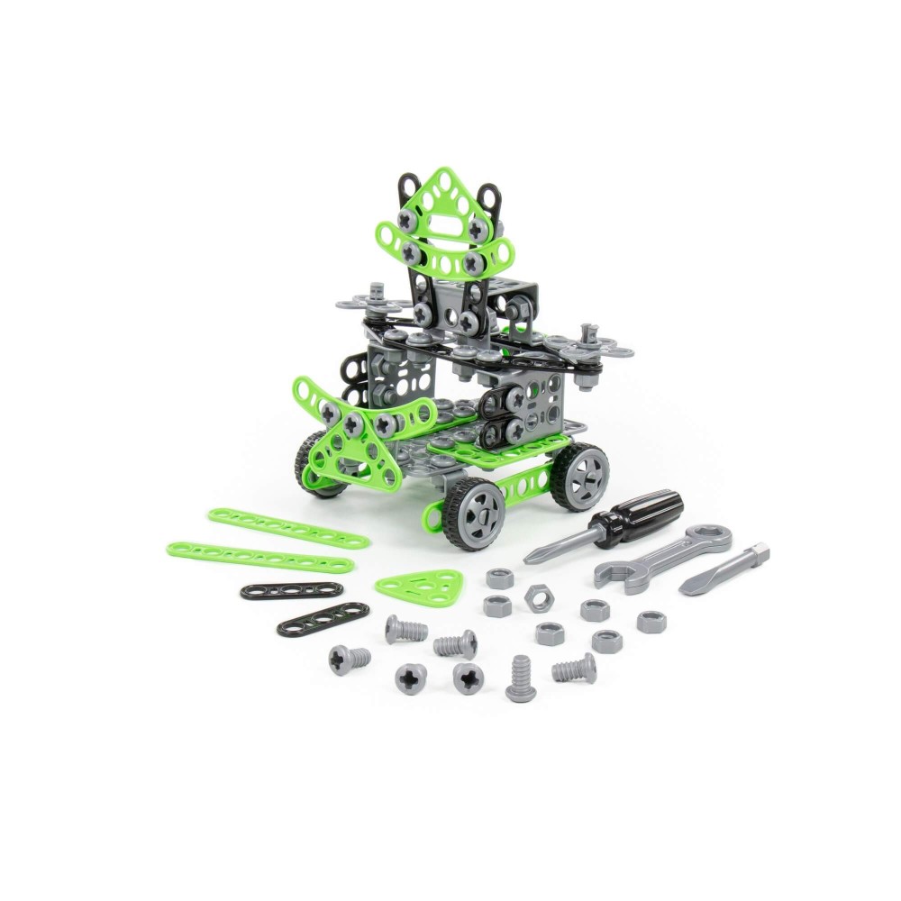 Конструктор «Изобретатель» (182 элемента) (в коробке) от фабрики «Полесье» создан специально для маленьких изобретателей. Элементы выполнены в виде планок с отверстиями. Планки соединяются между собой при помощи болтов и гаек. В комплект входит подробная инструкция, следуя которой можно создать модели, представленные на упаковке игрушки.
