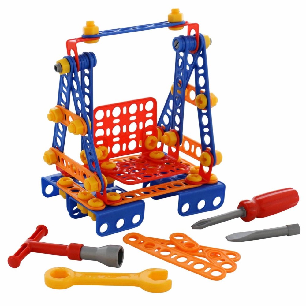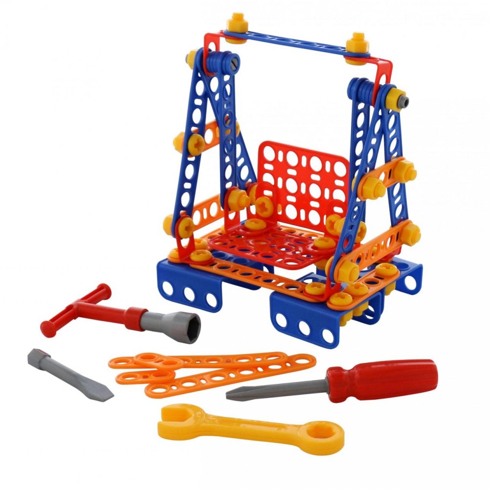 Конструктор «Изобретатель» — «Качели № 1» (109 элементов) от фабрики «Полесье» отличается особым функционалом. Элементы выполнены в виде планок, пазы которых соединяются при помощи болтов и гаек. В комплект конструктора входят подробные инструкции, следуя которым можно собрать модели, представленные на упаковке игрушки. При этом ребёнок будет развивать усидчивость и внимание. Игра с данной серией конструкторов не ограничивается сборкой моделей по инструкции, дети всегда могут попробовать создать что-то новое, используя свою фантазию, пространственное и ассоциативное мышление. Игры с конструктором могут определить будущую профессию малыша, раскрыв в нём творческий потенциал. Все конструкторы серии «Изобретатель» совершенно разные, поэтому из них можно собрать целую коллекцию, которая превратится в творческую мастерскую Вашего ребёнка!