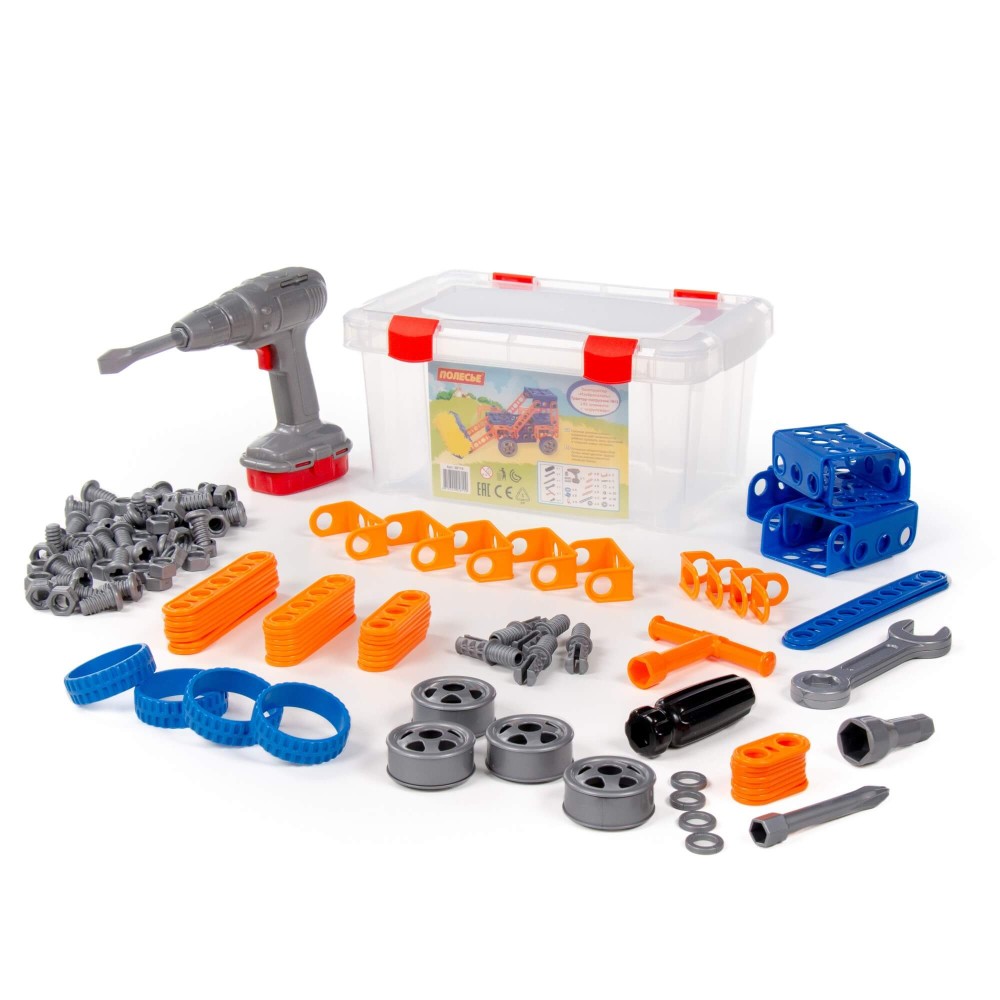 Конструктор «Изобретатель» — " Трактор-погрузчик № 1» (142 элемента) + шуруповёрт от фабрики «Полесье» отличается особым функционалом. Элементы выполнены в виде планок, пазы которых соединяются при помощи болтов и гаек. В комплект конструктора входят подробные инструкции, следуя которым можно собрать модели, представленные на упаковке игрушки. При этом ребёнок будет развивать усидчивость и внимание. Игра с данной серией конструкторов не ограничивается сборкой моделей по инструкции, дети всегда могут попробовать создать что-то новое, используя свою фантазию, пространственное и ассоциативное мышление. В комплекте с конструктором идёт реалистичный шуруповёрт, работающий от батареек. Игры с конструктором могут определить будущую профессию малыша, раскрыв в нём творческий потенциал. Все конструкторы серии «Изобретатель» совершенно разные, поэтому из них можно собрать целую коллекцию, которая превратится в творческую мастерскую Вашего ребёнка!