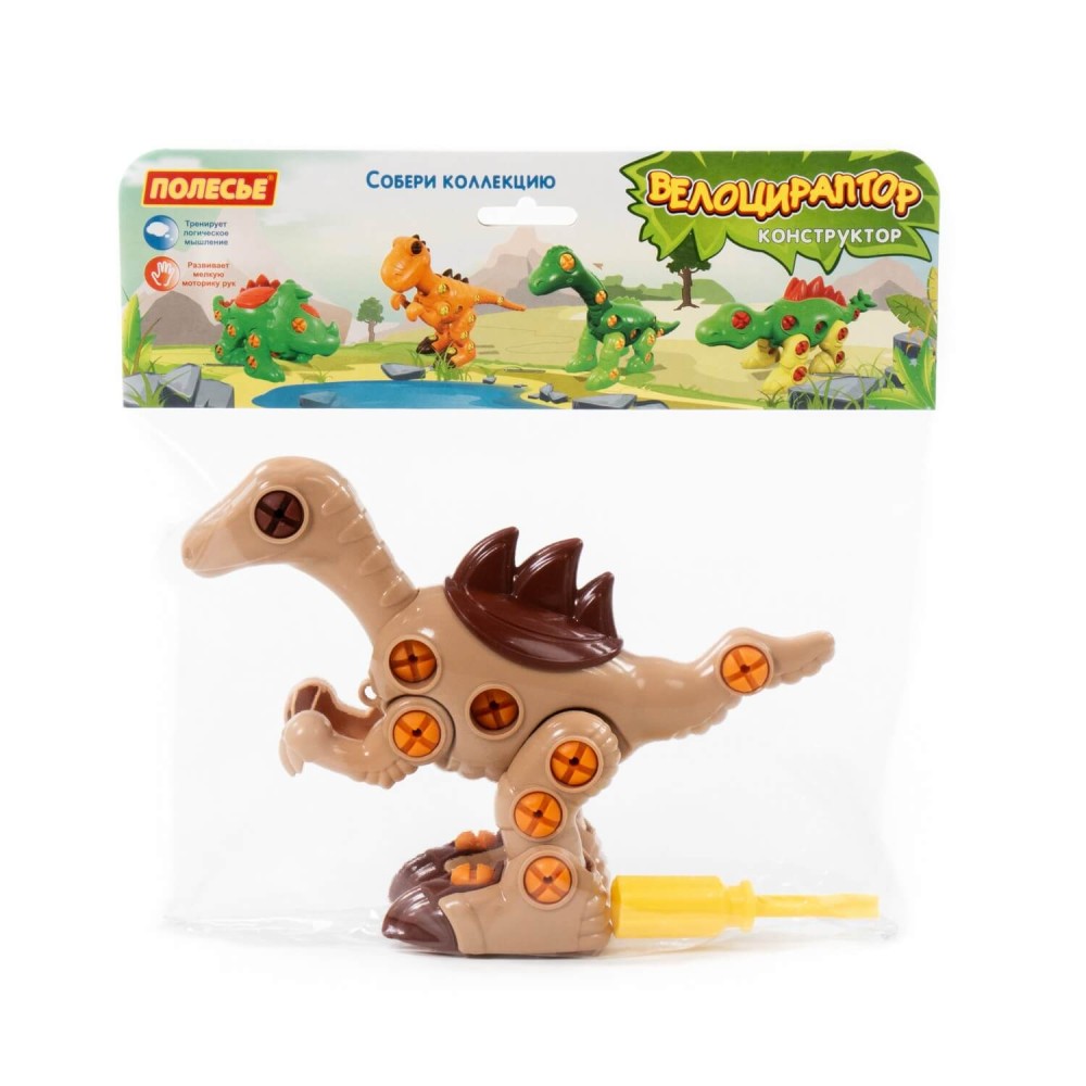 Фабрика «Полесье» предлагает детям стать маленькими палеонтологами и представляет серию конструкторов в виде динозавров. Мальчики и девочки познакомятся с "Тираннозавром", "Стегозавром", "Трицератопсом", "Диплодоком", "Велоцираптором". Игрушка выполнена в ярких цветах, из качественного материала, имеет округлую форму. Все элементы представлены в виде конструктора, который соединяется с помощью пластмассовых шурупов. В набор включена крестообразная отвёртка. Этот инструмент сделает игру интереснее и позволит разбирать\ собирать динозавров. Игра с таким конструктором знакомит ребёнка с древним миром животных. А также развивает фантазию, учит моделированию и конструированию.