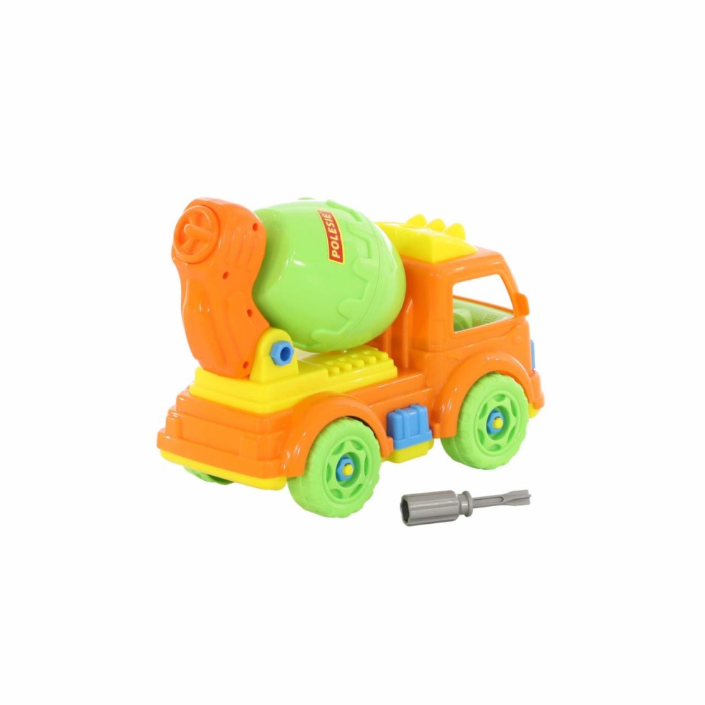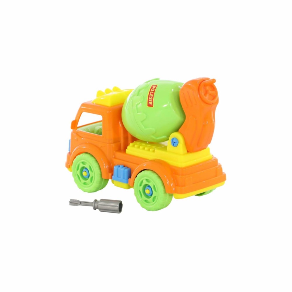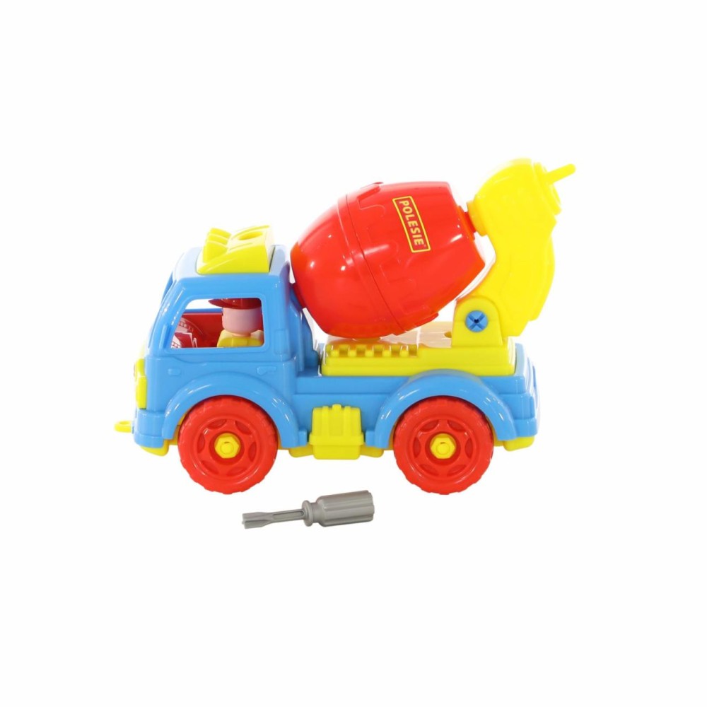 Для самых любопытных малышей, которые хотят поближе познакомиться с разными видами транспорта фабрика «Полесье» представляет — конструктор-транспорт «Автомобиль-бетоновоз». Игрушка выполнена в ярких цветах, из качественного материала, имеет округлую форму. Все элементы бетоновоза представлены в виде конструктора, который соединяется с помощью пластмассовых шурупов. В наборе также идёт крестообразная отвёртка, которая разнообразит игру, сделает её еще интереснее, позволяя без труда разбирать и собирать автомобиль. Игра с таким конструктором знакомит ребёнка с первыми навыками моделирования и конструирования, а также развивает фантазию.