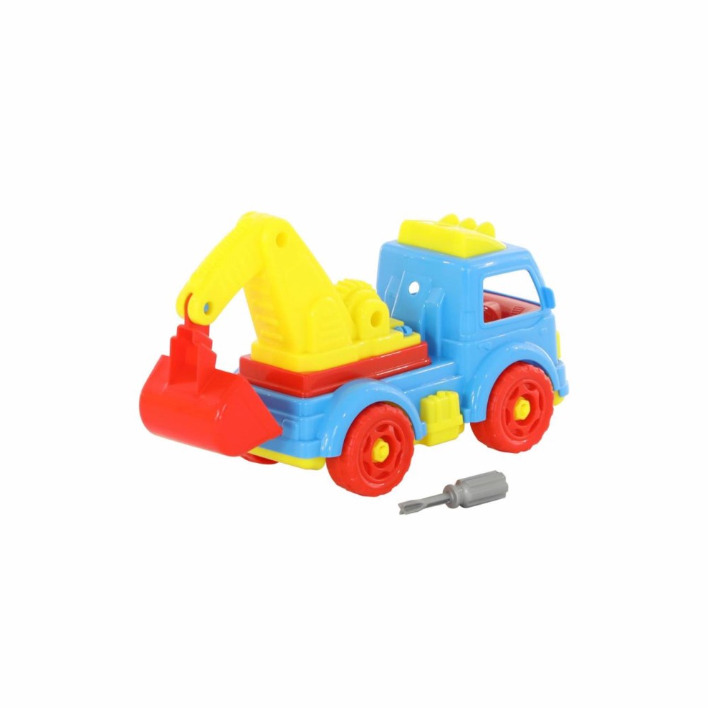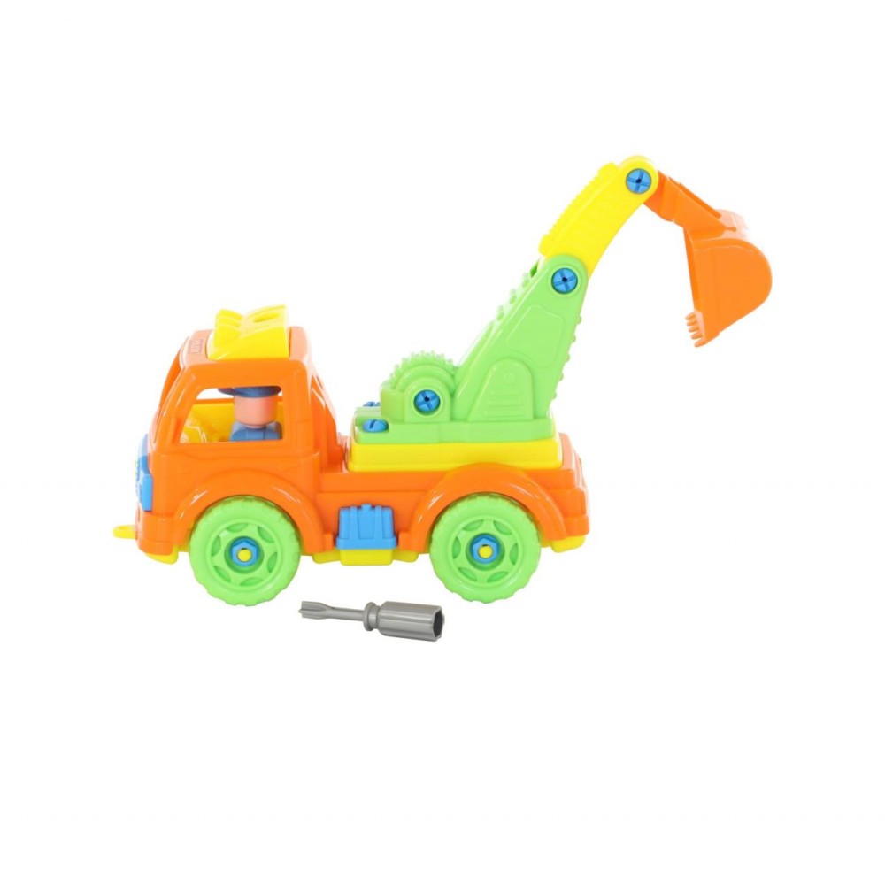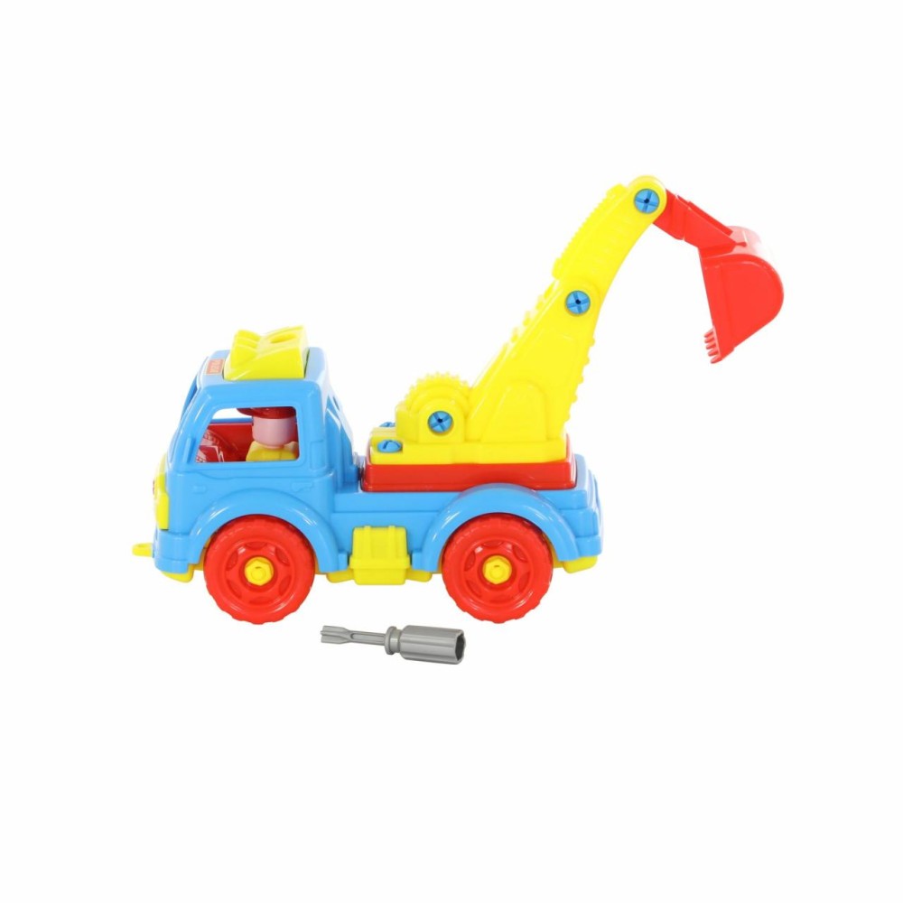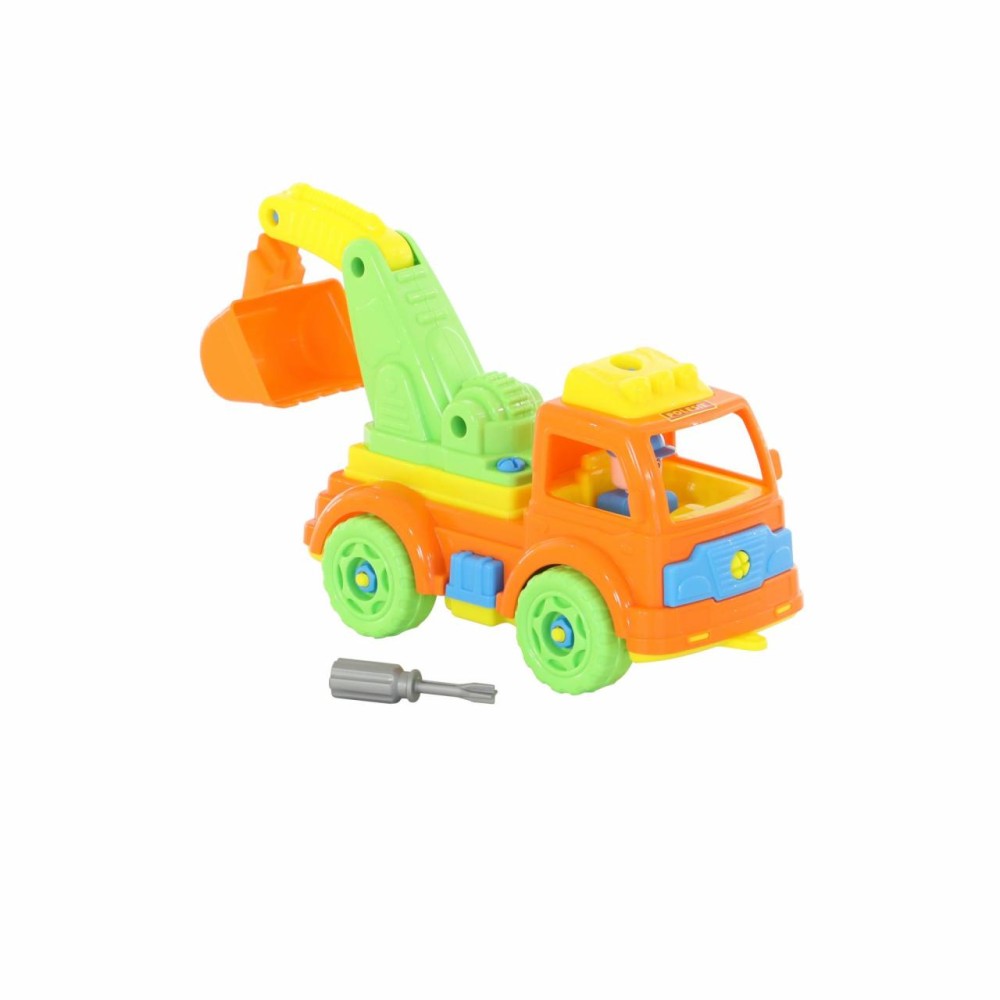 Для самых любопытных малышей, которые хотят поближе познакомиться с разными видами транспорта, фабрика «Полесье» представляет конструктор-транспорт "Автомобиль-экскаватор". Игрушка выполнена в ярких цветах, из качественного материала, имеет округлую форму. Все элементы экскаватора представлены в виде конструктора, который соединяется с помощью пластмассовых шурупов. В наборе также идёт крестообразная отвёртка, которая разнообразит игру, сделает её еще интереснее, позволяя без труда разбирать и собирать экскаватор. Игра с таким конструктором знакомит ребёнка с первыми навыками моделирования и конструирования, а также развивает фантазию.