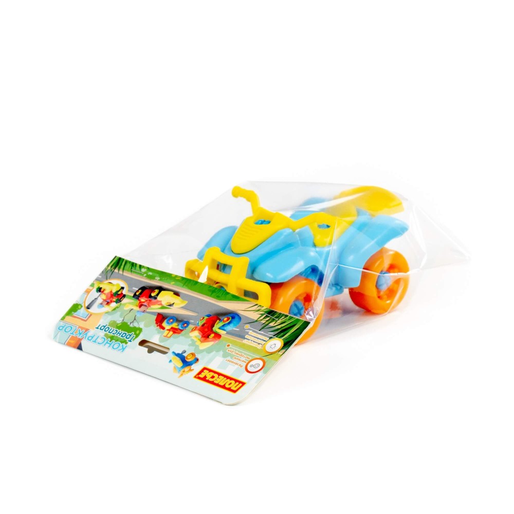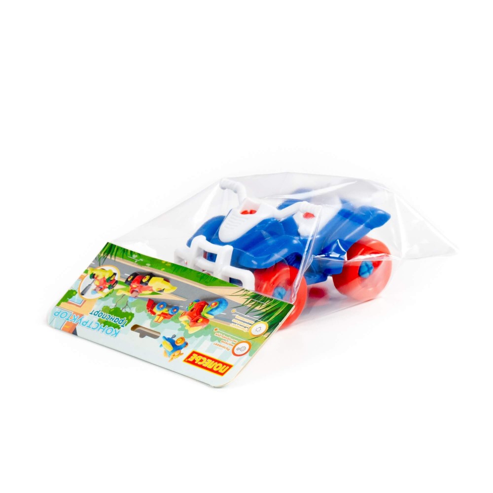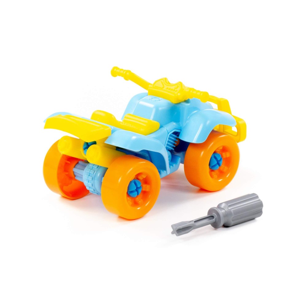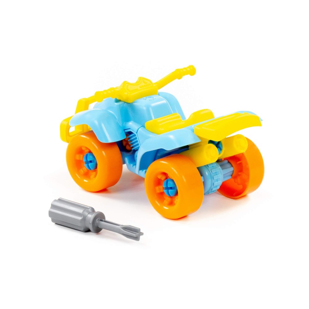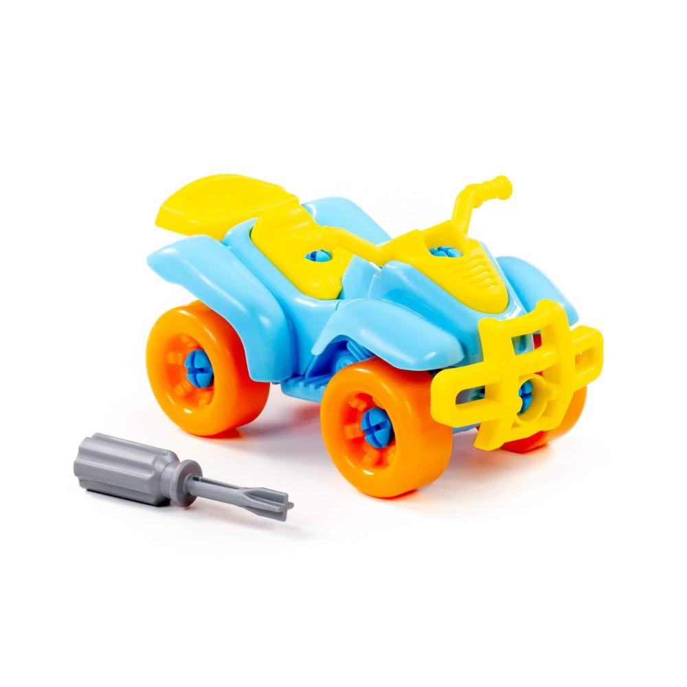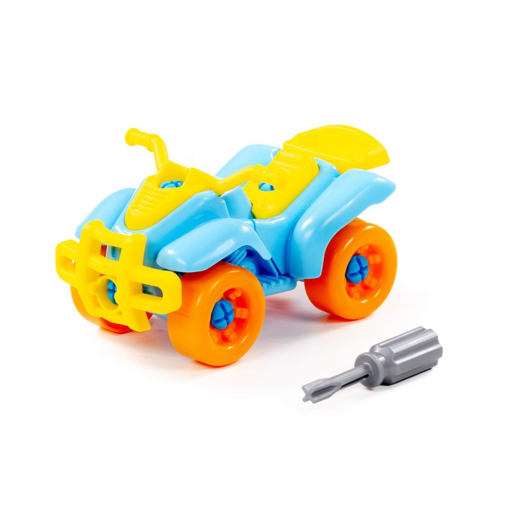 Для самых любопытных малышей, которые хотят поближе познакомиться с разными видами транспорта, фабрика «Полесье» представляет конструктор-транспорт "Квадроцикл". Игрушка выполнена в ярких цветах, из качественного материала, имеет округлую форму. Все элементы квадроцикла представлены в виде конструктора, который соединяется с помощью пластмассовых шурупов. В наборе также идёт крестообразная отвёртка, которая разнообразит игру, сделает её еще интереснее, позволяя без труда разбирать и собирать вертолёт. Игра с таким конструктором знакомит ребёнка с первыми навыками моделирования и конструирования, а также развивает фантазию.
