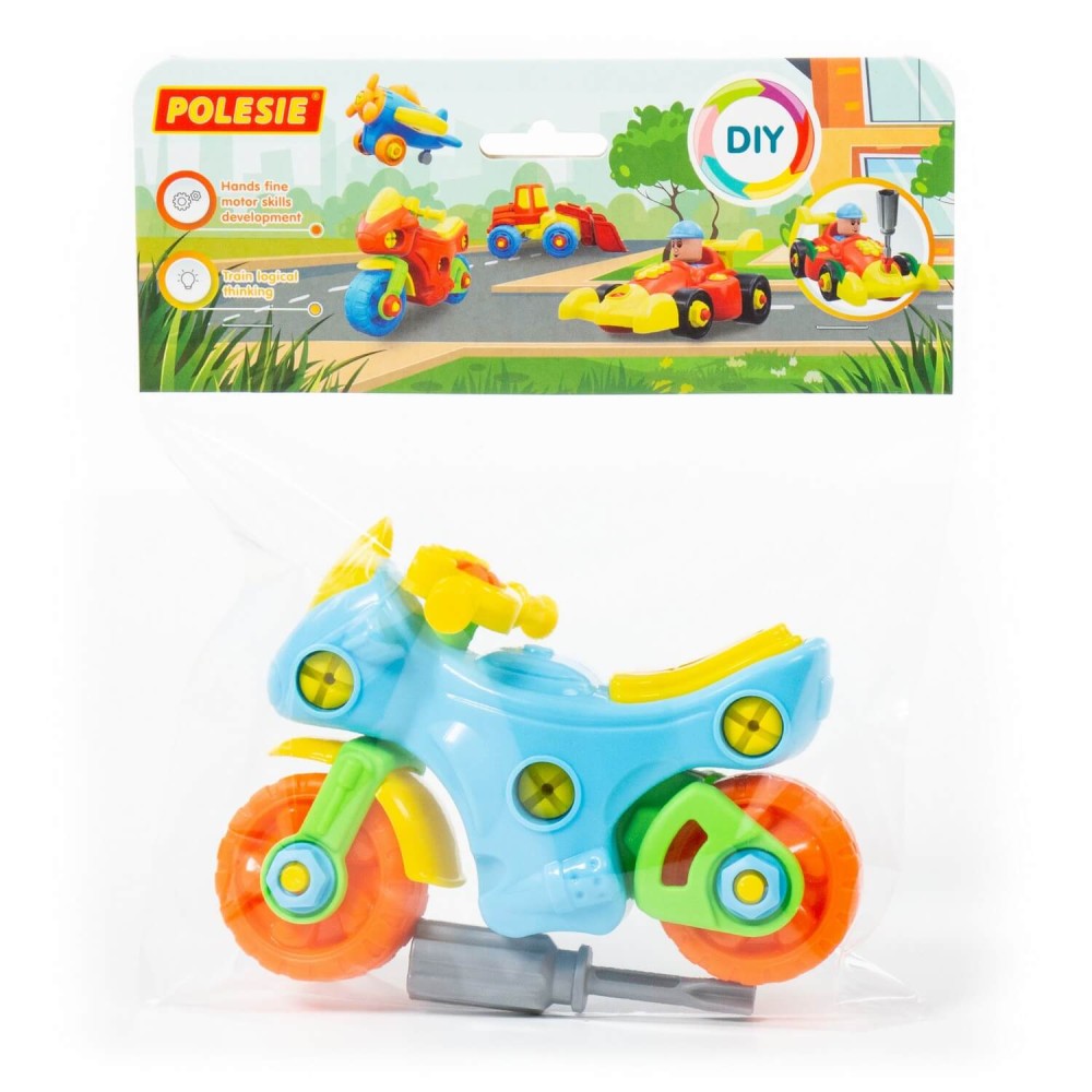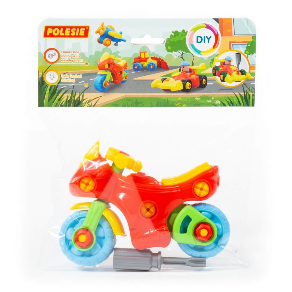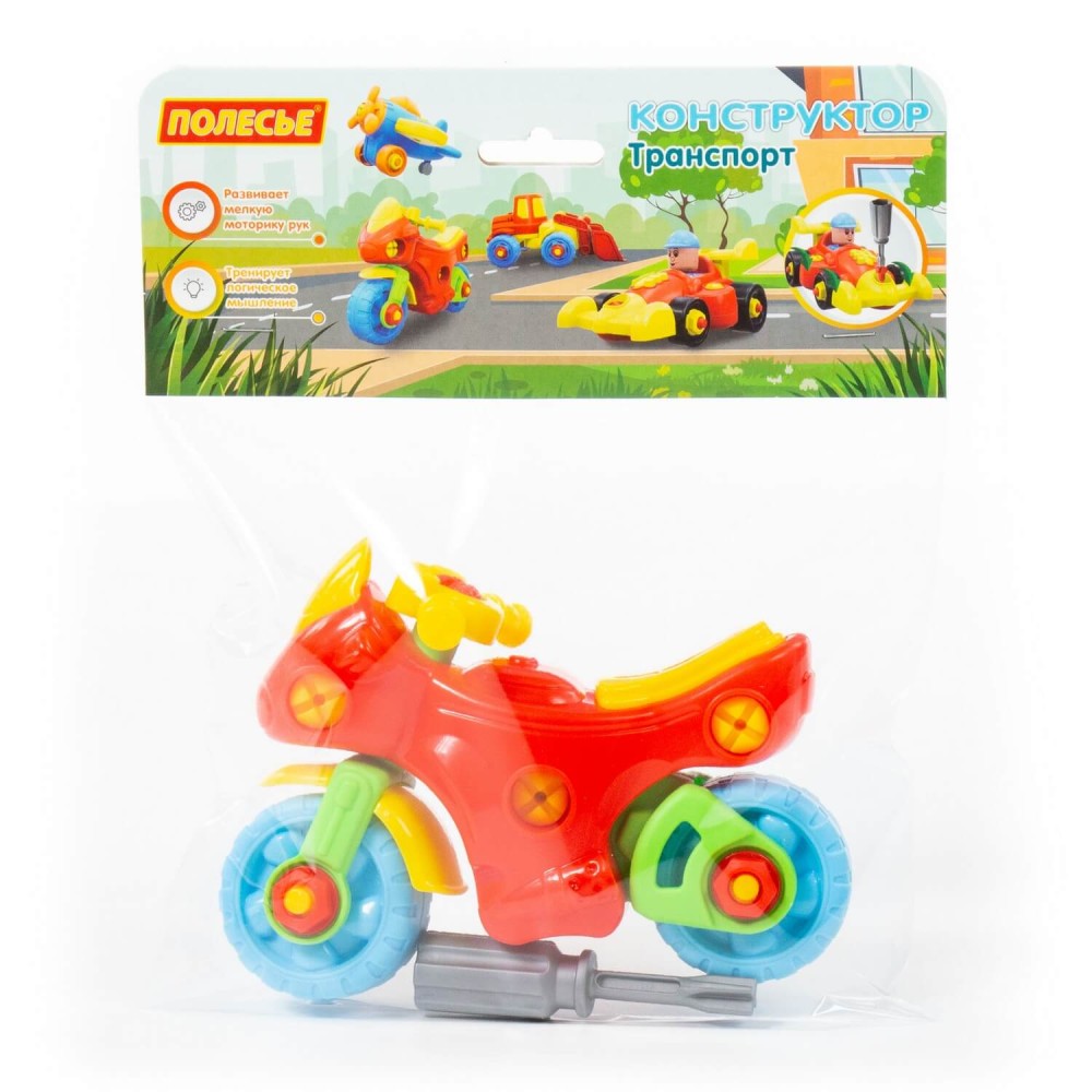 Для самых любопытных малышей, которые хотят поближе познакомиться с разными видами транспорта, фабрика «Полесье» представляет конструктор-транспорт "Мотоцикл". Игрушка выполнена в ярких цветах, из качественного материала, имеет округлую форму. Все элементы мотоцикла представлены в виде конструктора, который соединяется с помощью пластмассовых шурупов. В наборе также идёт крестообразная отвёртка, которая разнообразит игру, сделает её еще интереснее, позволяя без труда разбирать и собирать вертолёт. Игра с таким конструктором знакомит ребёнка с первыми навыками моделирования и конструирования, а также развивает фантазию.