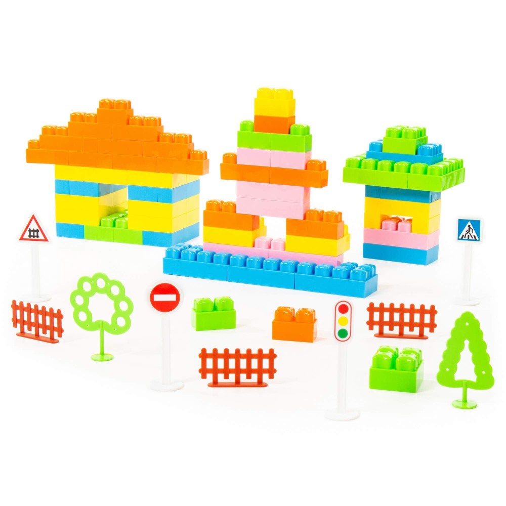 Конструкторы серии «Малютка» от фабрики «Полесье» созданы специально для маленьких архитекторов. Кубики имеют необычную форму, со сглаженными углами, поэтому являются безопасными. Все элементы конструктора имеют яркую запоминающуюся окраску, так ребёнок ещё и изучает цвета. В данный набор входят фигурки деревьев, элементы обустройства улицы, поэтому малыш может строить целые города! В процессе сборки конструктора у детей развивается мелкая моторика рук, фантазия, творческие способности, логическое мышление. Все детали компактно упакованы в контейнер, что удобно для хранения и перемещения конструктора.