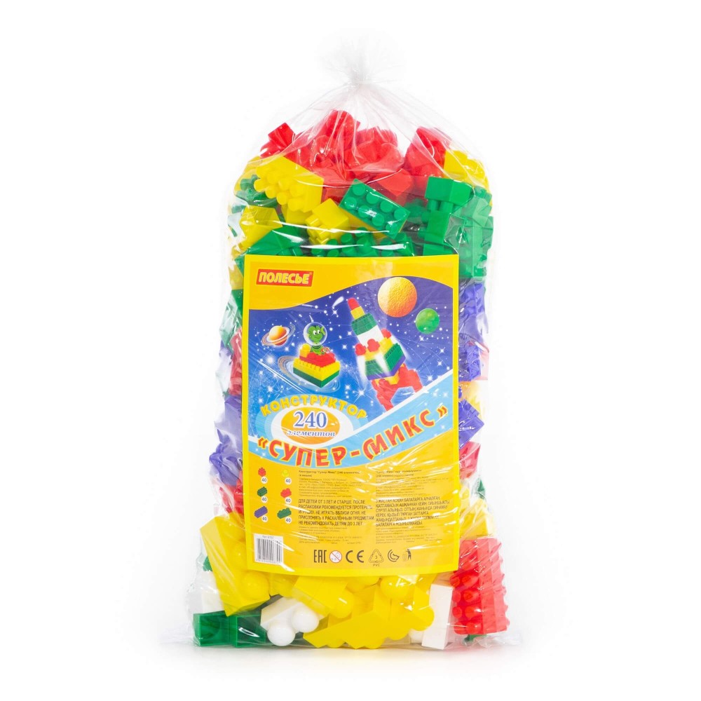 Компания «Полесье» производит широкий выбор развивающих конструкторов. В набор Супер-Микс входят блоки двух видов, поэтому строить крепости и домики могут даже малыши. У ребёнка формируется понимание, что предметы бывают разных цветов, размеров и форм. Одновременно развиваются пространственное мышление, воображение, мелкая моторика рук.