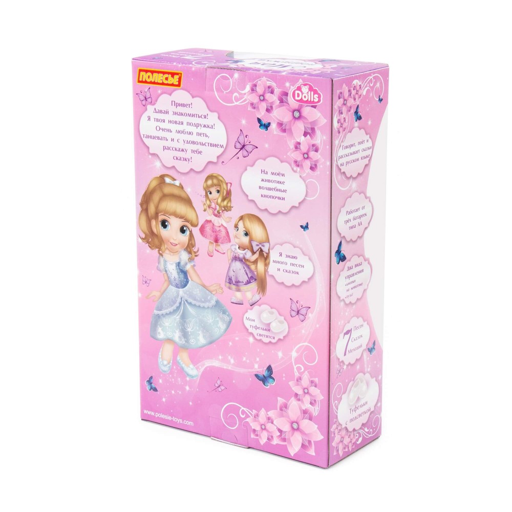 Кукла "Арина" (37 см) на прогулке (в коробке) умеет: говорить и петь на русском языке, повторять слова, рассказывать сказки, ходить, танцевать и слушать музыку. Кроме того, туфельки "подружки" имеют подсветку. Кукла знает 7 сказок: «Колобок», «Репка», «Курочка Ряба», «Лисичка-сестричка», «Теремок», «Коза-дереза», «Лиса и журавль». Кукла исполняет 7 песен: