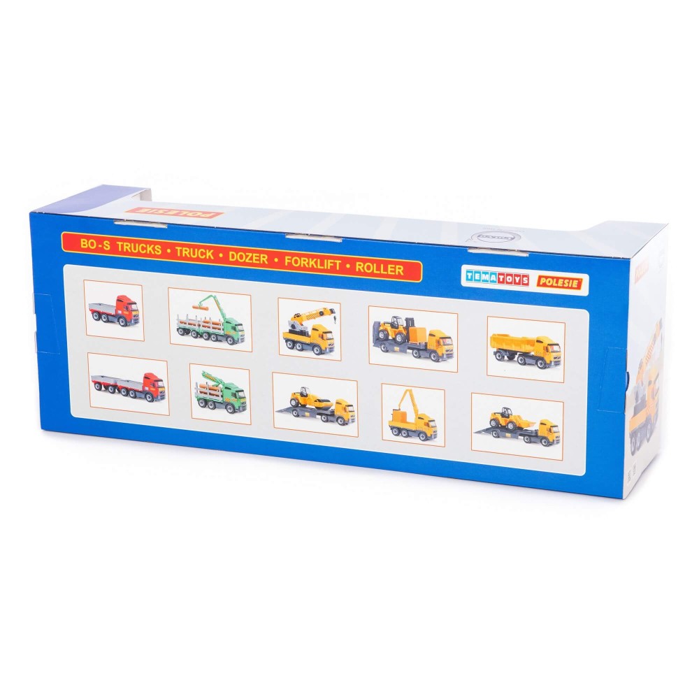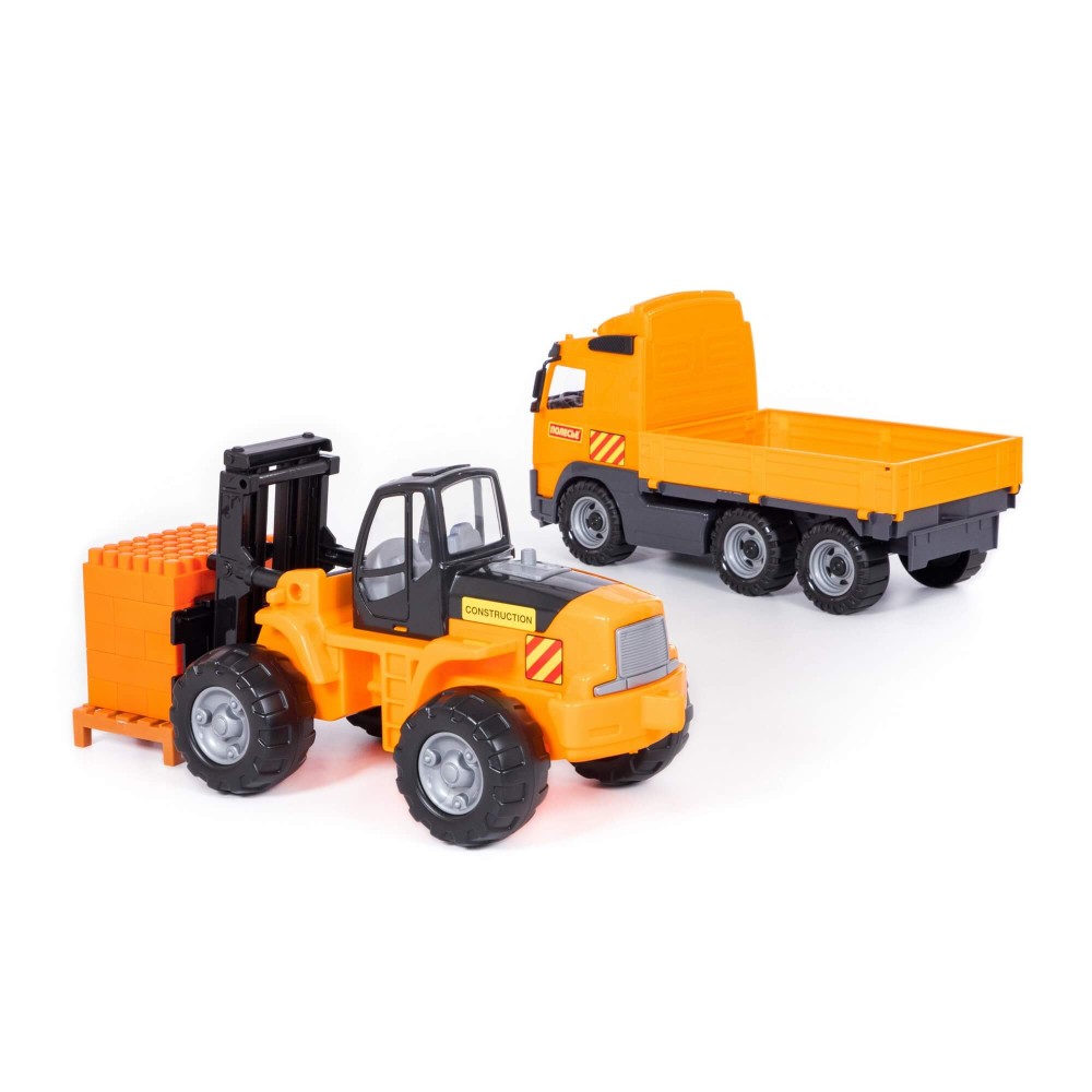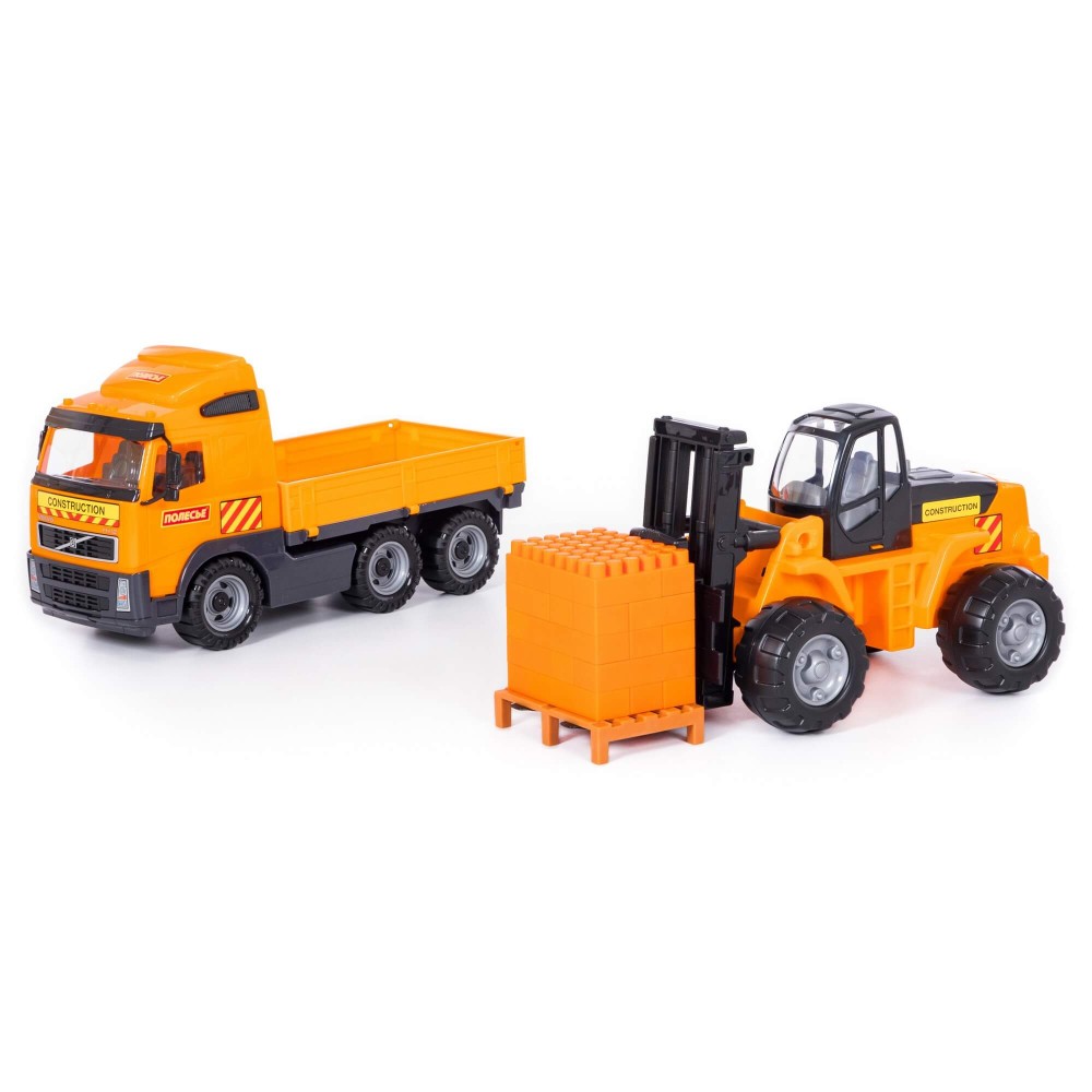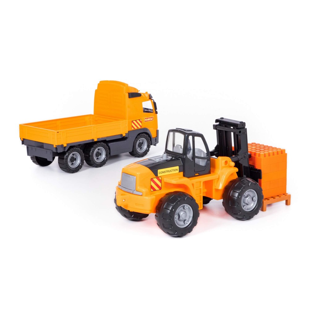 В одной упаковке — 3 игрушки! Это автомобиль бортовой, автокар и конструктор «Супер-Микс». Внешний вид техники приближен к дизайну прототипов. Все элементы выполнены из прочного, качественного пластика. Борта автомобиля снимаются, что позволяет перевозить более габаритные грузы. В набор входят: автокар — трактор для погрузки грузов на поддонах, — и конструктор из 30 элементов-кирпичиков. С таким комплектом можно разыгрывать различные сценарии, моделировать, строить, развивать фантазию и конструкторские способности. Также дети больше узнают о большегрузной технике и её функционале.